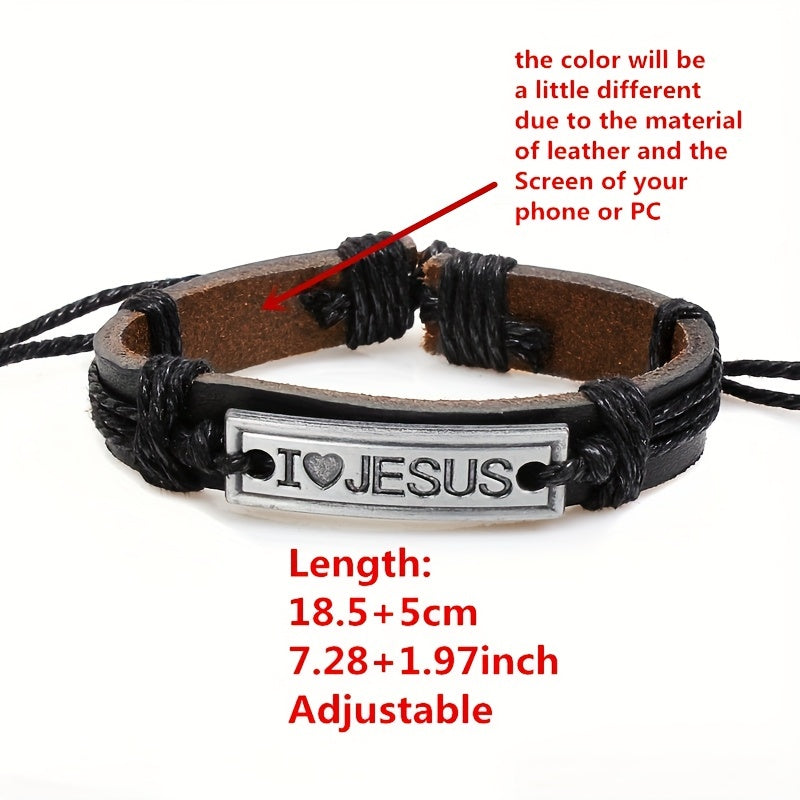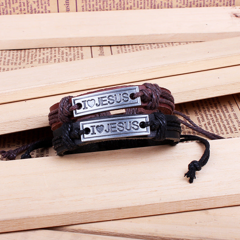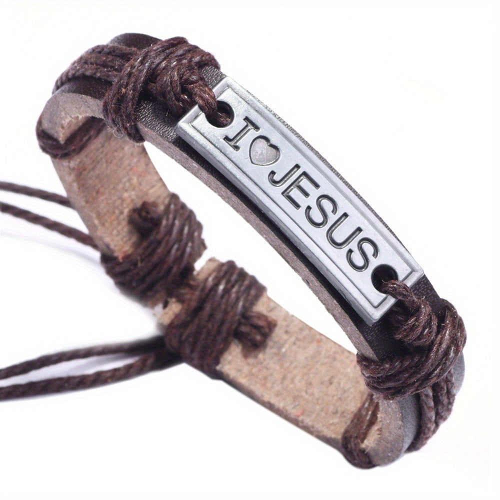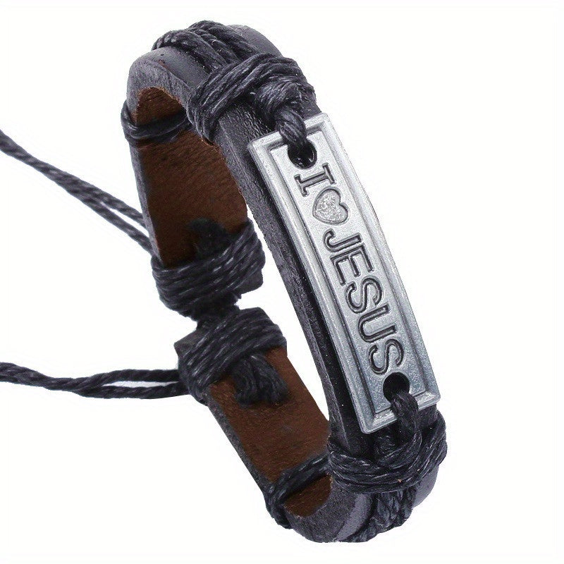 This stylish vintage braided leather bracelet features an alloy English letter 'Jesus' charm. Made from high-quality cowhide, this bracelet is a fashionable and meaningful accessory.