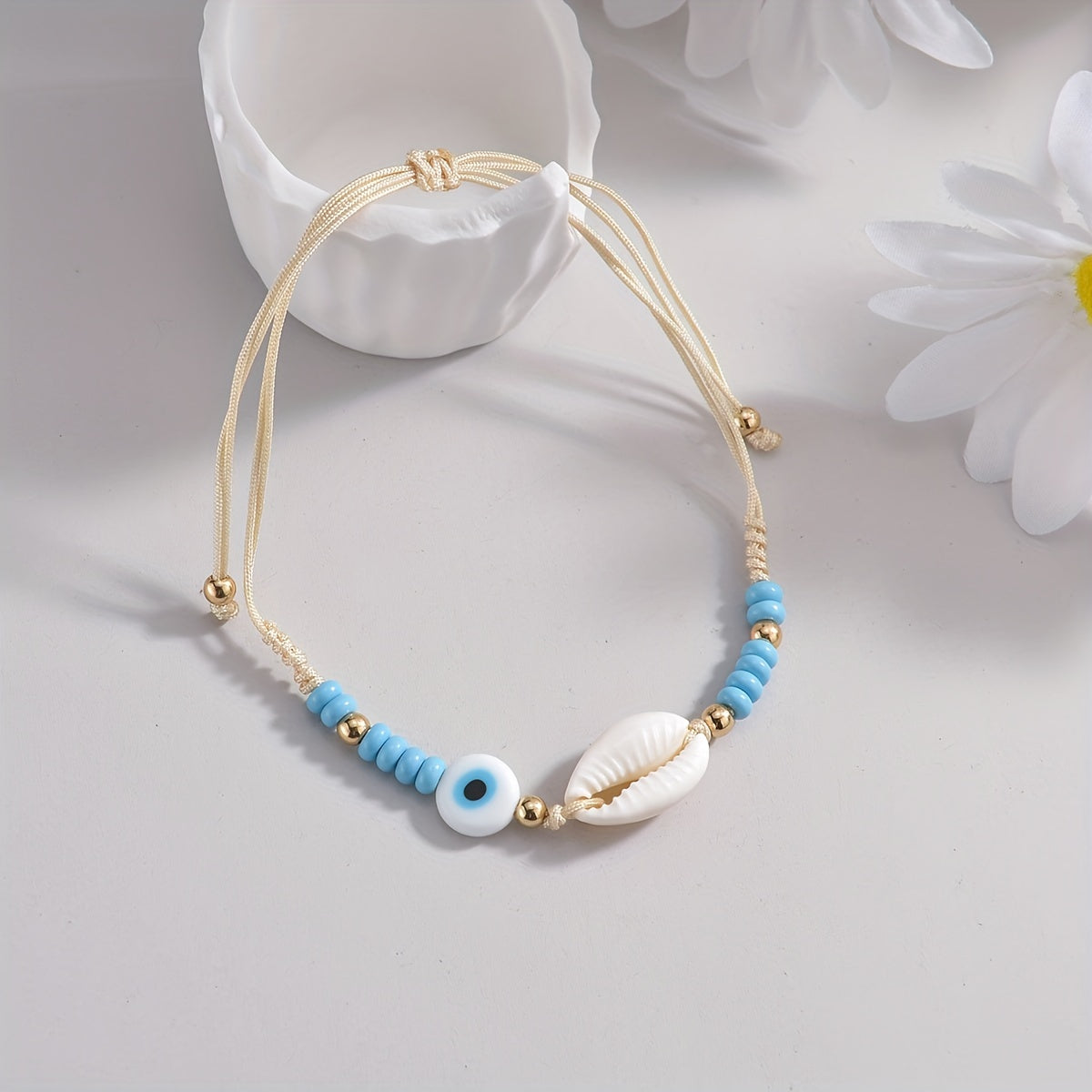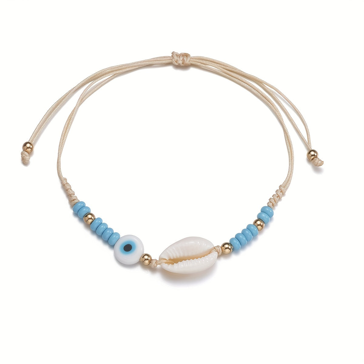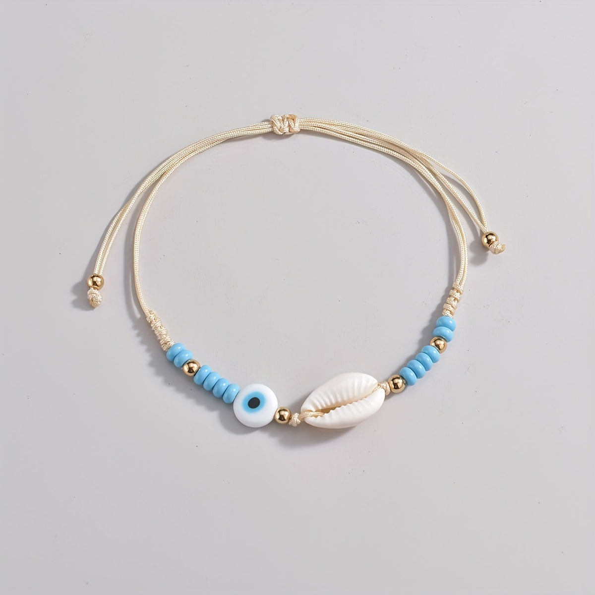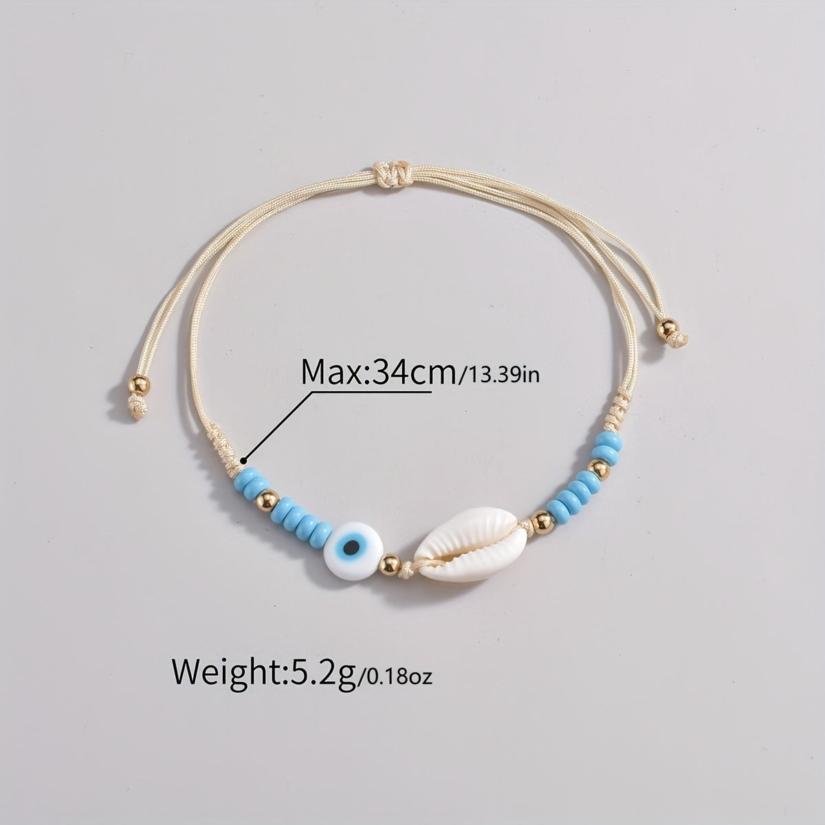 This ankle bracelet features waterproof wax thread with devil's eye shape beads, shell shape beads, and mini rice beads for a stylish ocean-inspired look. Perfect for beach days or casual wear.
