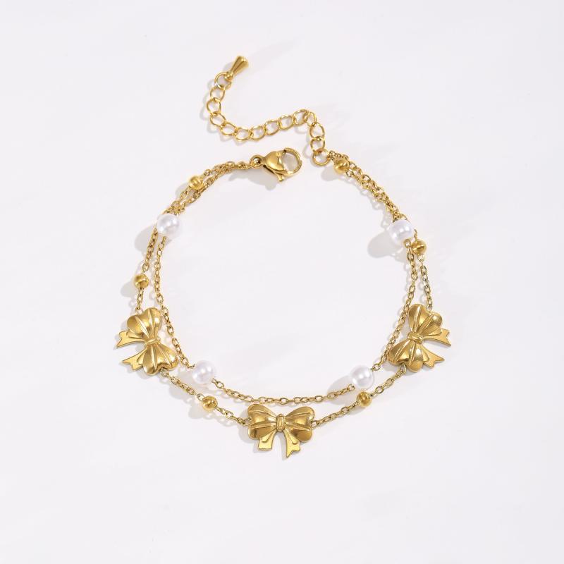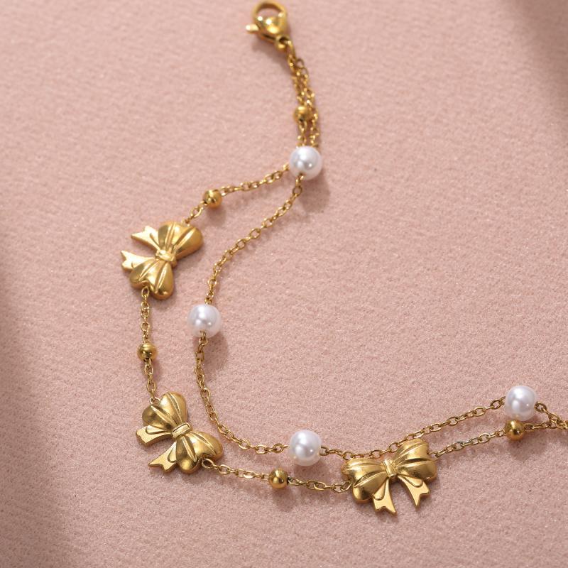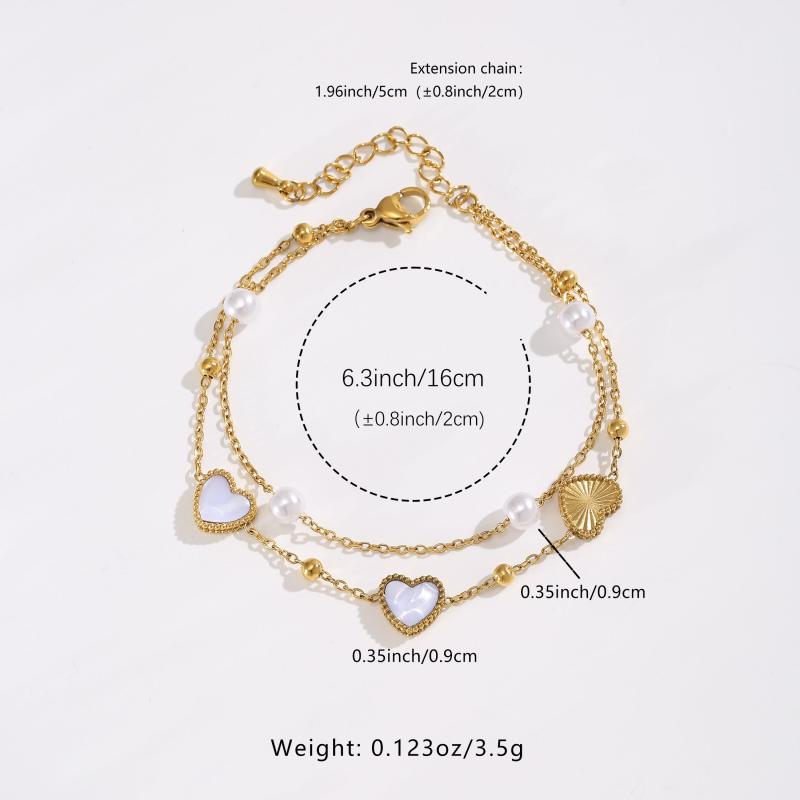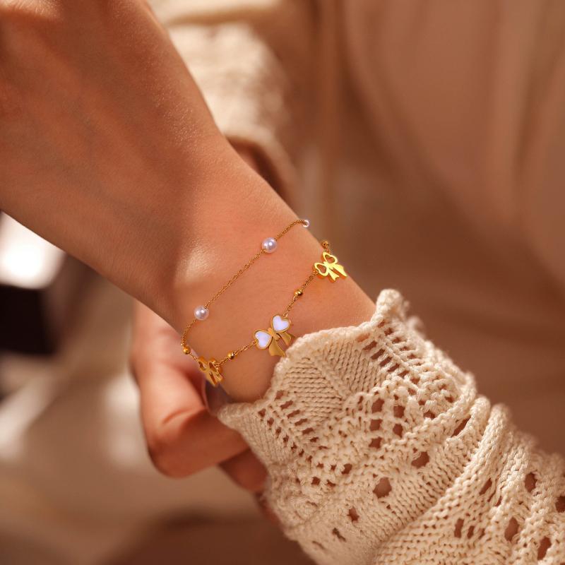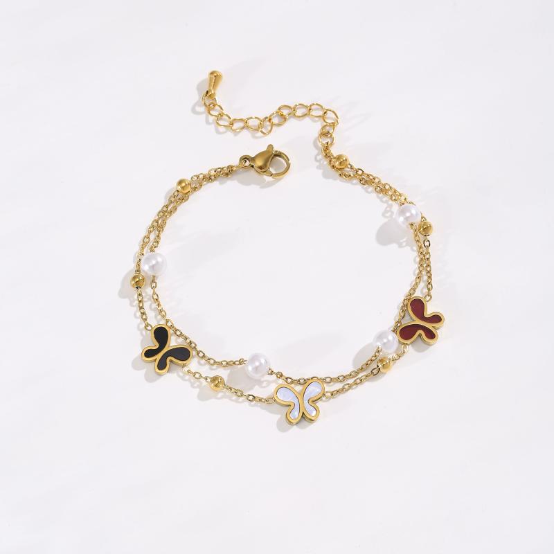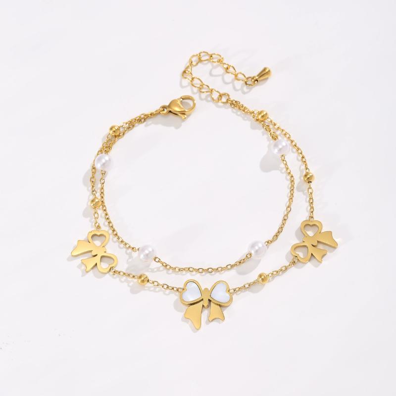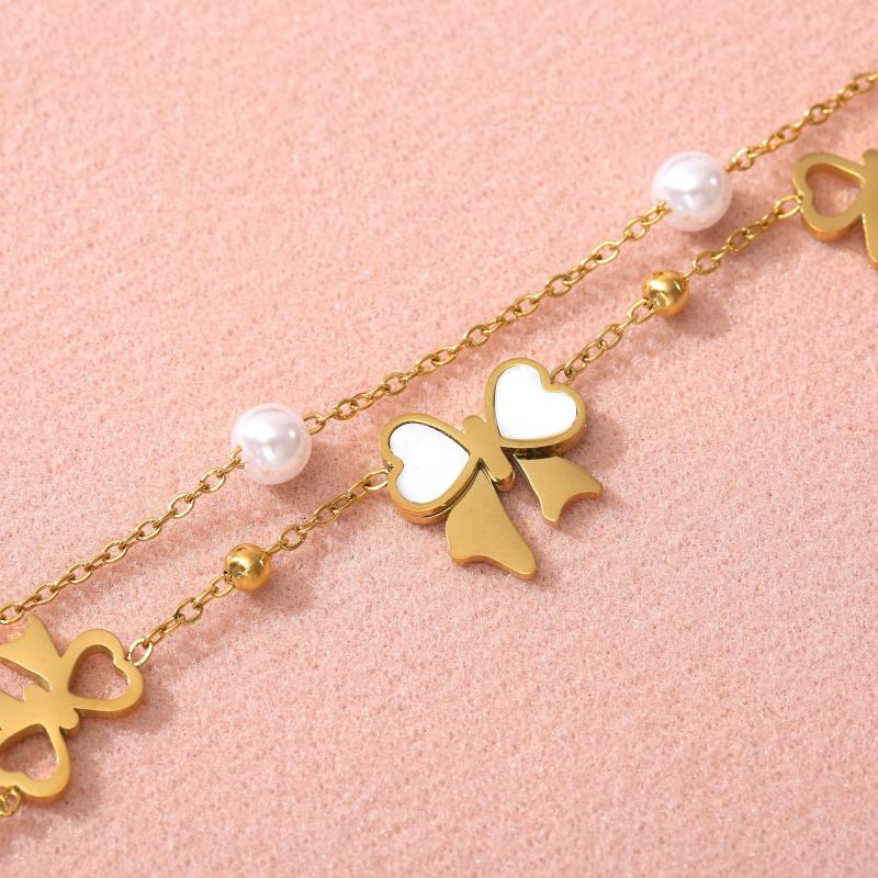 Elegant bracelet featuring heart and butterfly pearls, double decoration design, made of low allergy stainless steel. Perfect for parties and beach wear.