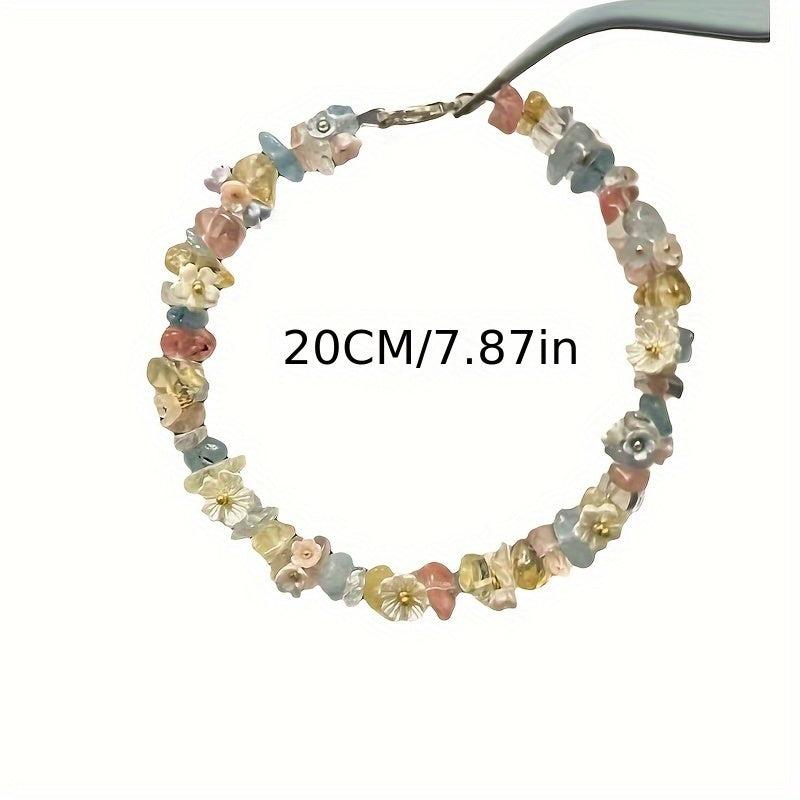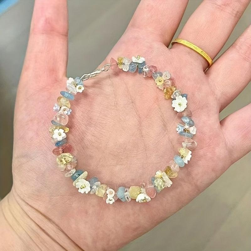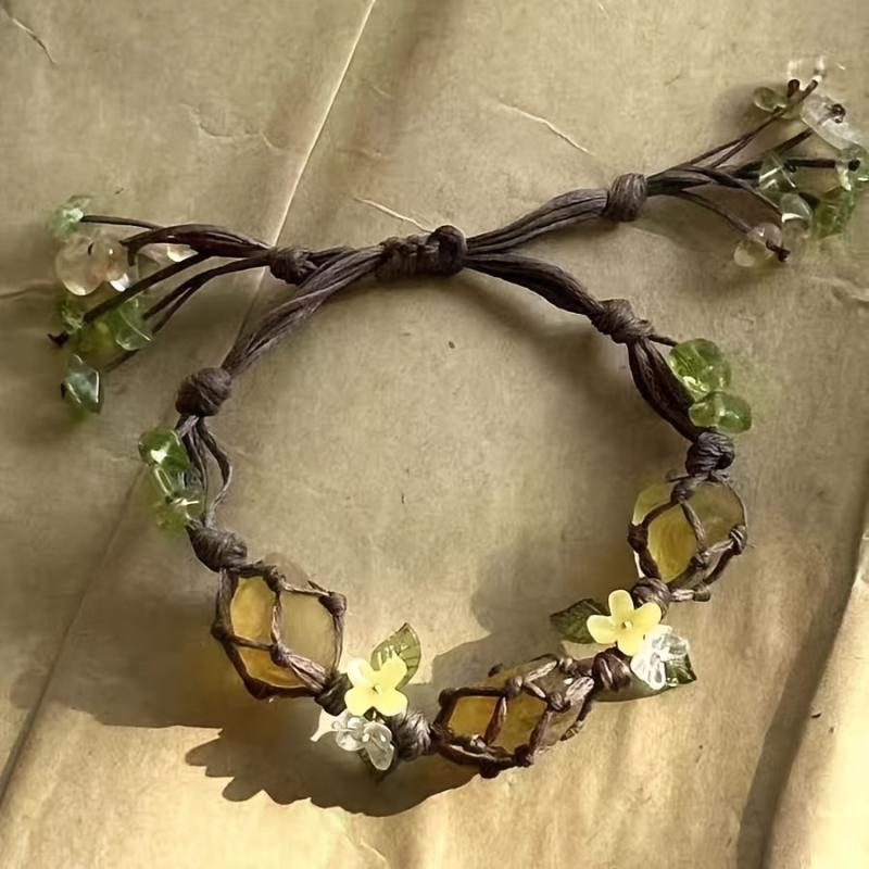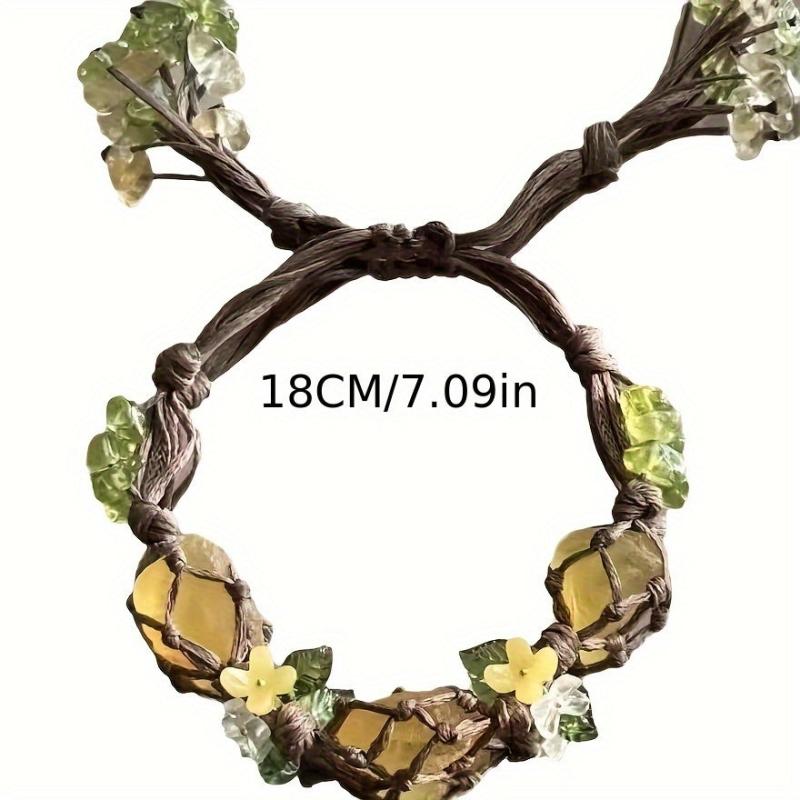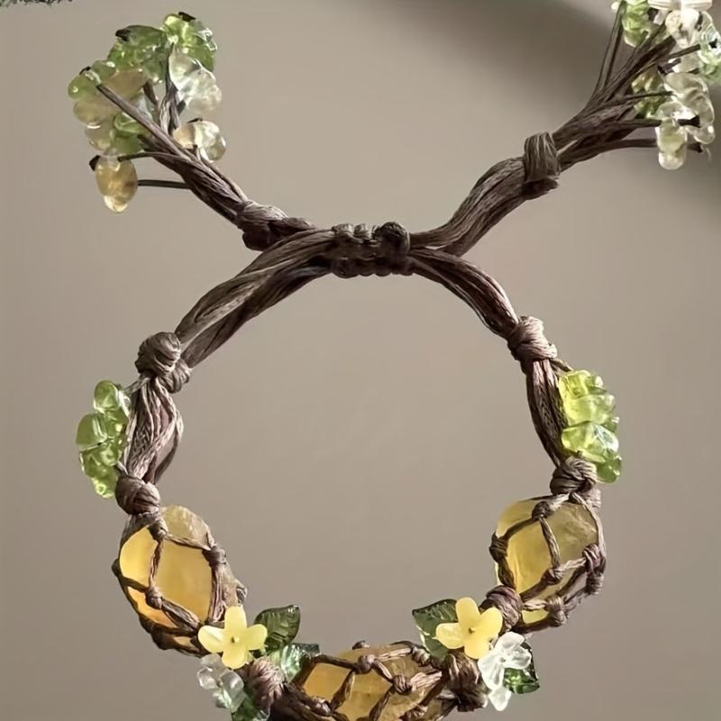 Elevate your casual attire with this adjustable braided cord bracelet featuring natural stone beads adorned with floral green and yellow accents. Perfect as a stylish gift idea.
