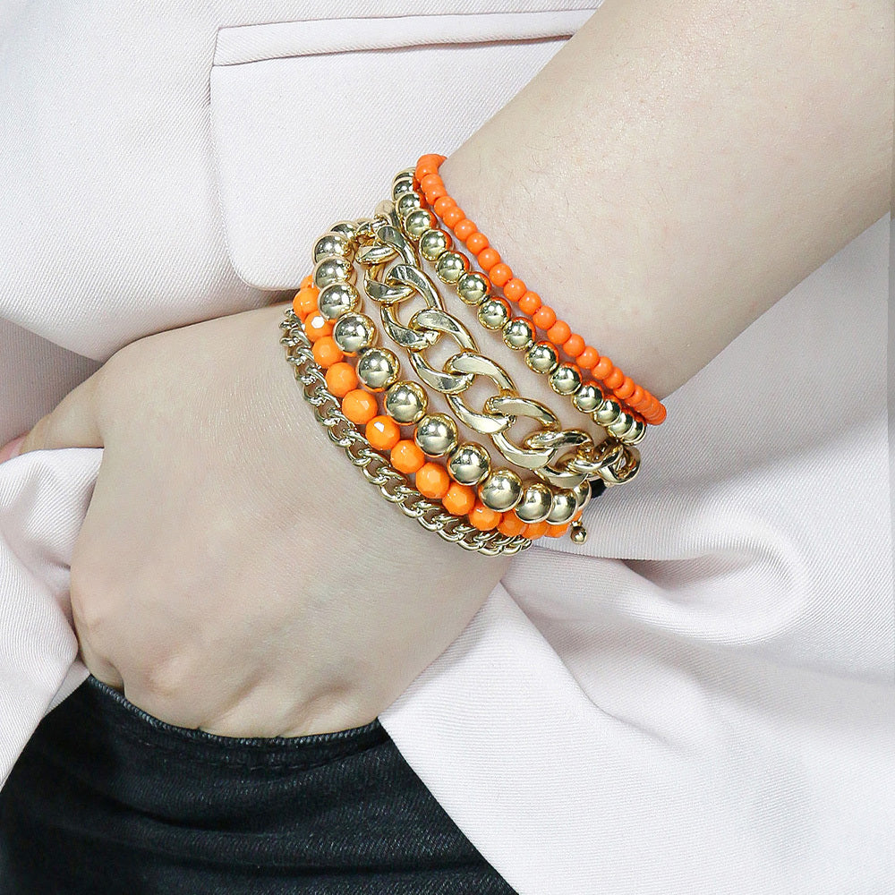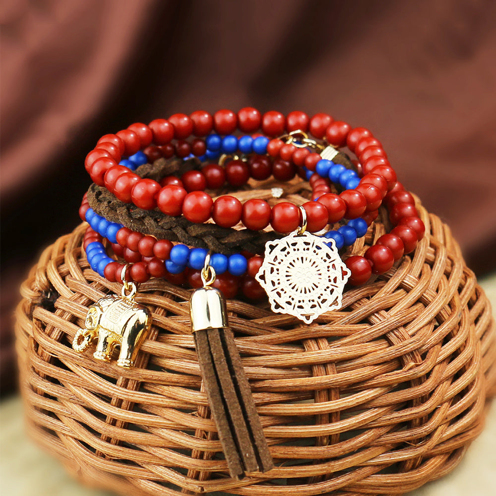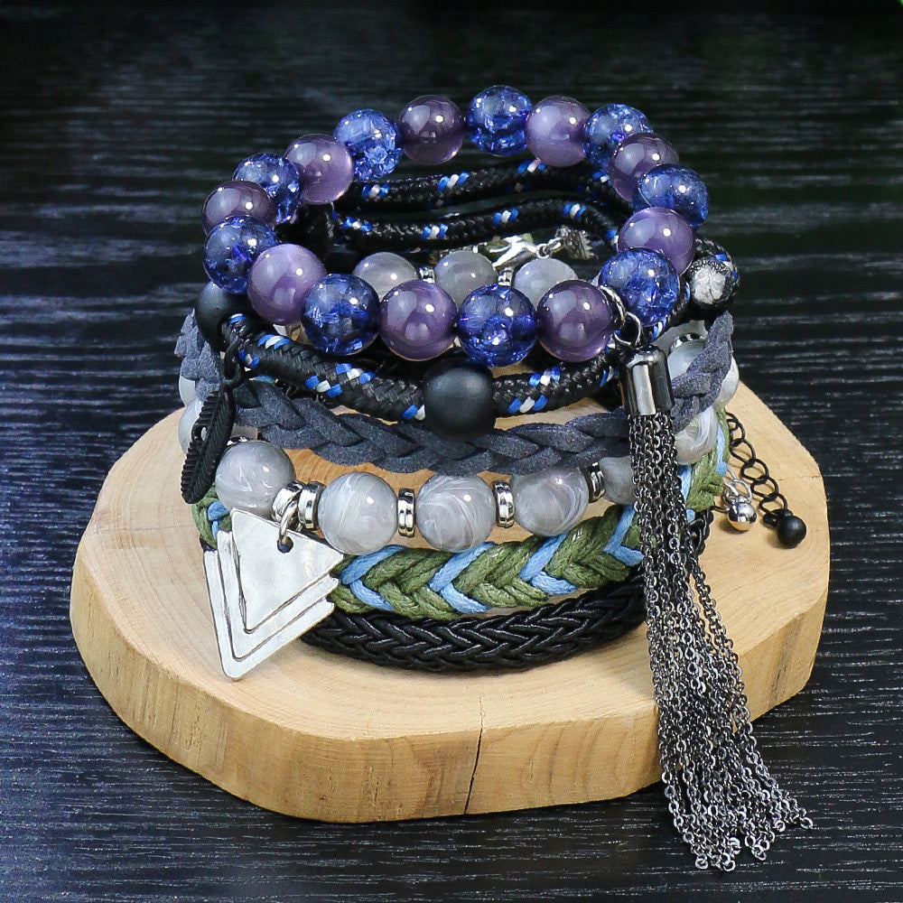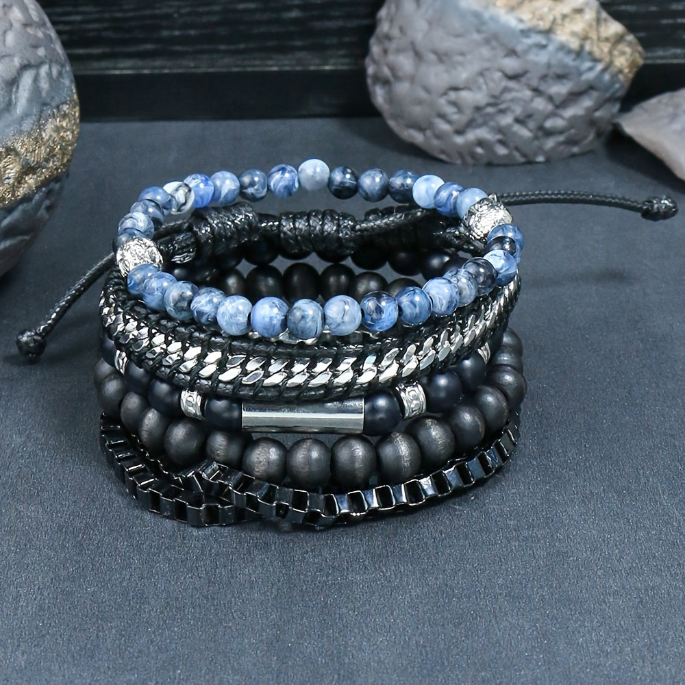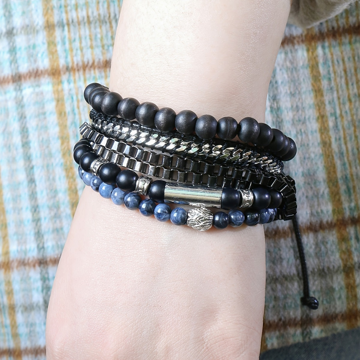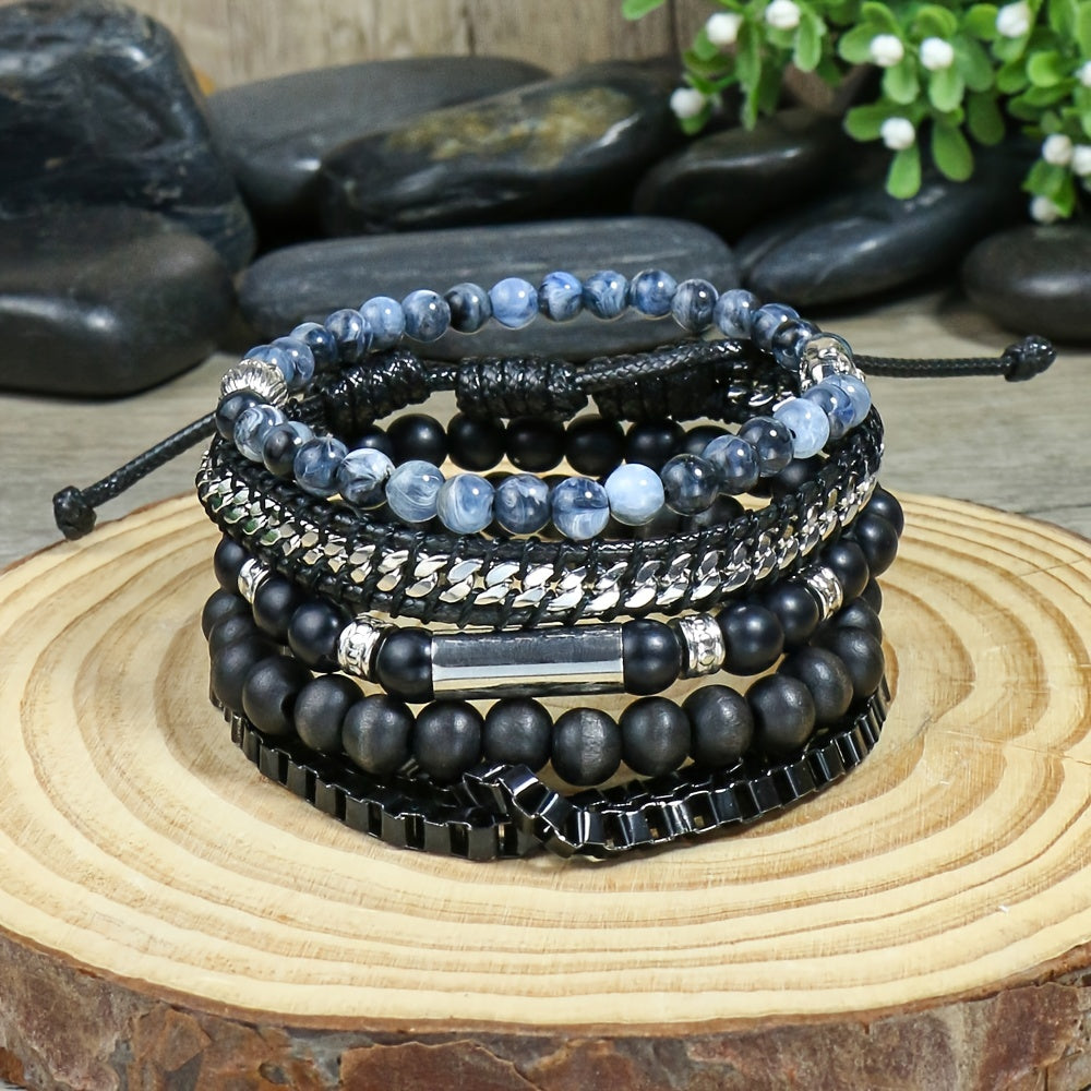 This set includes multicolor stone woven bracelets with stretch elastic and buckle combination, perfect for a retro look.