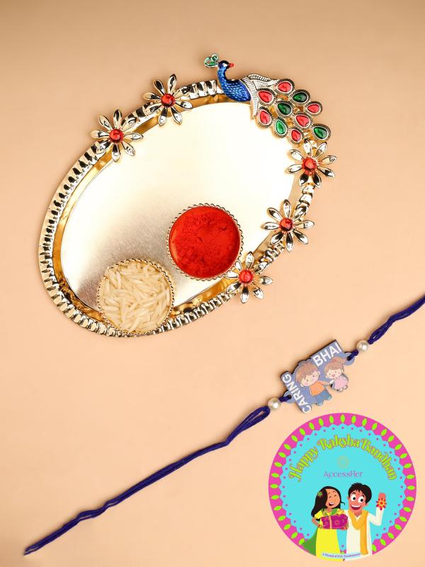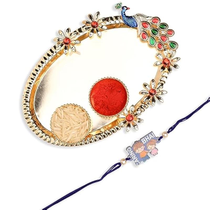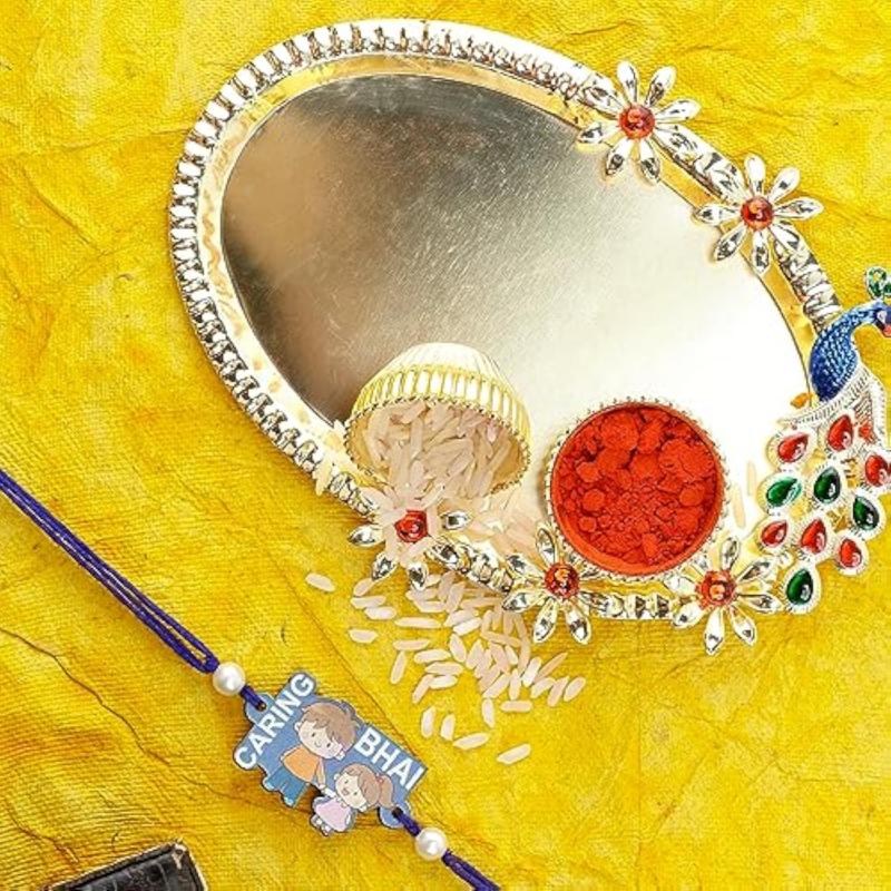 Celebrate Rakshabandhan with this wooden rakhi featuring 'Caring Bhai' print. Includes an acrylic pooja thali, roli kumkum packets, and a happy Rakshabandhan wish.