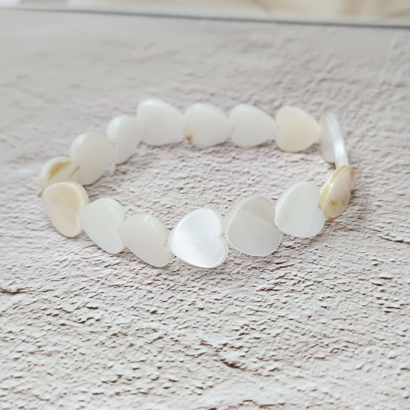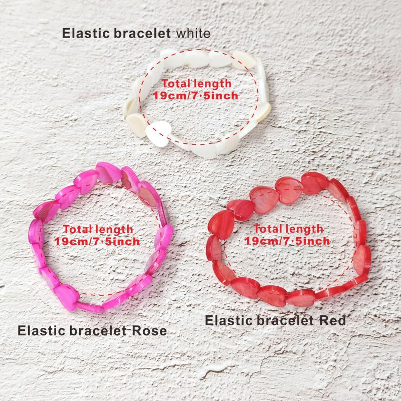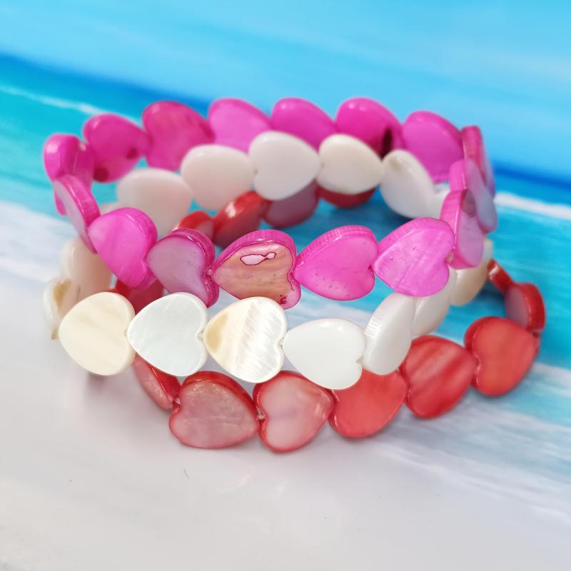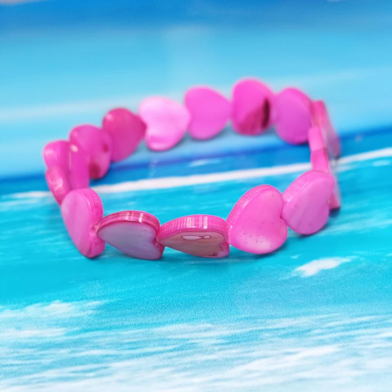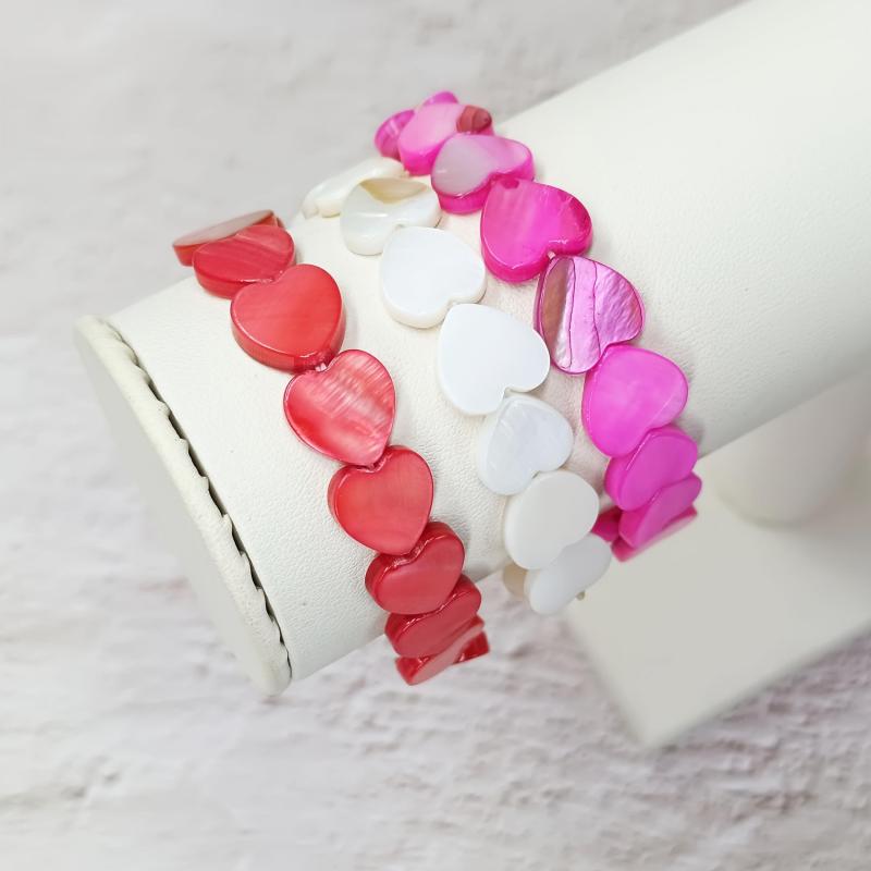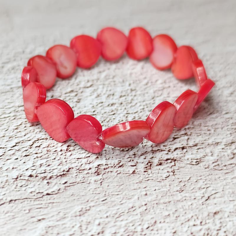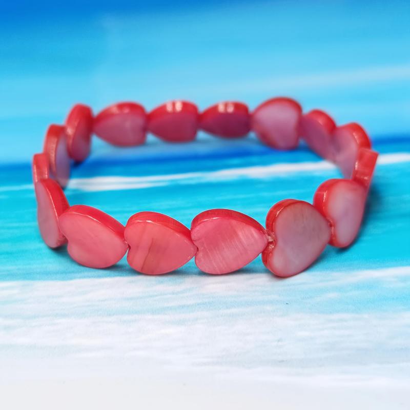 This minimalist stretch bracelet features a heart-shaped shell bead design with pink glossy beads and red accents. Perfect for weddings or a stylish accessory.