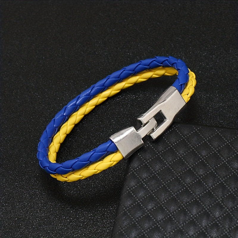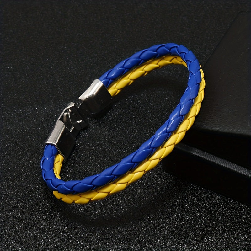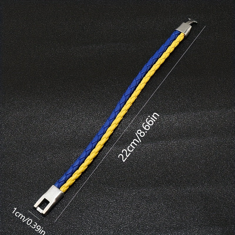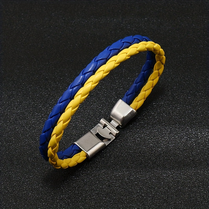 Show your support for Ukraine with this stylish braided leather bracelet featuring the yellow and blue colors of the Ukrainian flag.