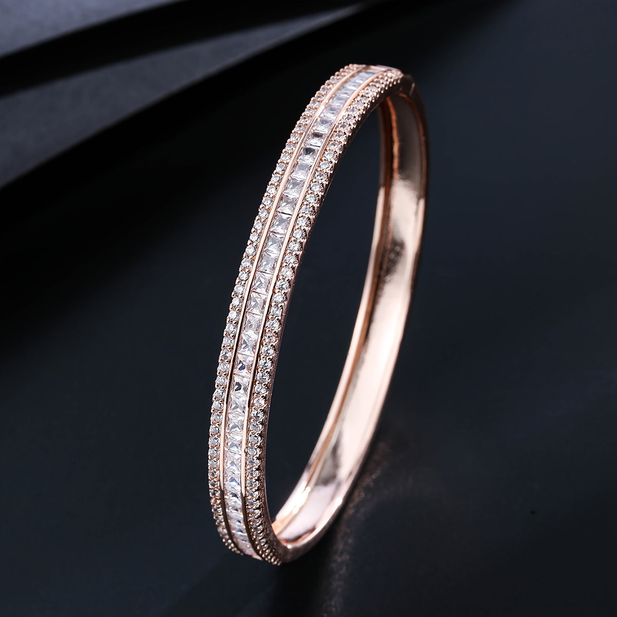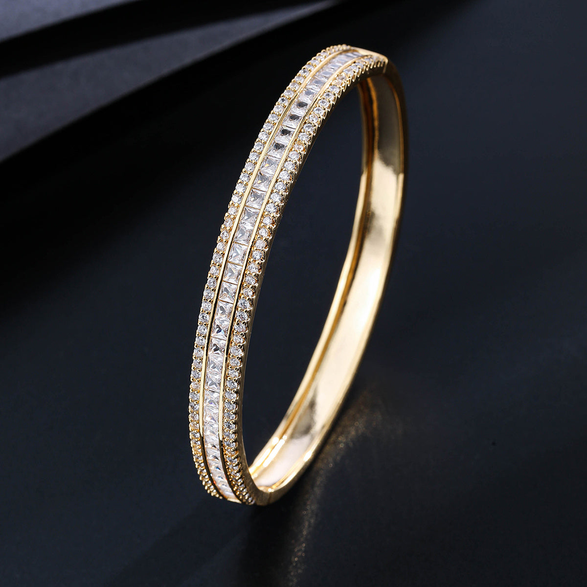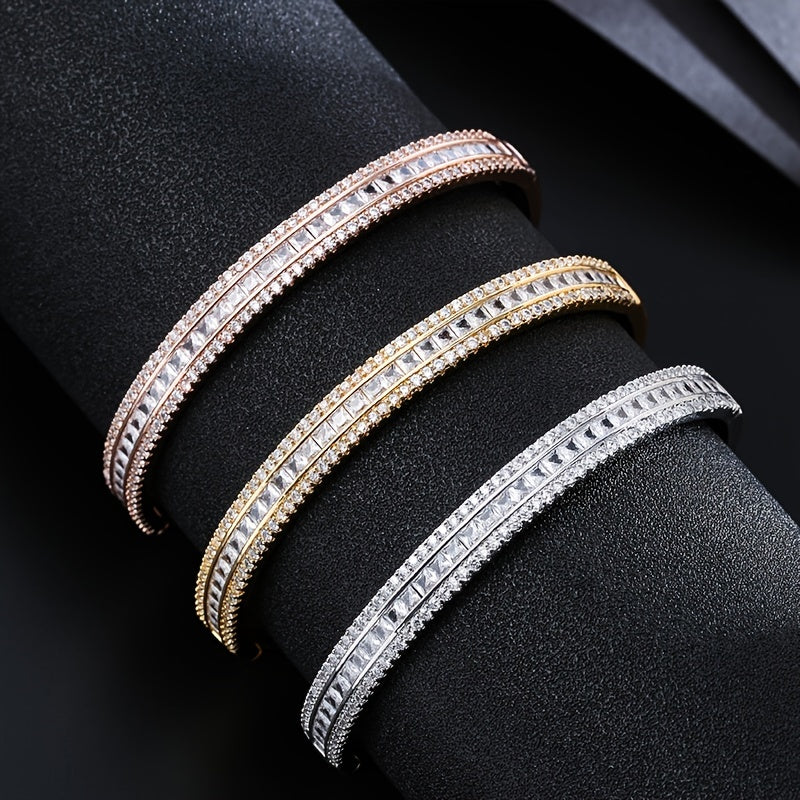 Elegant and stylish three rows zircon bangle crafted from high-quality copper with 18K gold plating. Perfect accessory for adding a touch of sophistication to any outfit.