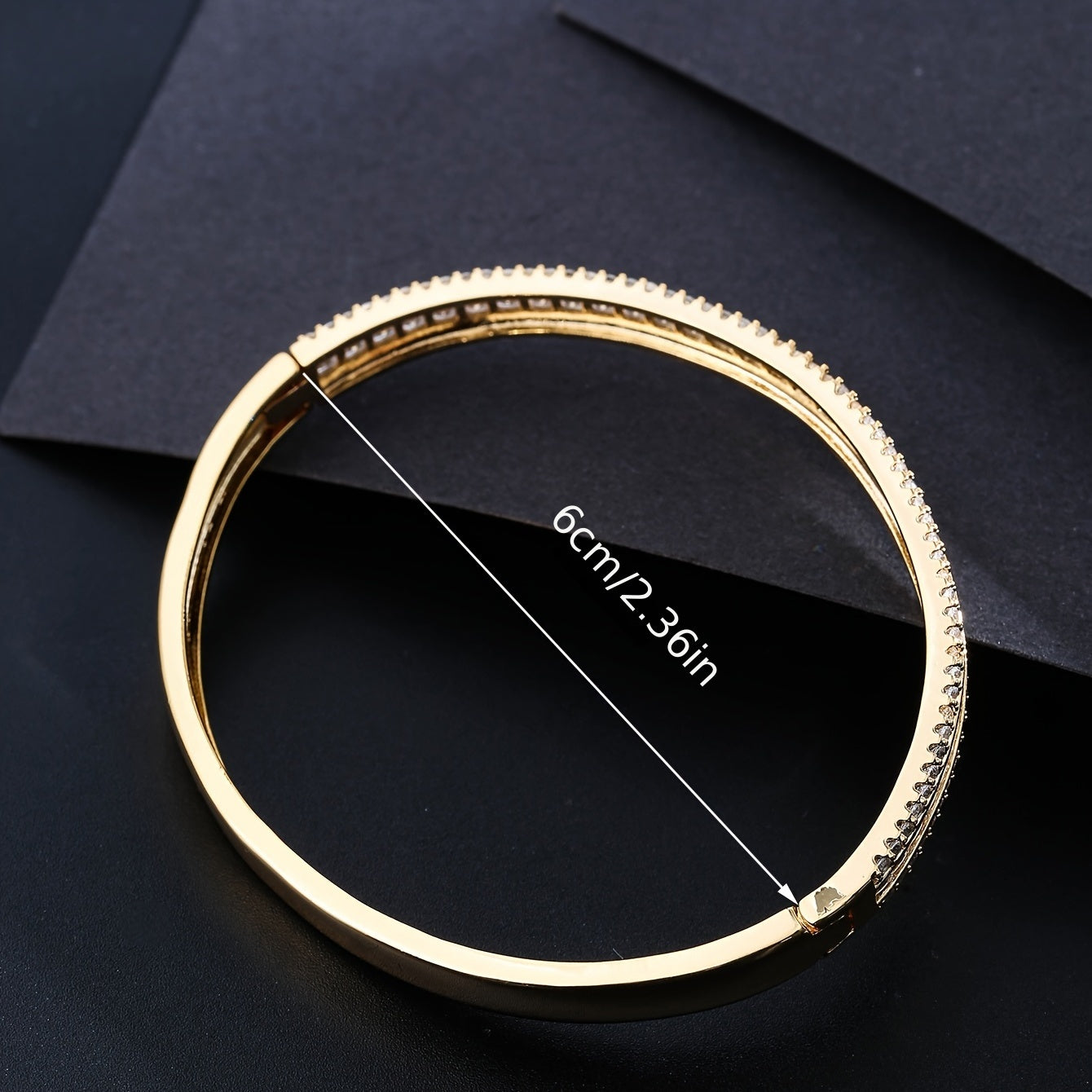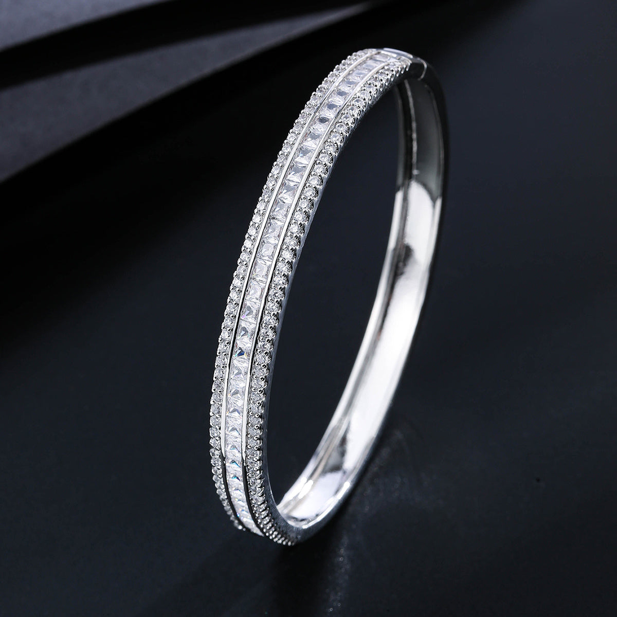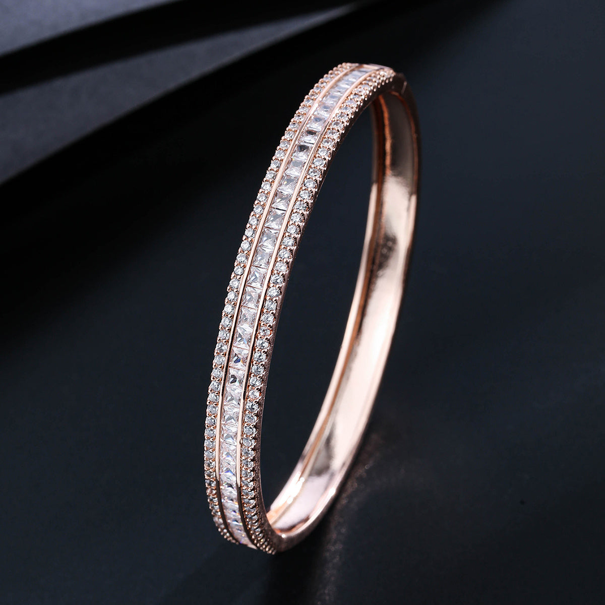 Elegant and stylish three rows zircon bangle crafted from high-quality copper with 18K gold plating. Perfect accessory for adding a touch of sophistication to any outfit.