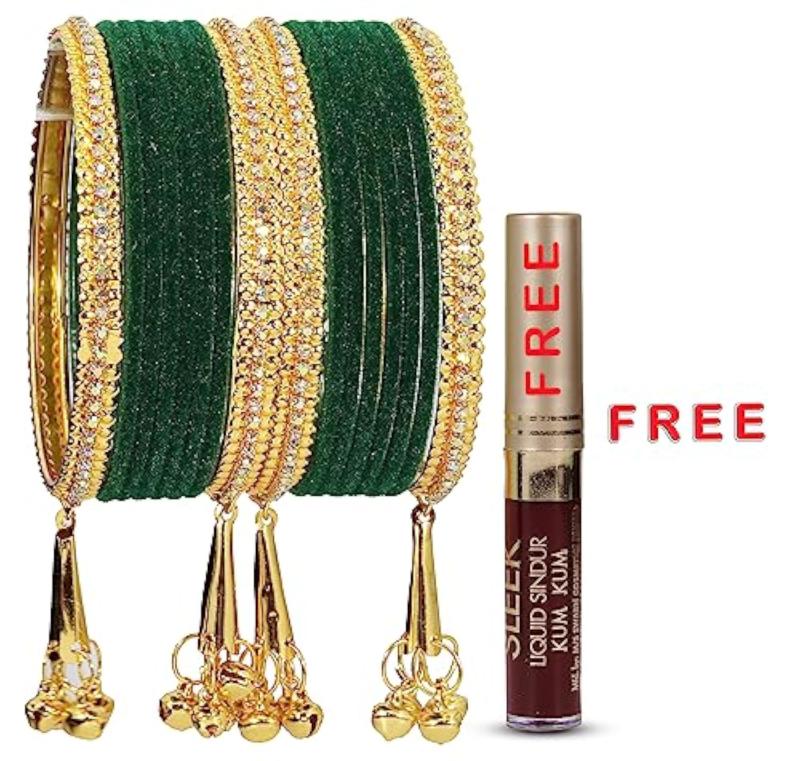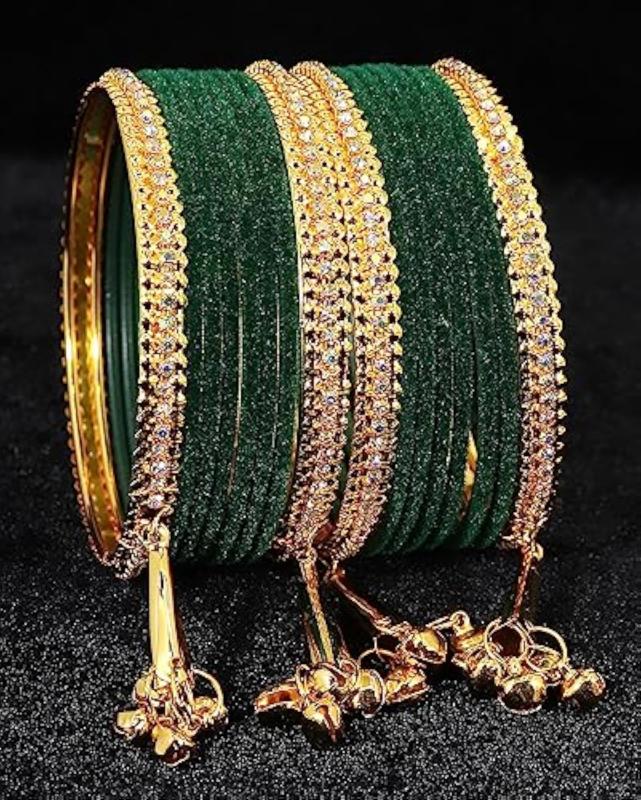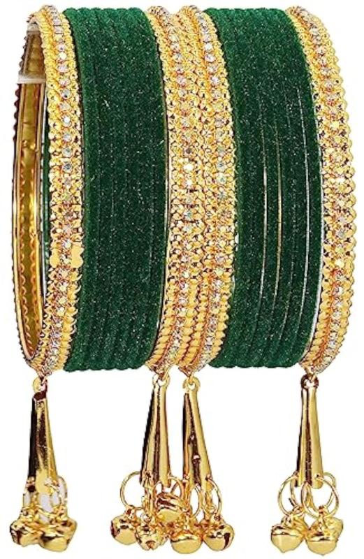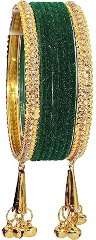 Add a touch of elegance to your outfit with this stunning bangle set featuring zircon gemstones and velvet studded bells. Perfect for parties, weddings, and special occasions.