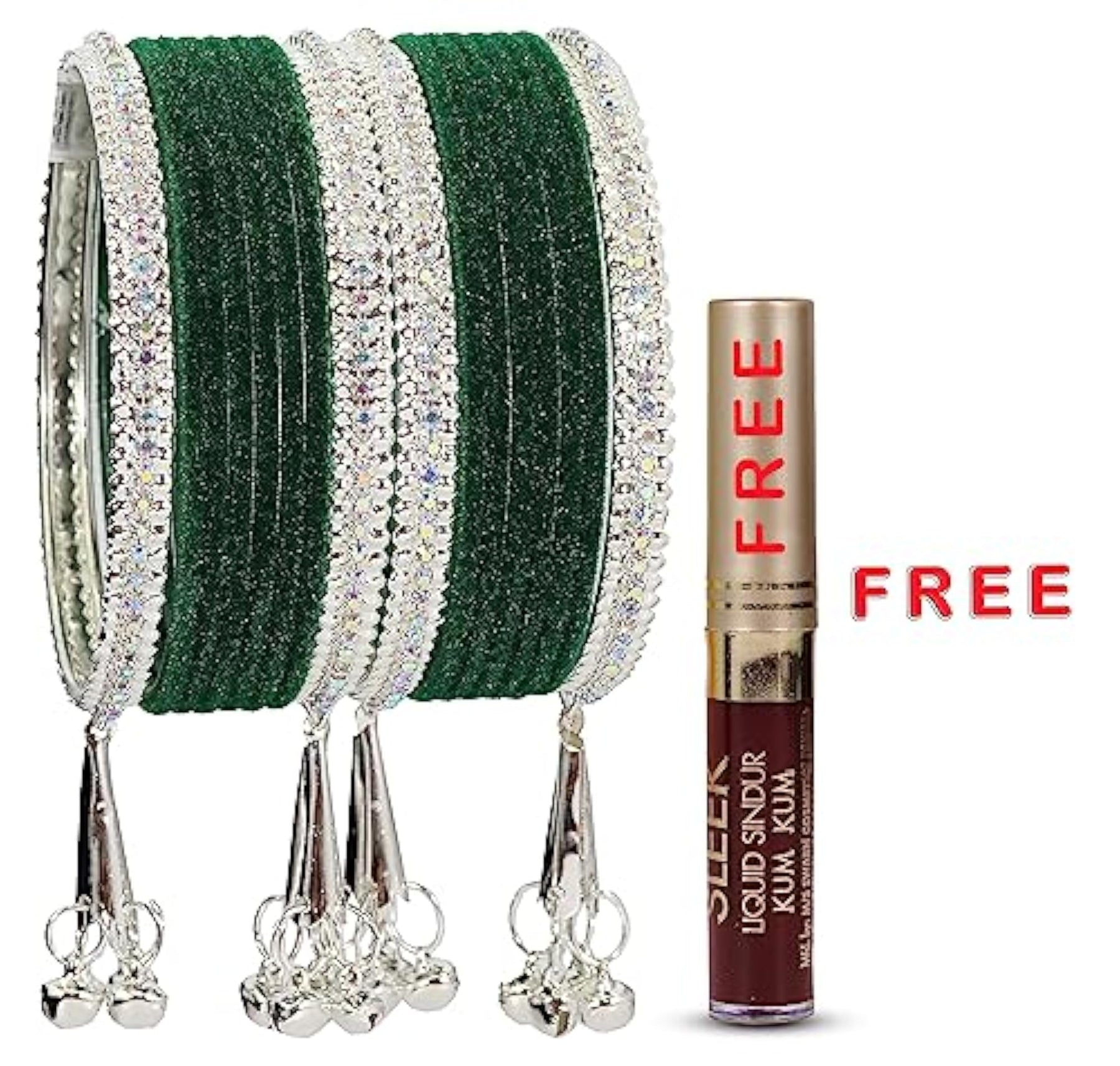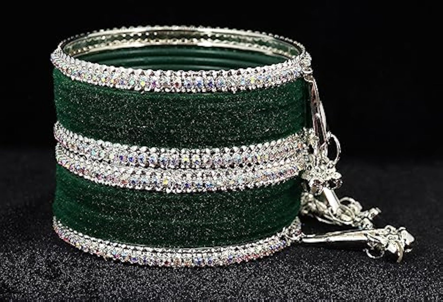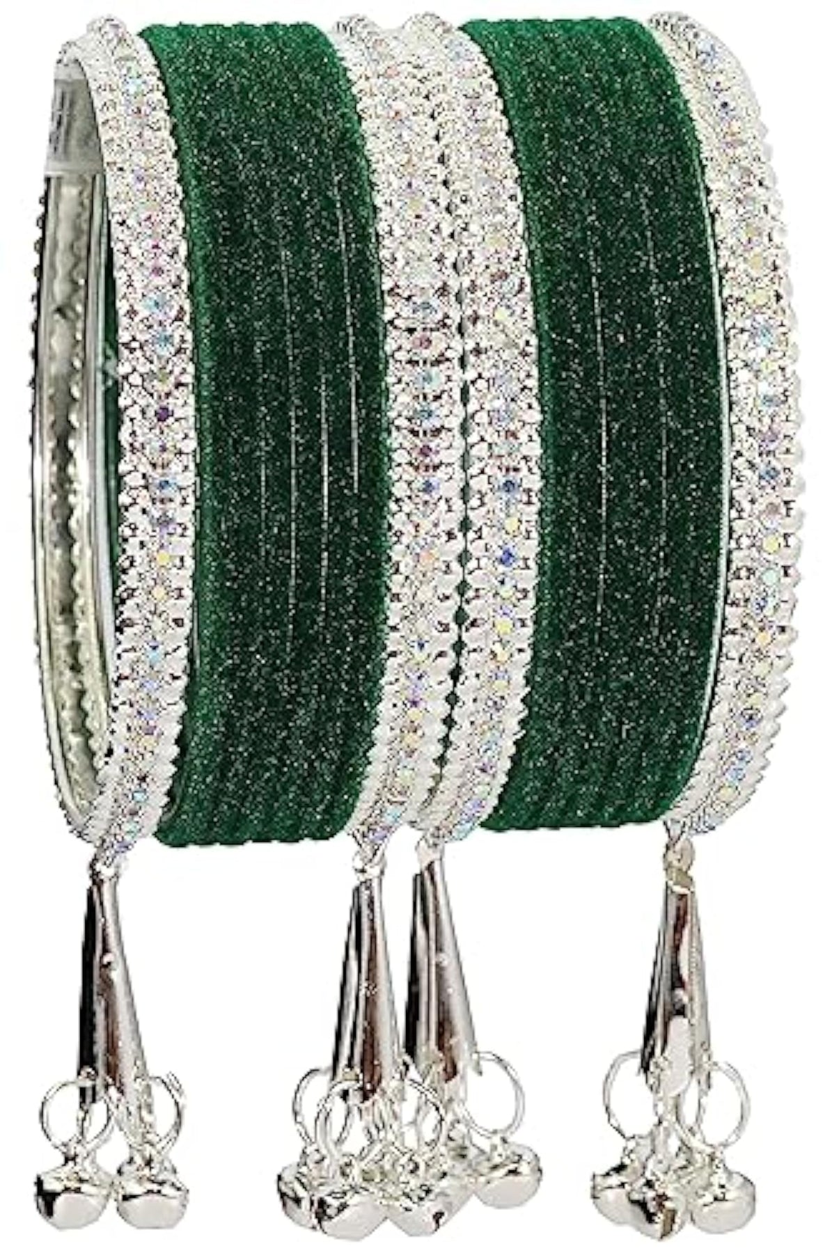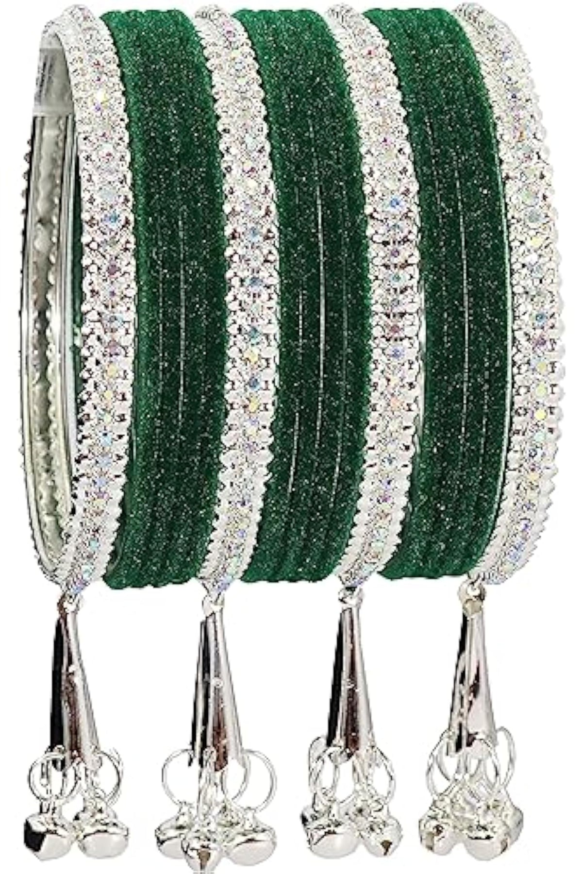 Elegant bangles set featuring zircon gemstones, metal base, and velvet studded bells. Perfect for traditional occasions.