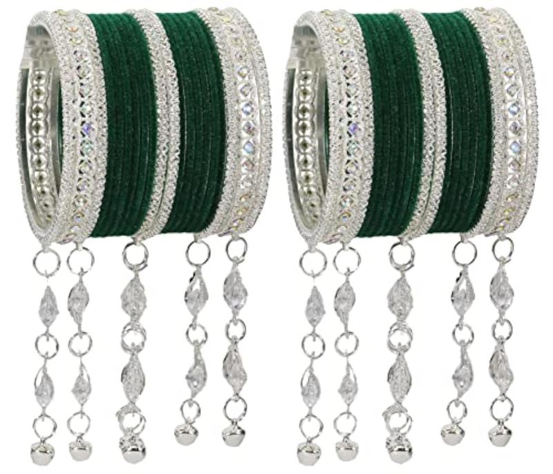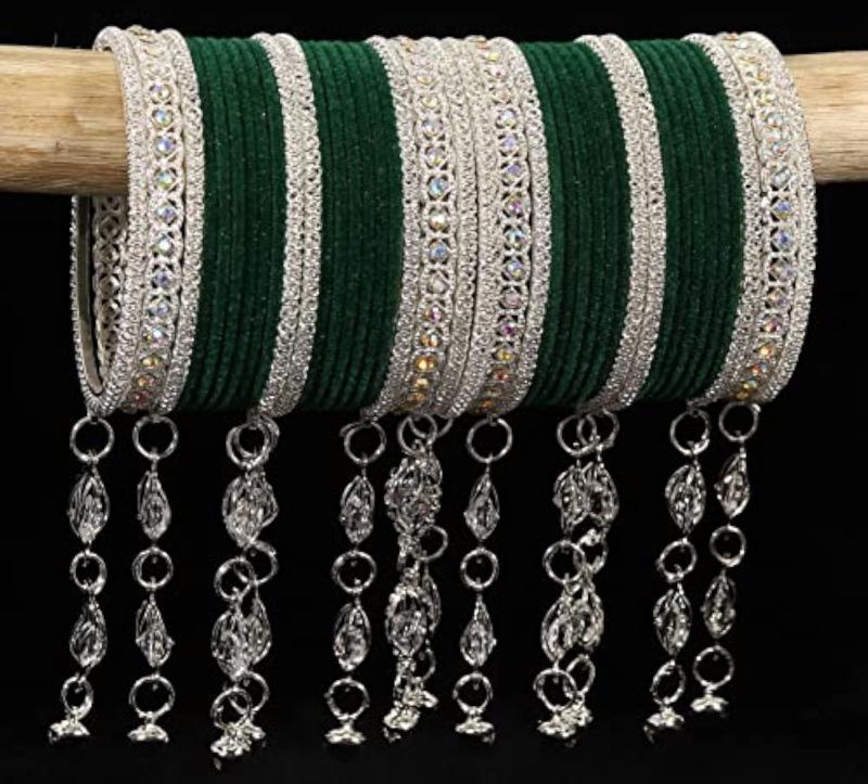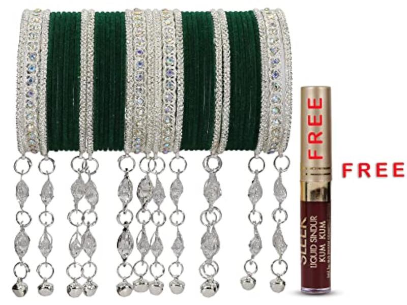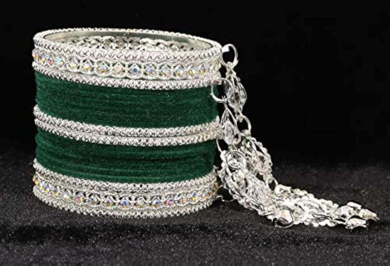 Add a touch of elegance to your outfit with these stunning velvet bangles featuring zircon gemstones and bells. Perfect for women and girls.