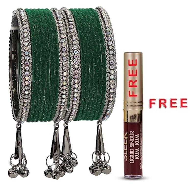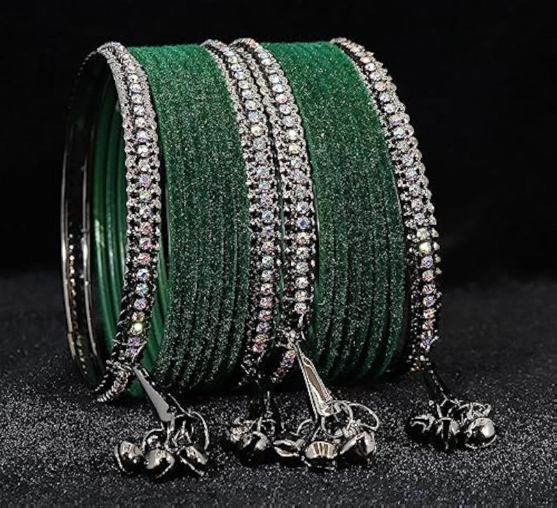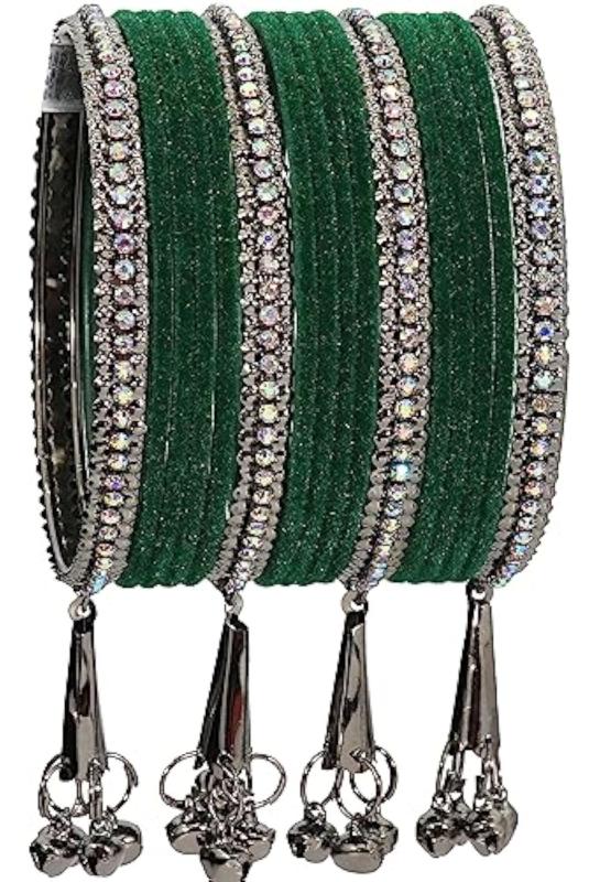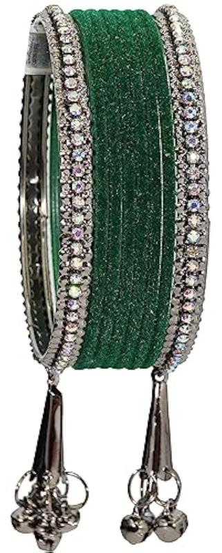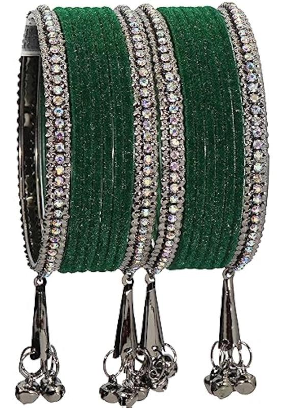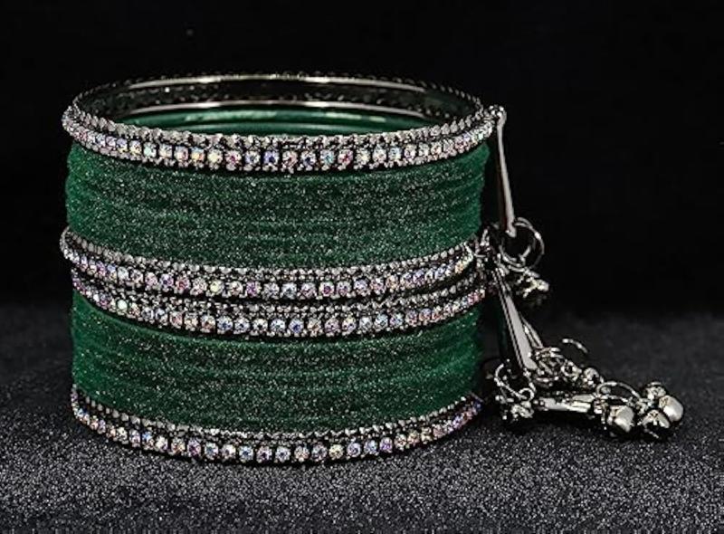 Elegant bangles set featuring zircon gemstones, velvet adorned bells, and a metal base. Perfect for women who love stylish accessories.