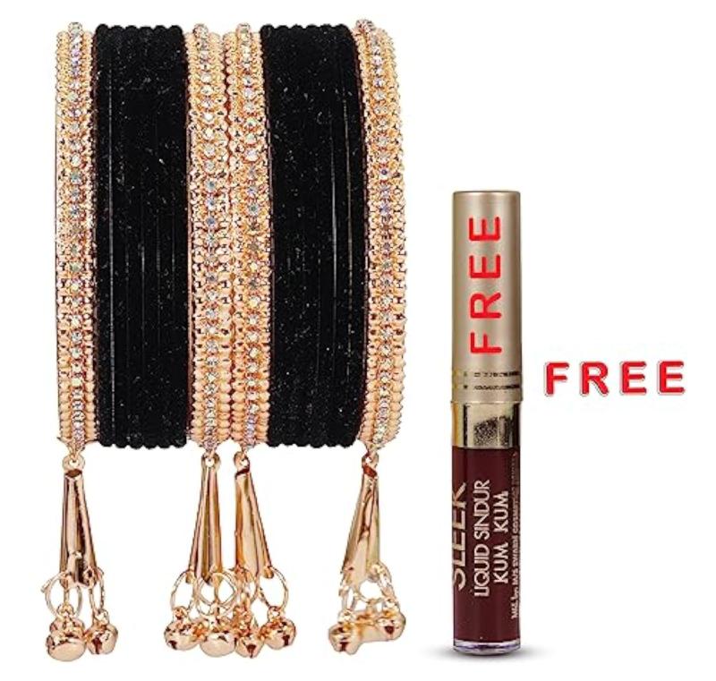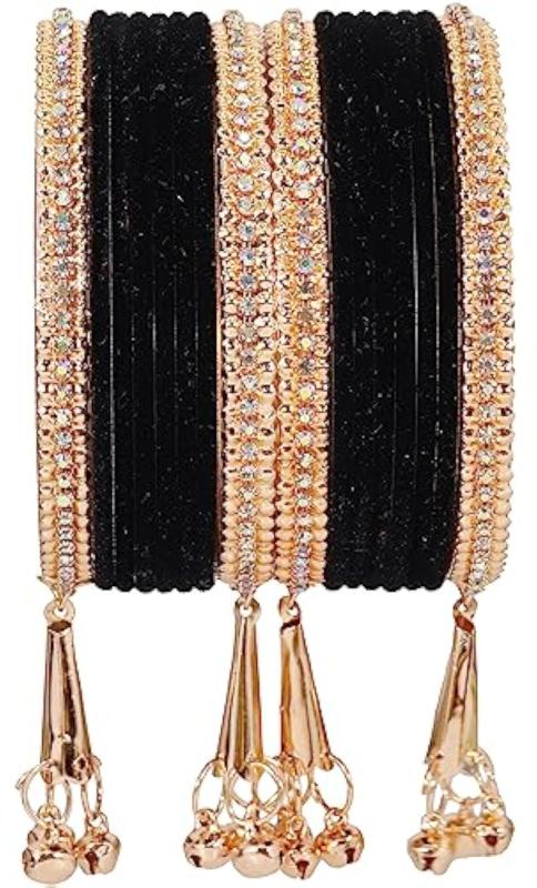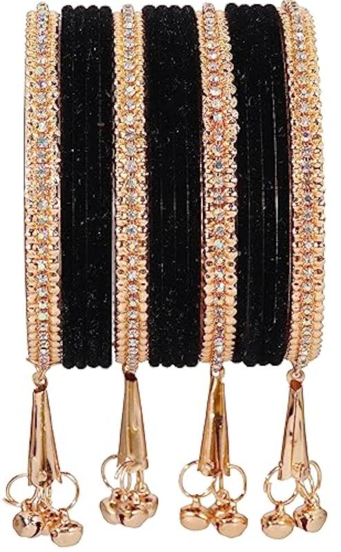 Elegant bangles set featuring zircon gemstones, velvet studded bells, and metal construction. Perfect for special occasions.