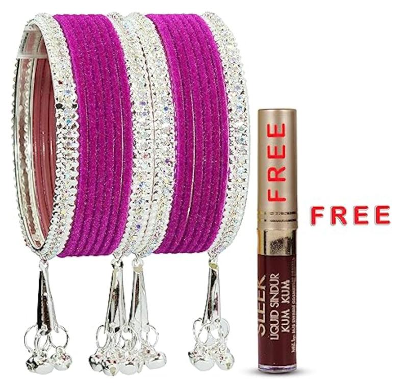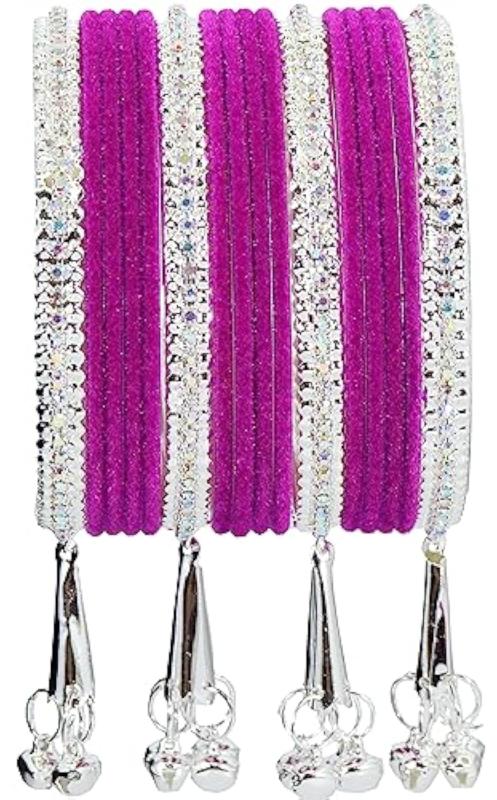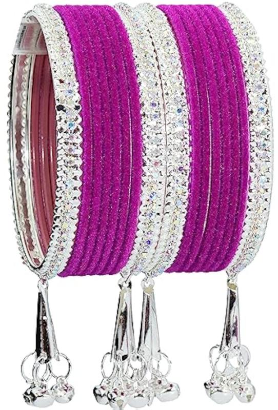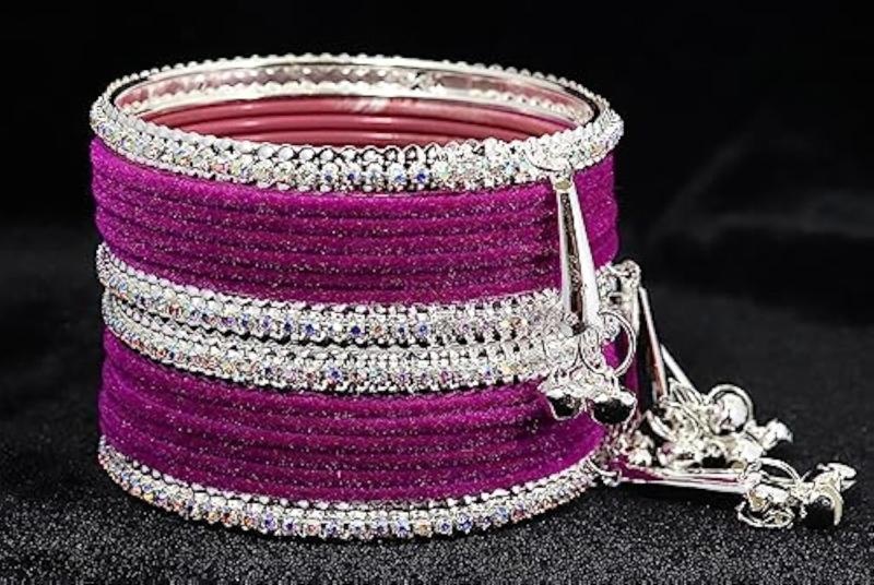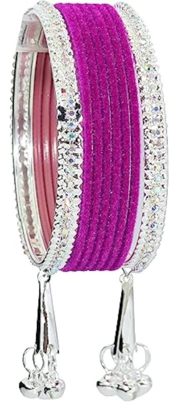 Elegant metal bangles adorned with zircon gemstones and velvet studded bells. Perfect for adding a touch of glamour to your outfit.