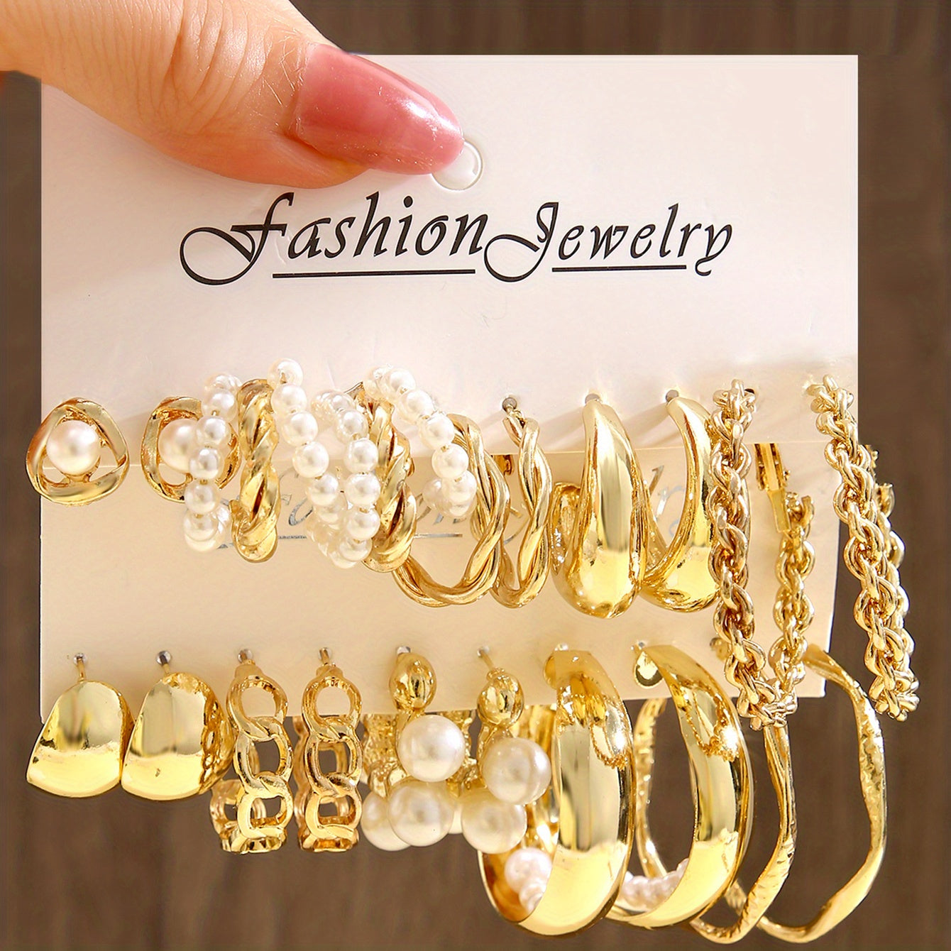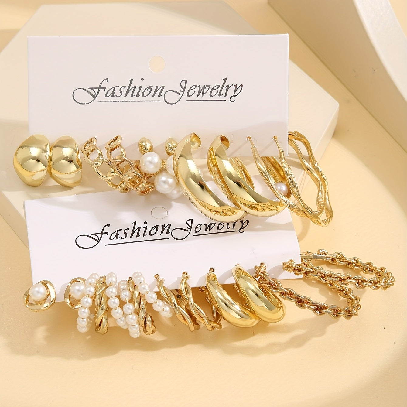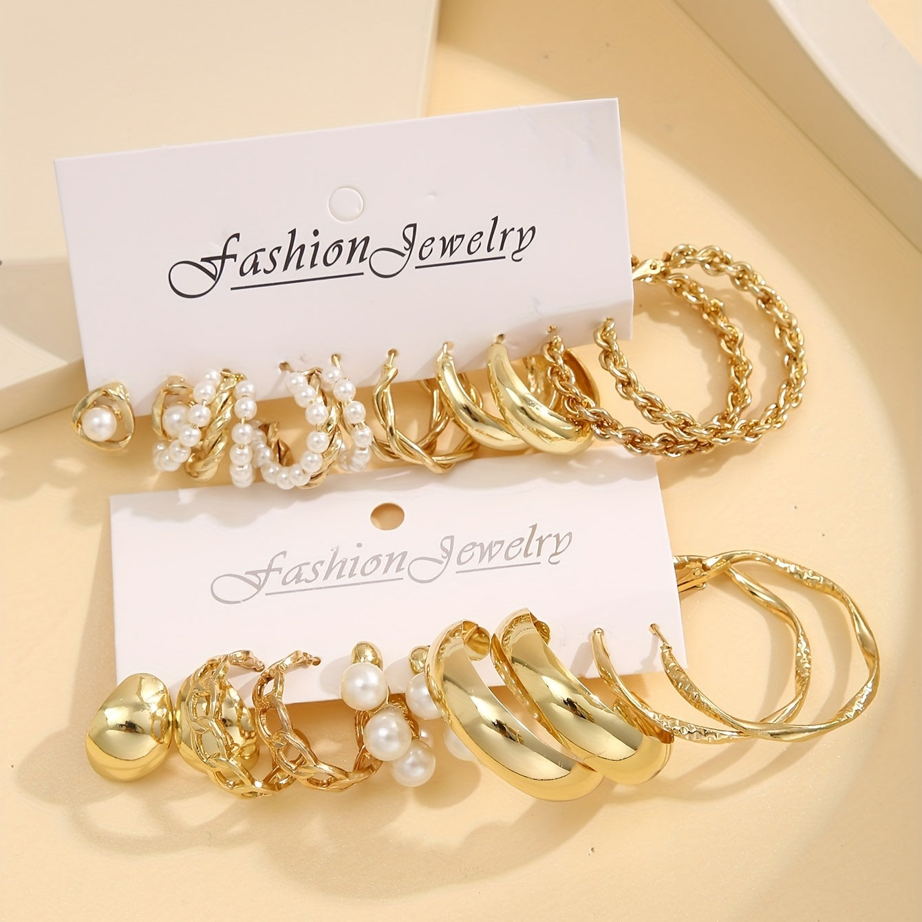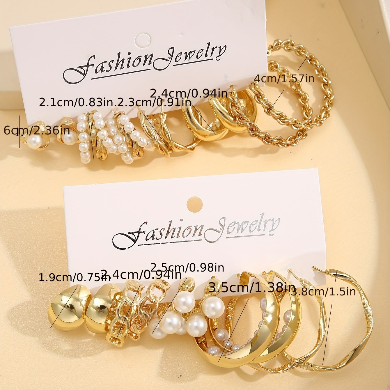 Add a touch of retro elegance to your look with this set of 10 pairs of golden hoop earrings featuring faux pearl decoration. Perfect gift for females who love vintage jewelry.