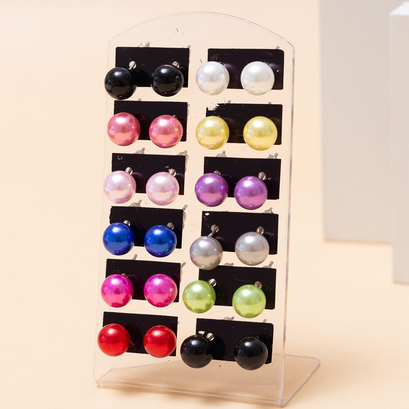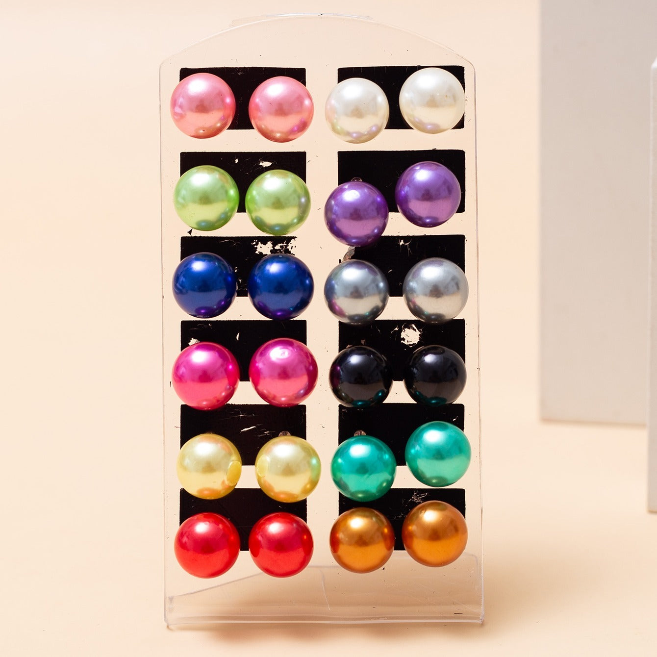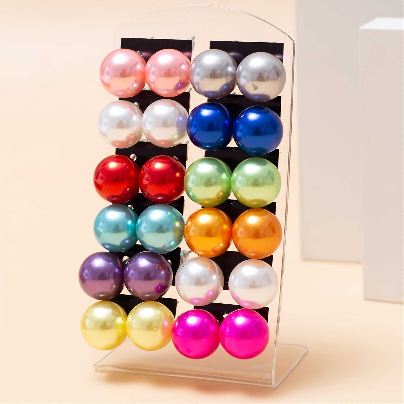 This set includes 12 pairs of colorful pearl round ball stud earrings, perfect as a jewelry gift for men and women. Available in sizes 6mm, 8mm, 10mm, and 12mm.