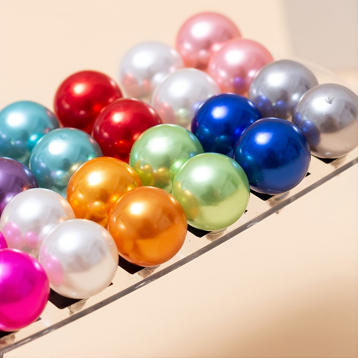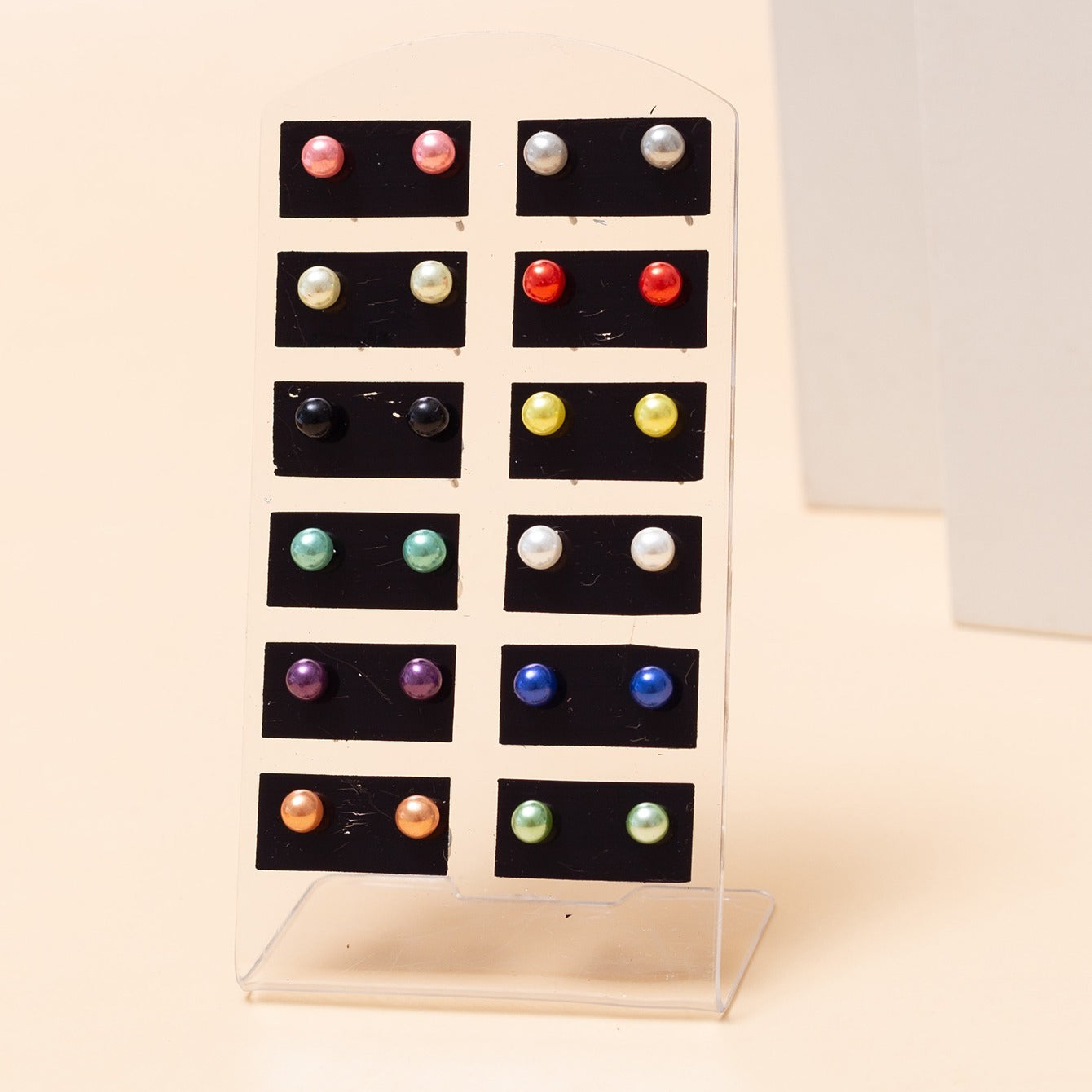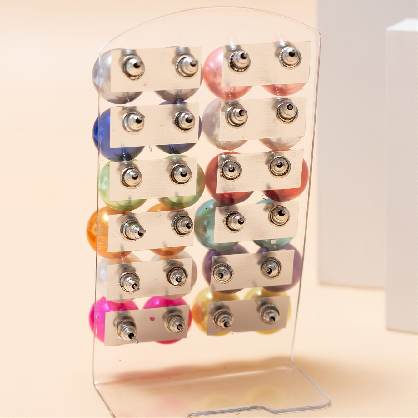 This set includes 12 pairs of colorful pearl round ball stud earrings, perfect as a jewelry gift for men and women. Available in sizes 6mm, 8mm, 10mm, and 12mm.