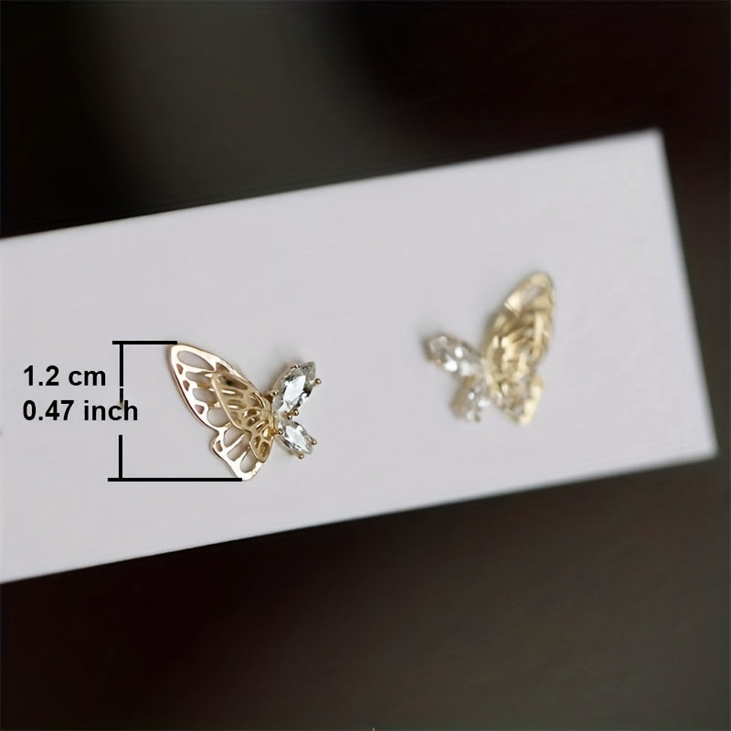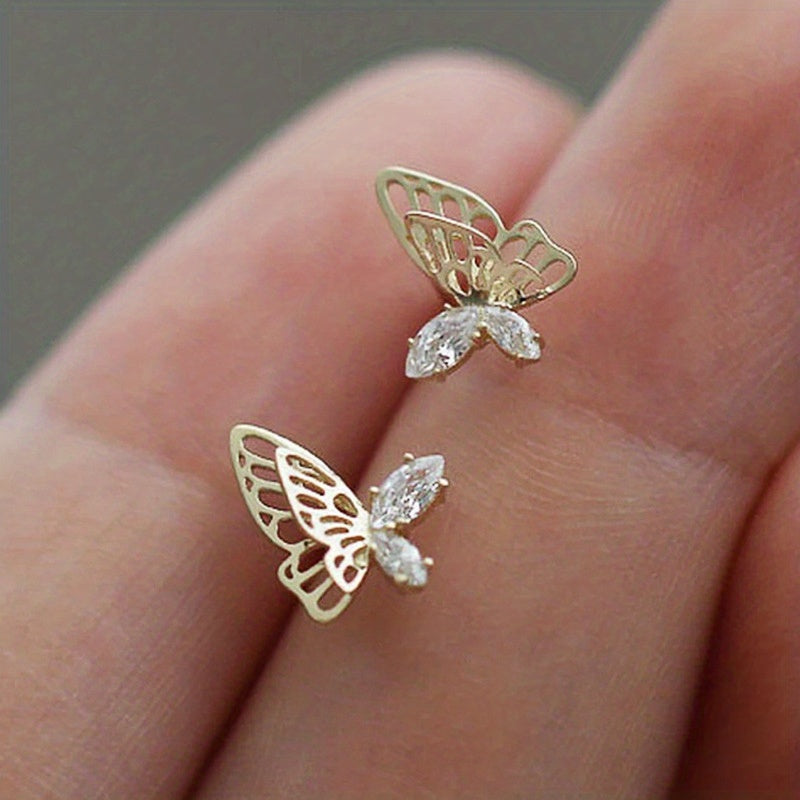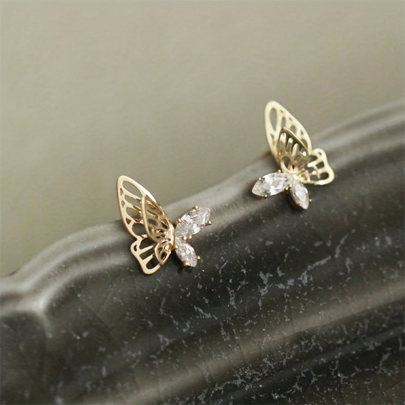 These stunning 18K plated stud earrings feature a butterfly design inlaid with shimmering zircon stones. Perfect for weddings, parties, and engagements.