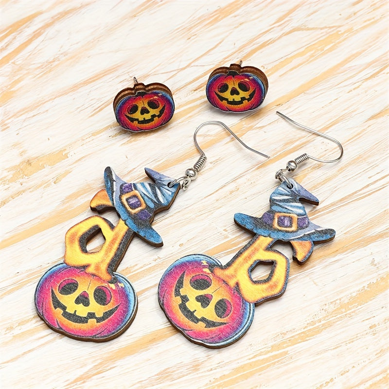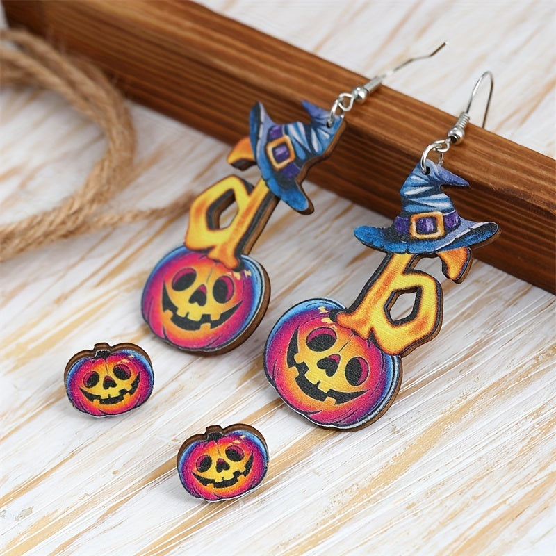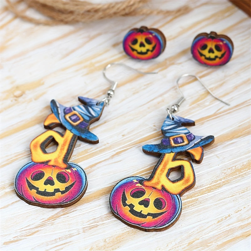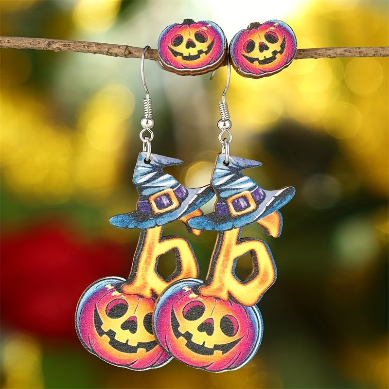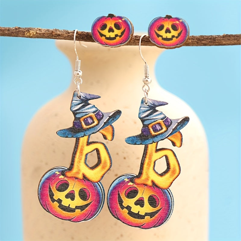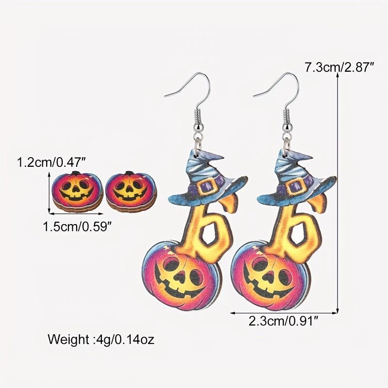 This set includes 2 pairs of Halloween earrings featuring horror pumpkin and witch's hat designs. Perfect goth punk style jewelry for the spooky season.
