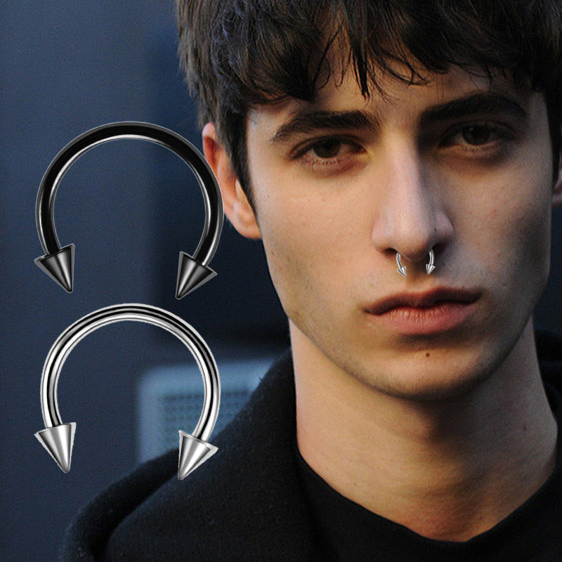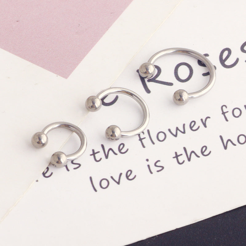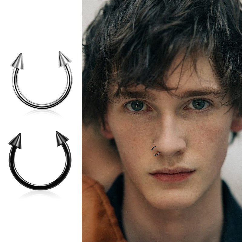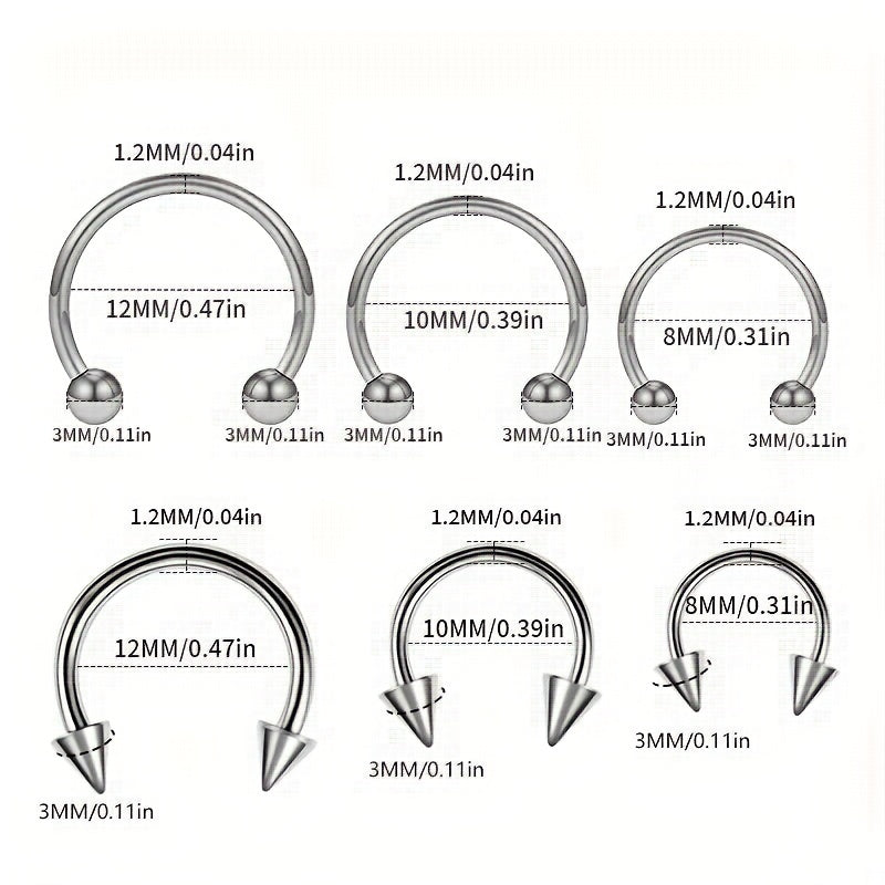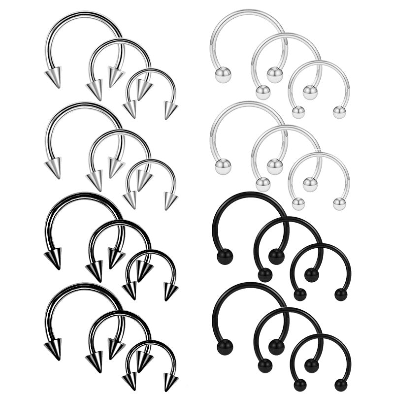 This set includes 24 surgical steel horseshoe hoop earrings for men. Perfect for nose, septum, eyebrow, tragus, and lip piercings. Available in 6mm and 10mm sizes.