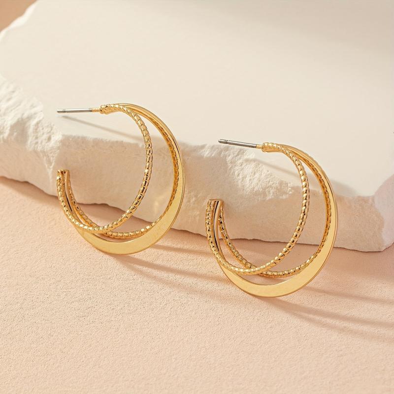Elevate your casual attire with these stylish triple layer geometric C-shaped hoop earrings in a dazzling golden tone. Perfect for parties, shows, and everyday wear.