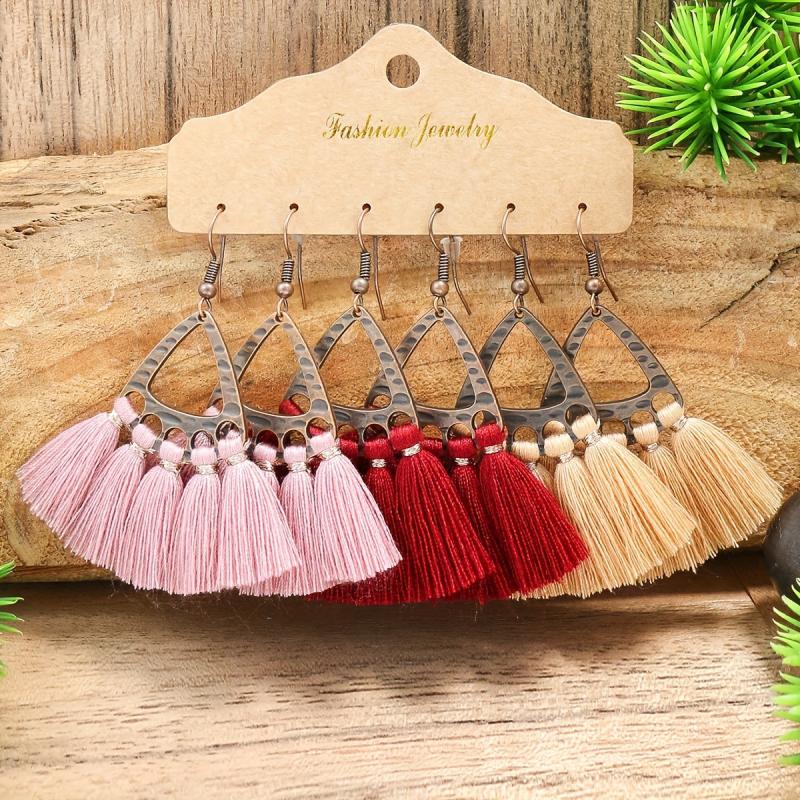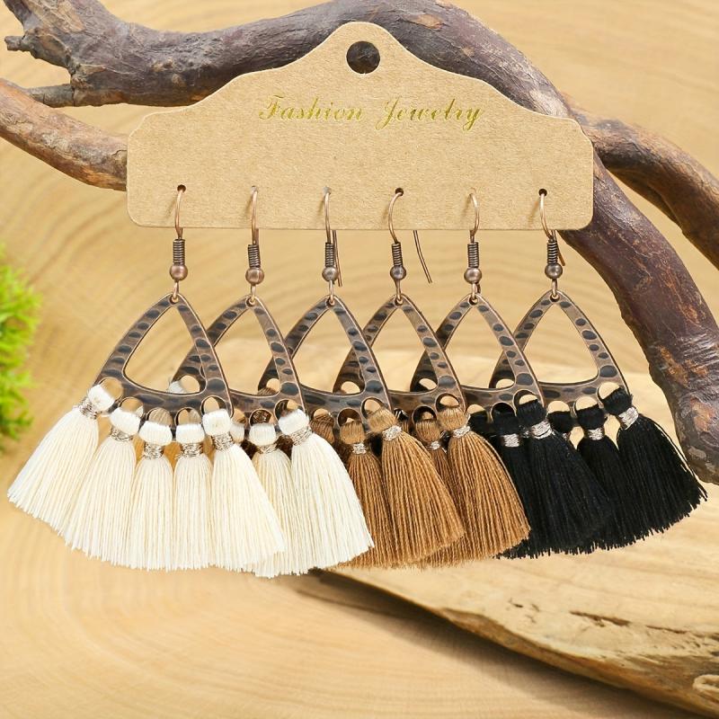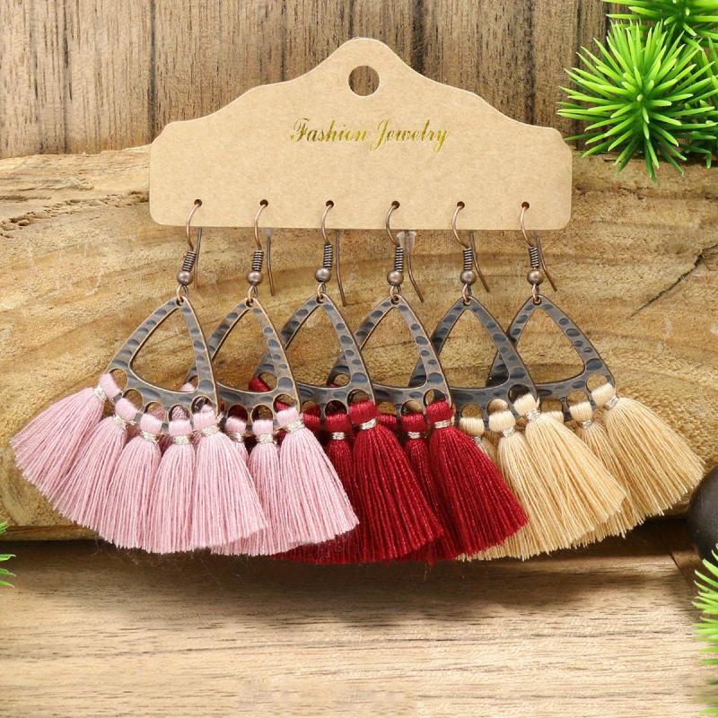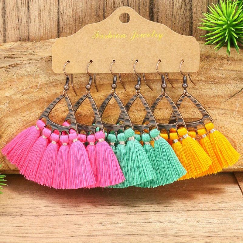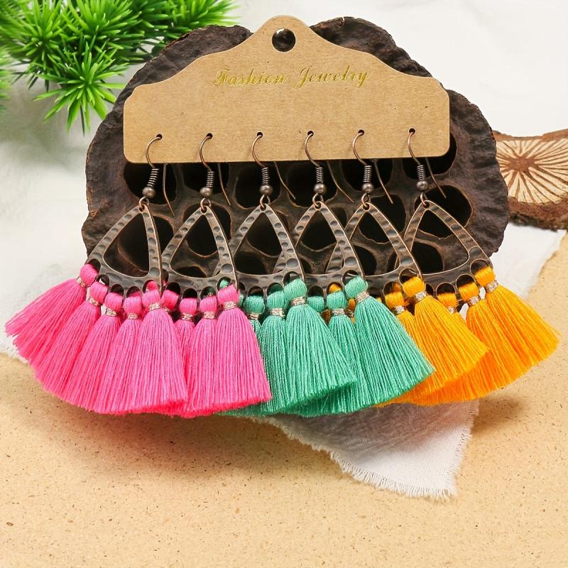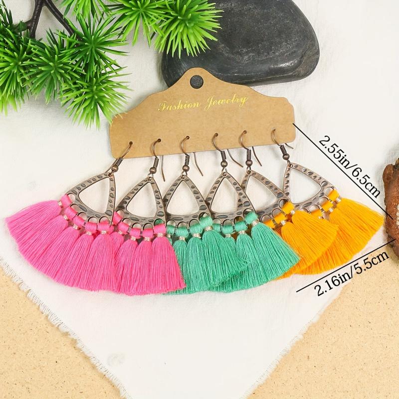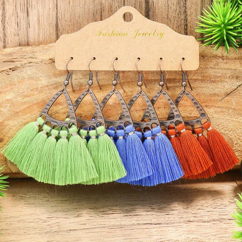 Add a touch of bohemian style to your holiday look with these fan-shaped thread tassel earrings. Each set includes 3 pairs to mix and match for a unique look.