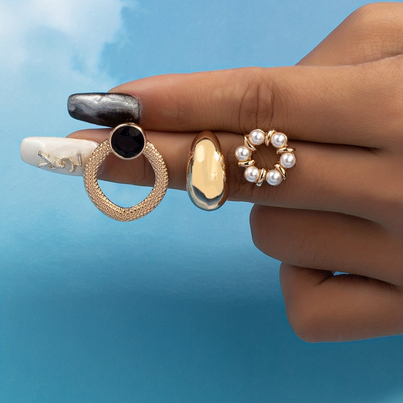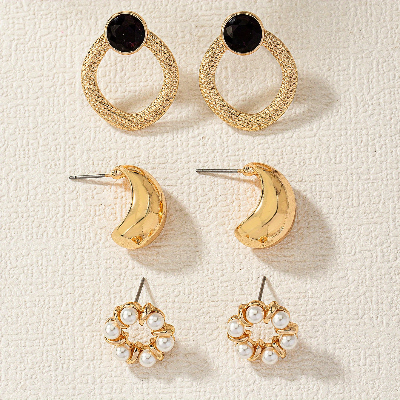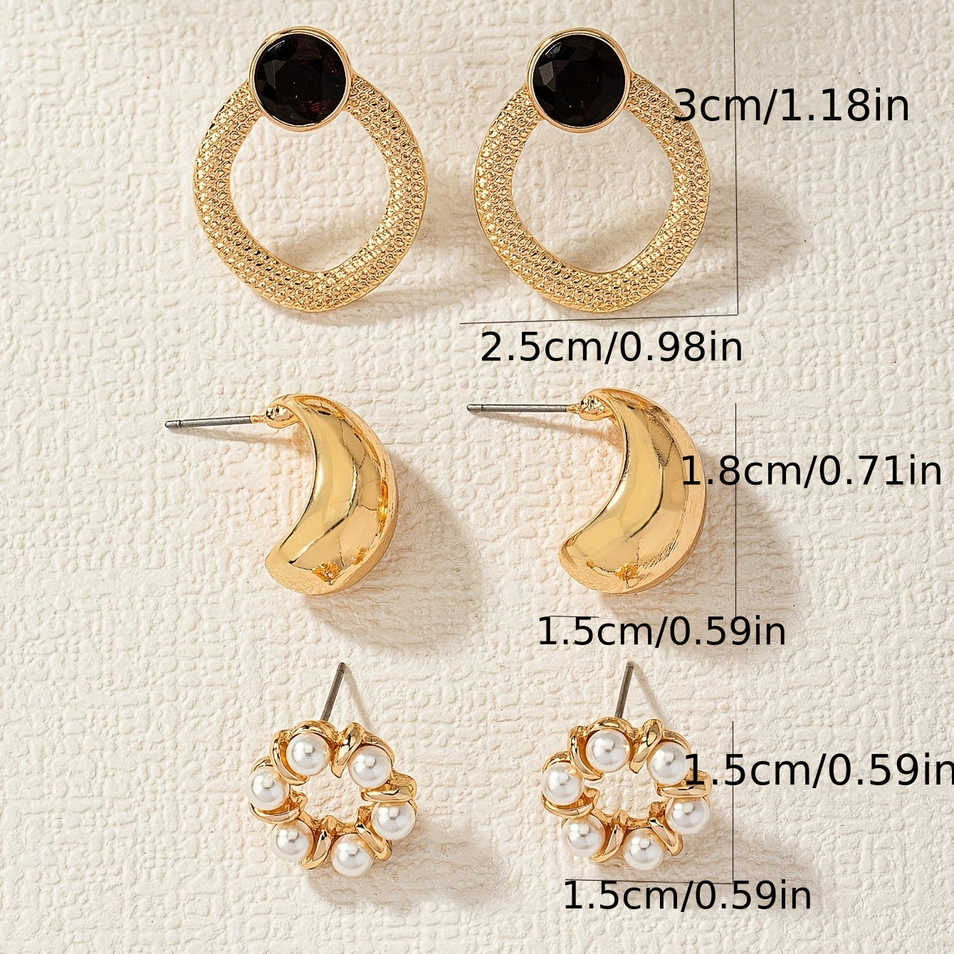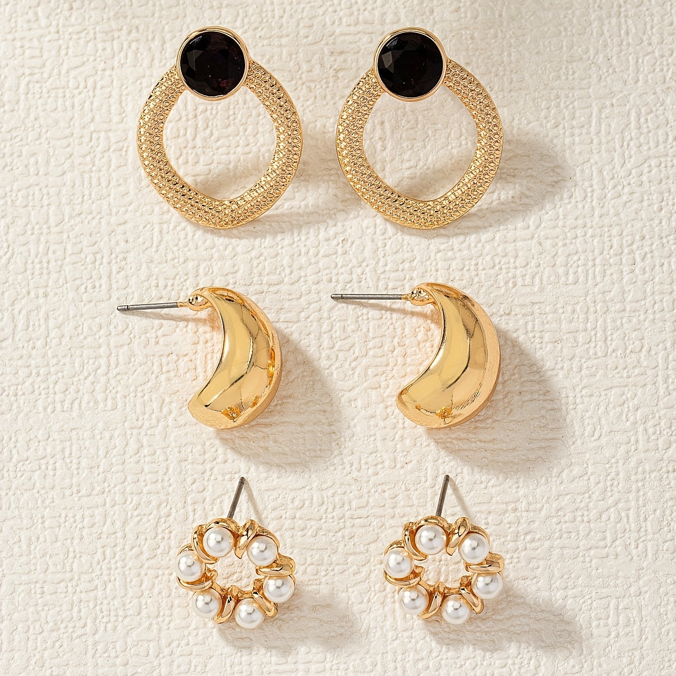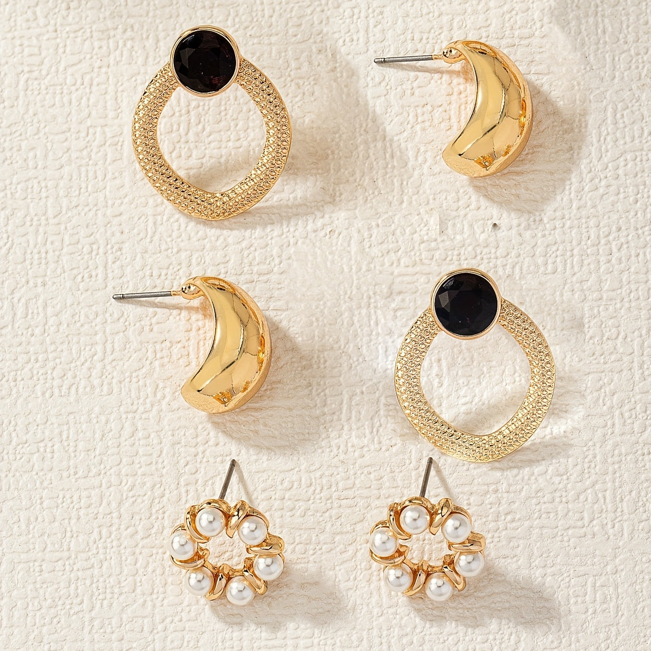 This set of 3 pairs of golden stud earrings features faux pearl and rhinestone decorations, perfect for adding a touch of glamour to any outfit. It makes a great gift for a stylish woman.