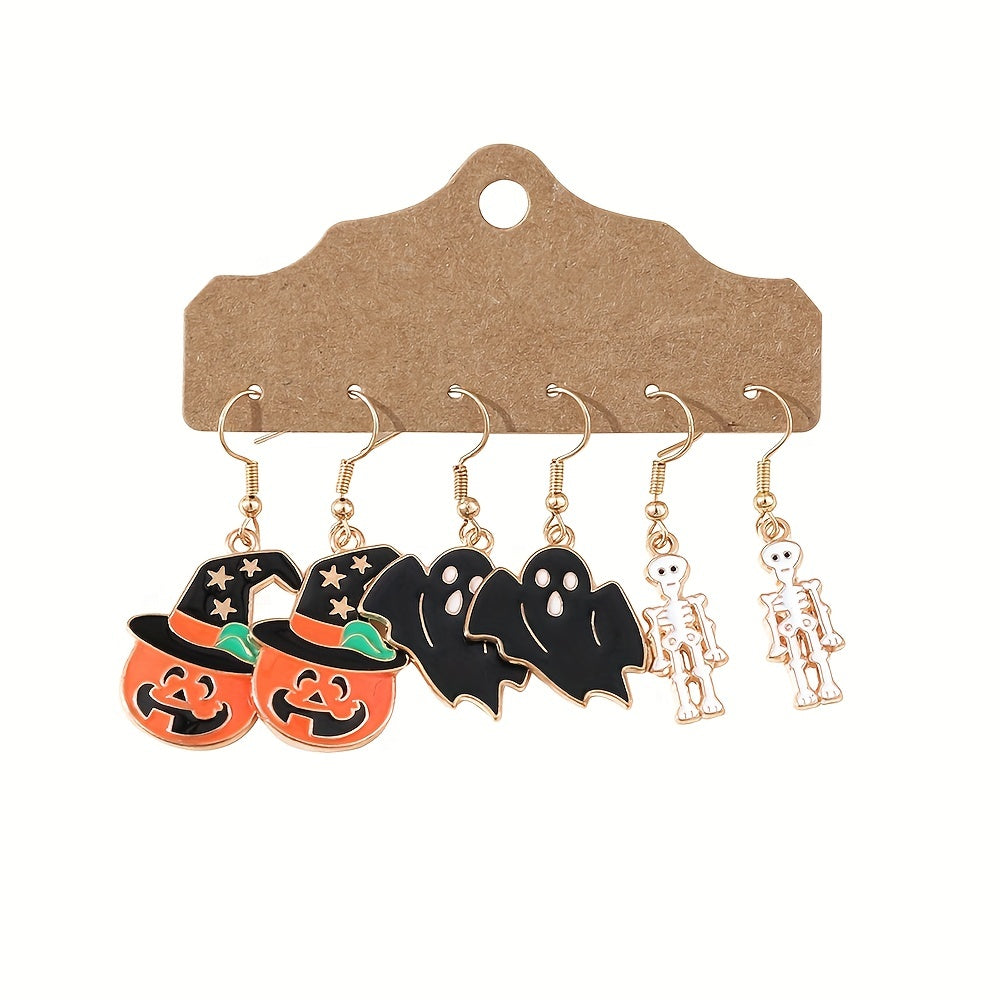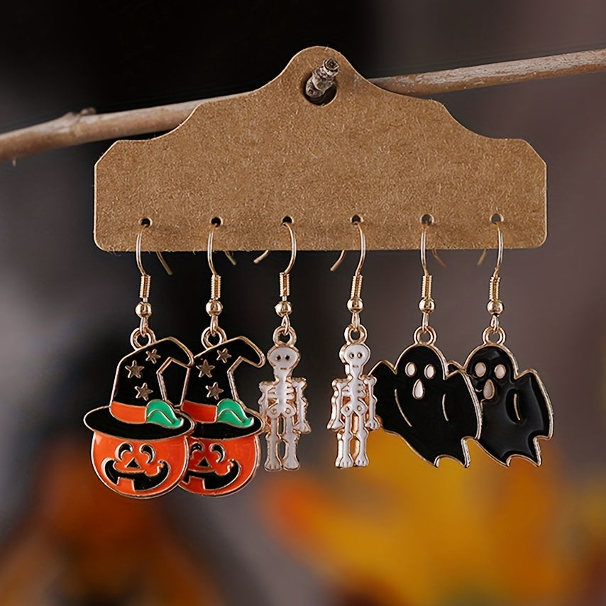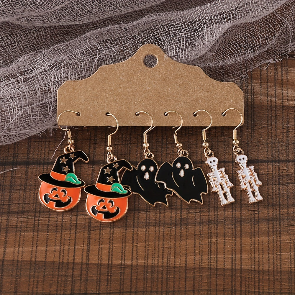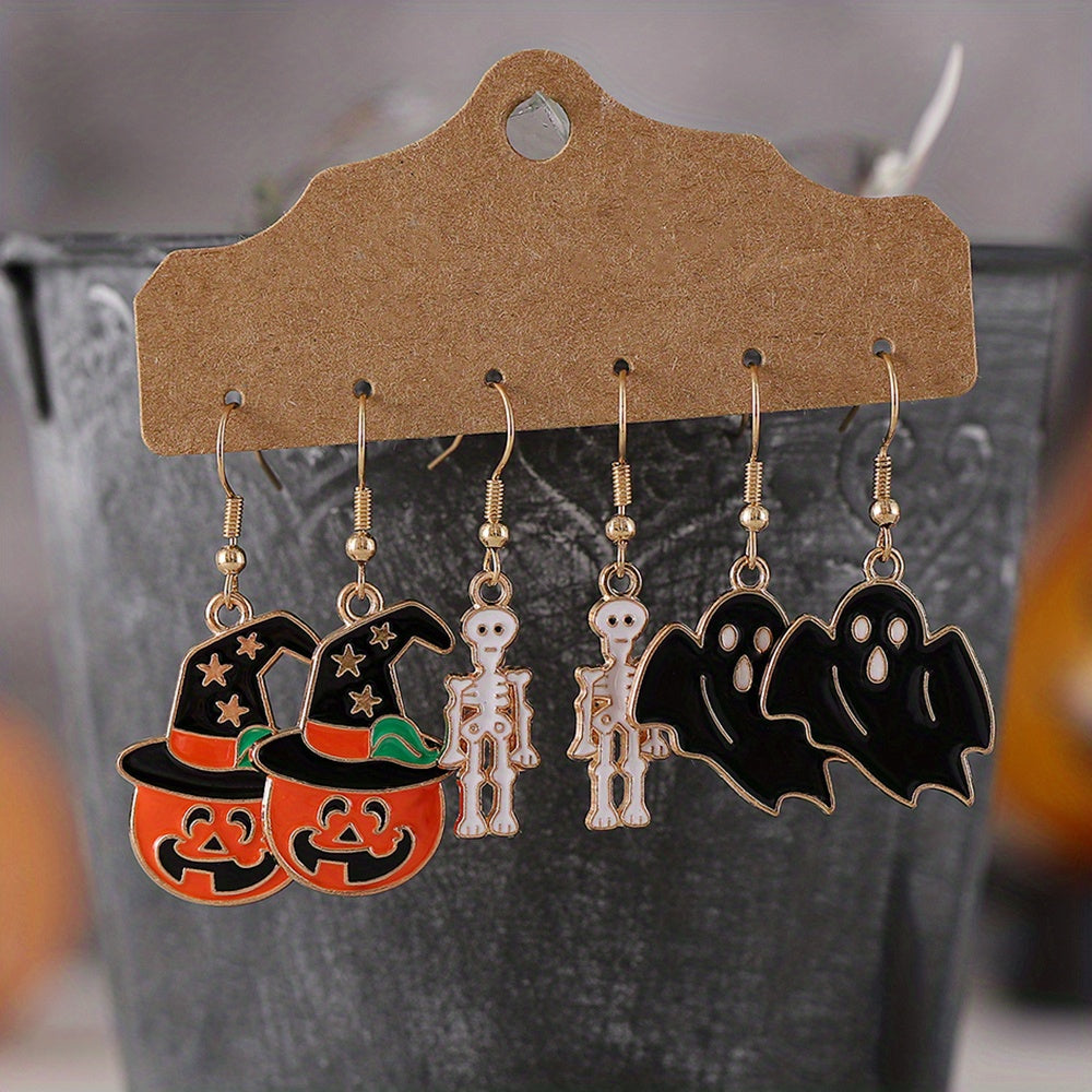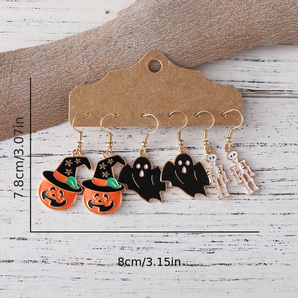 These unique Halloween enamel dangle earrings are perfect for adding a spooky touch to your outfit. Made of zinc alloy, these earrings feature pumpkins, skeletons, and bats in a retro goth style.