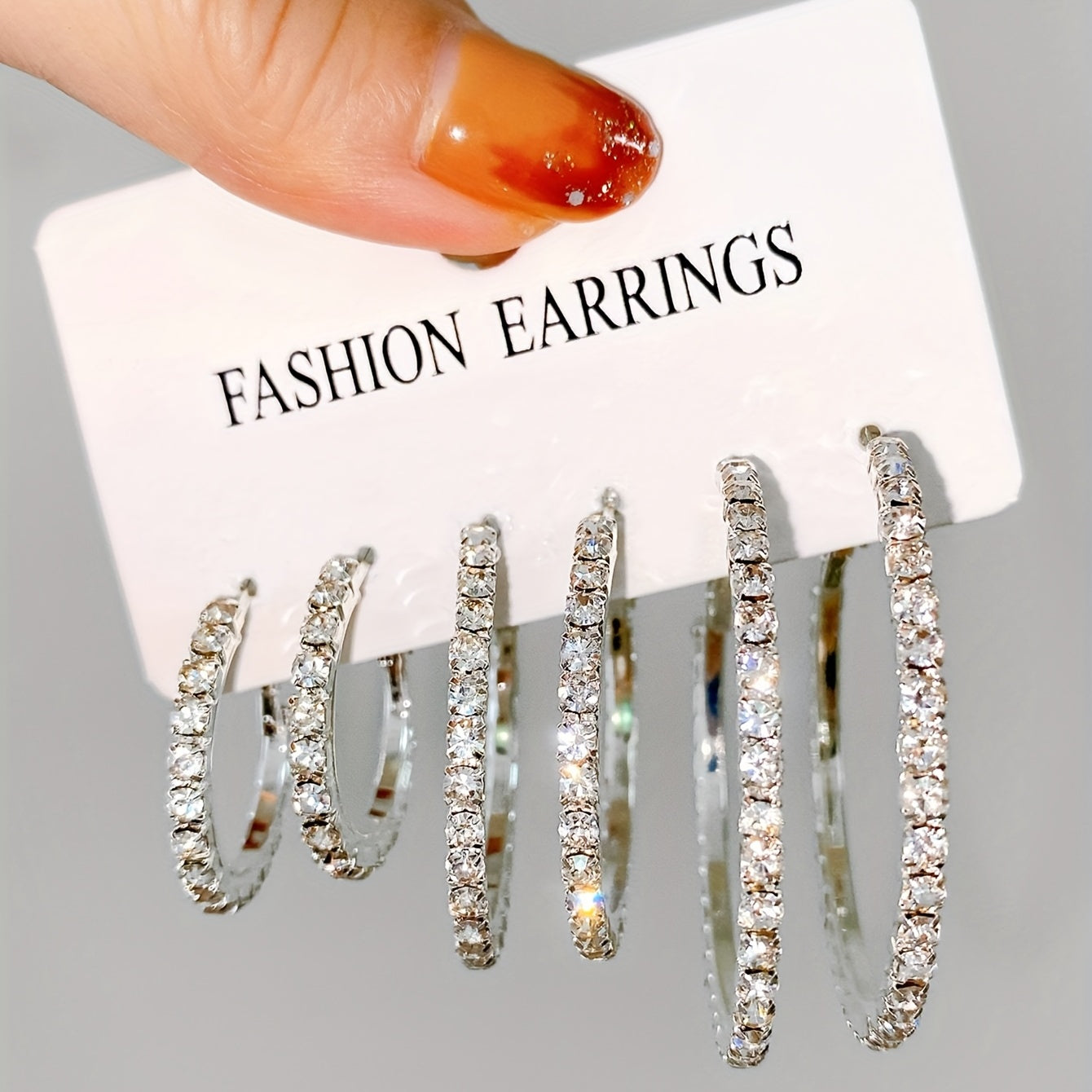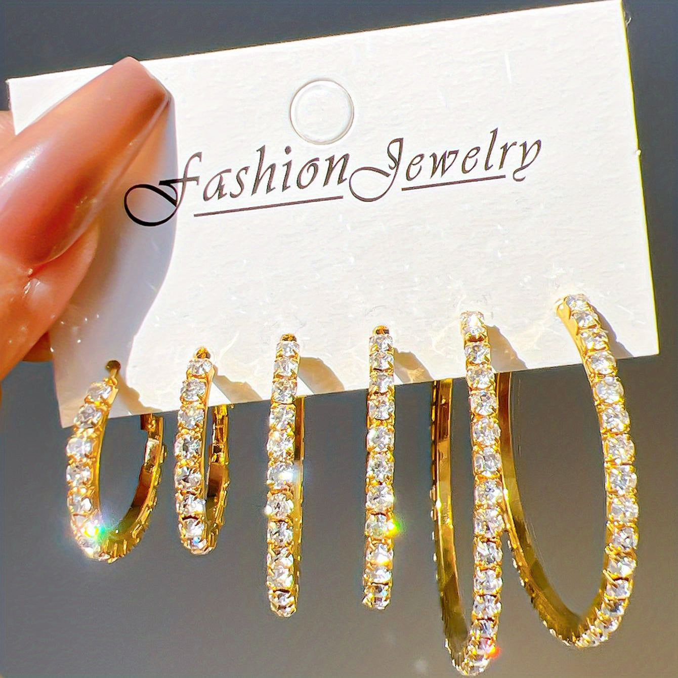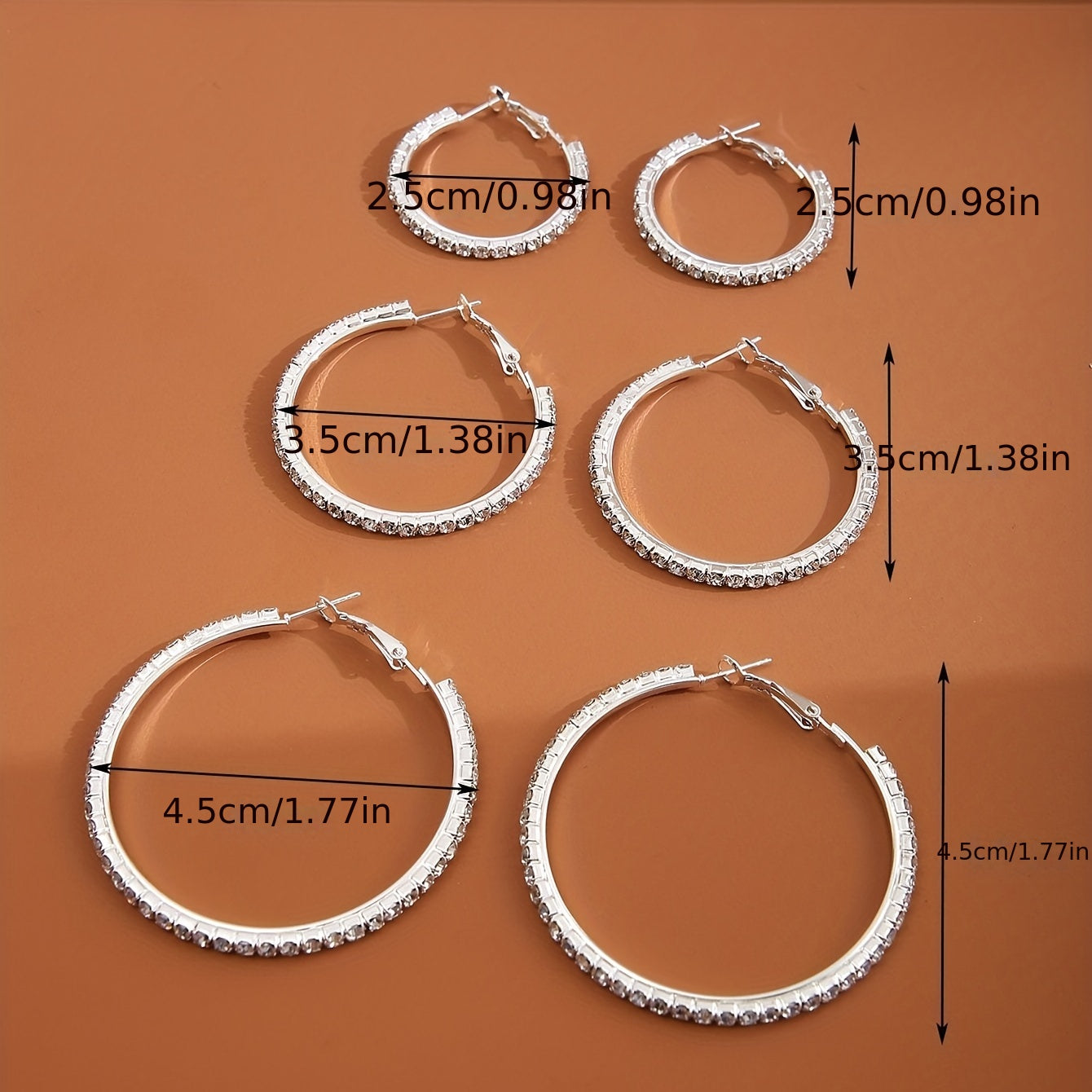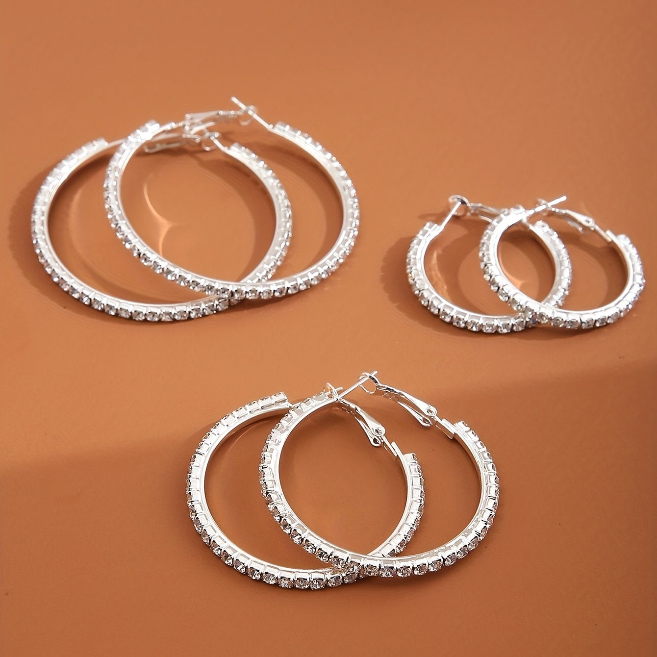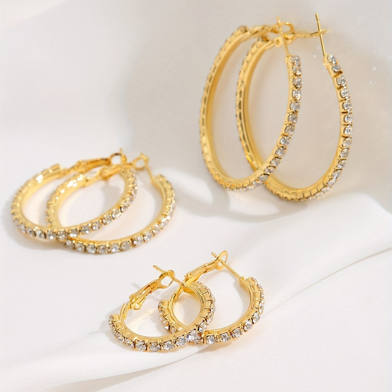 This set includes 3 pairs of hoop earrings in golden and silvery colors, each adorned with full rhinestone decoration. Perfect for adding sparkle to your outfit or as a stylish gift for a female friend or loved one.