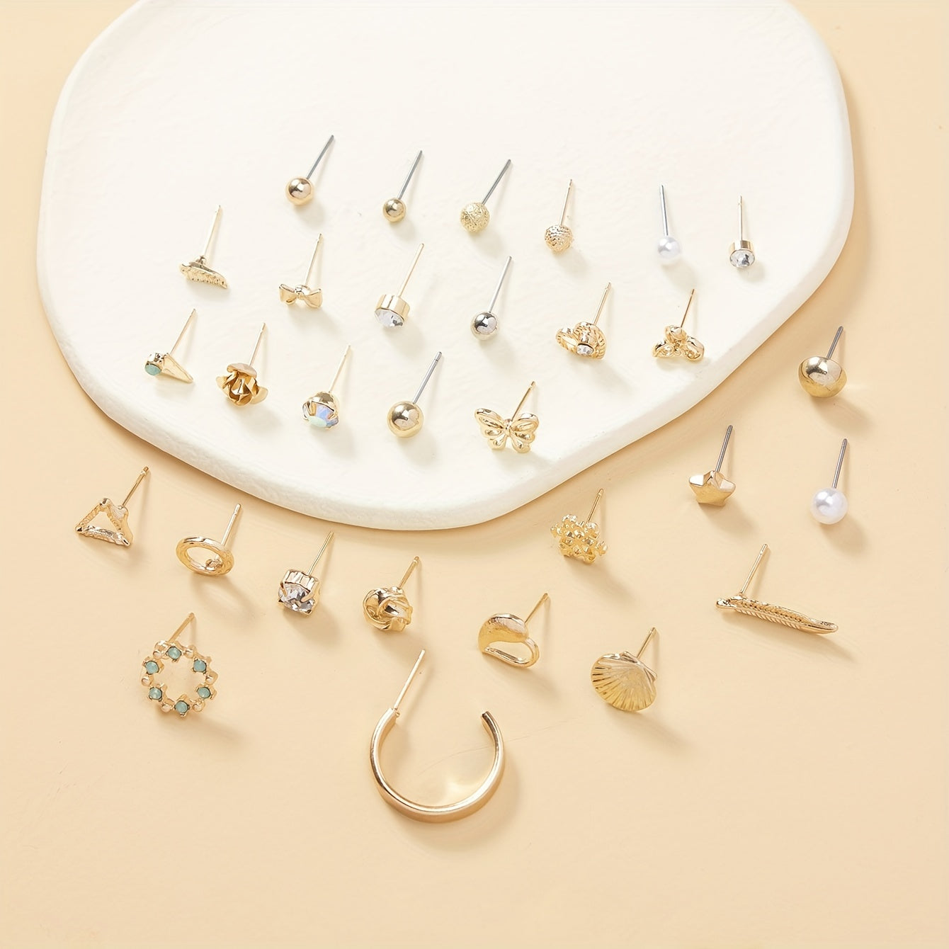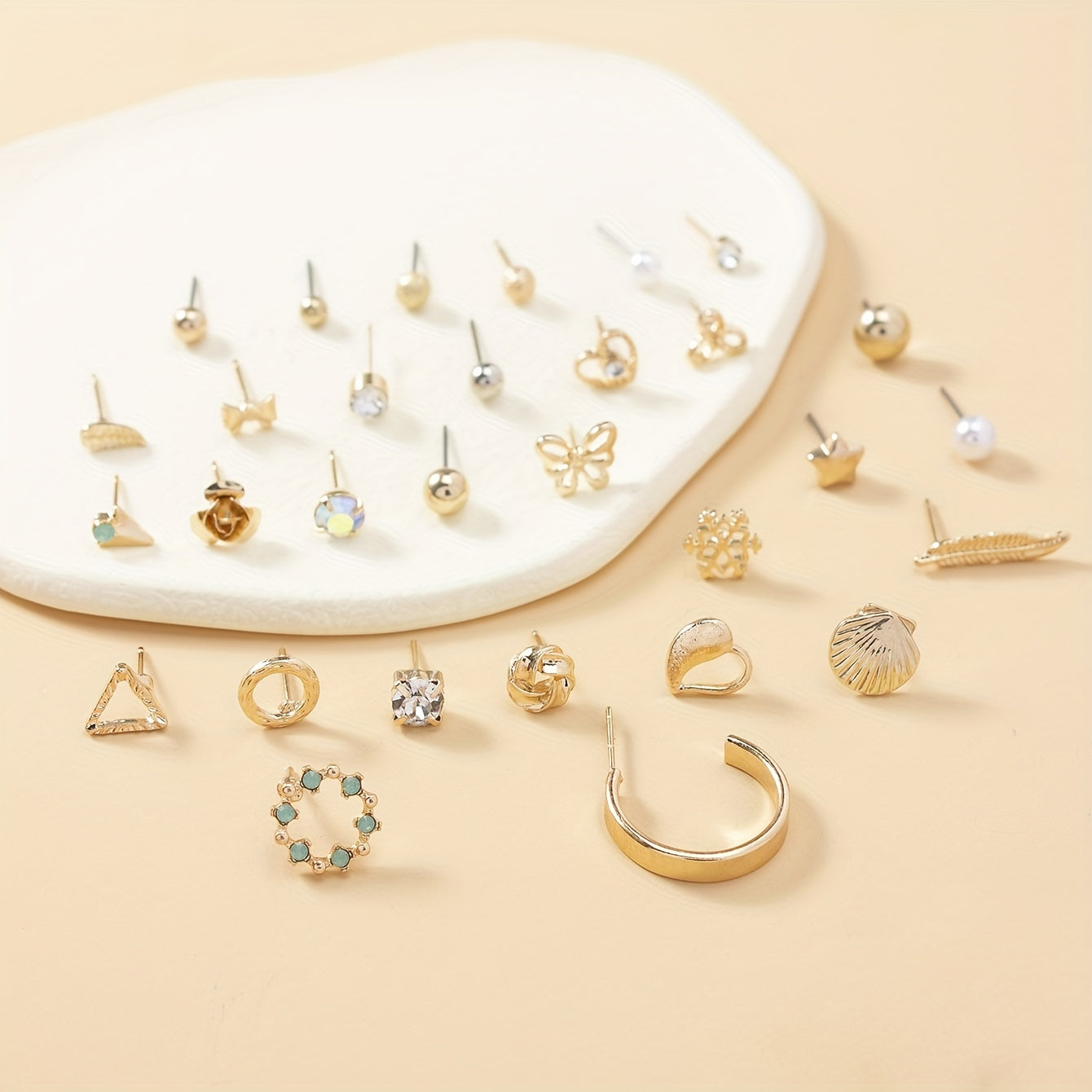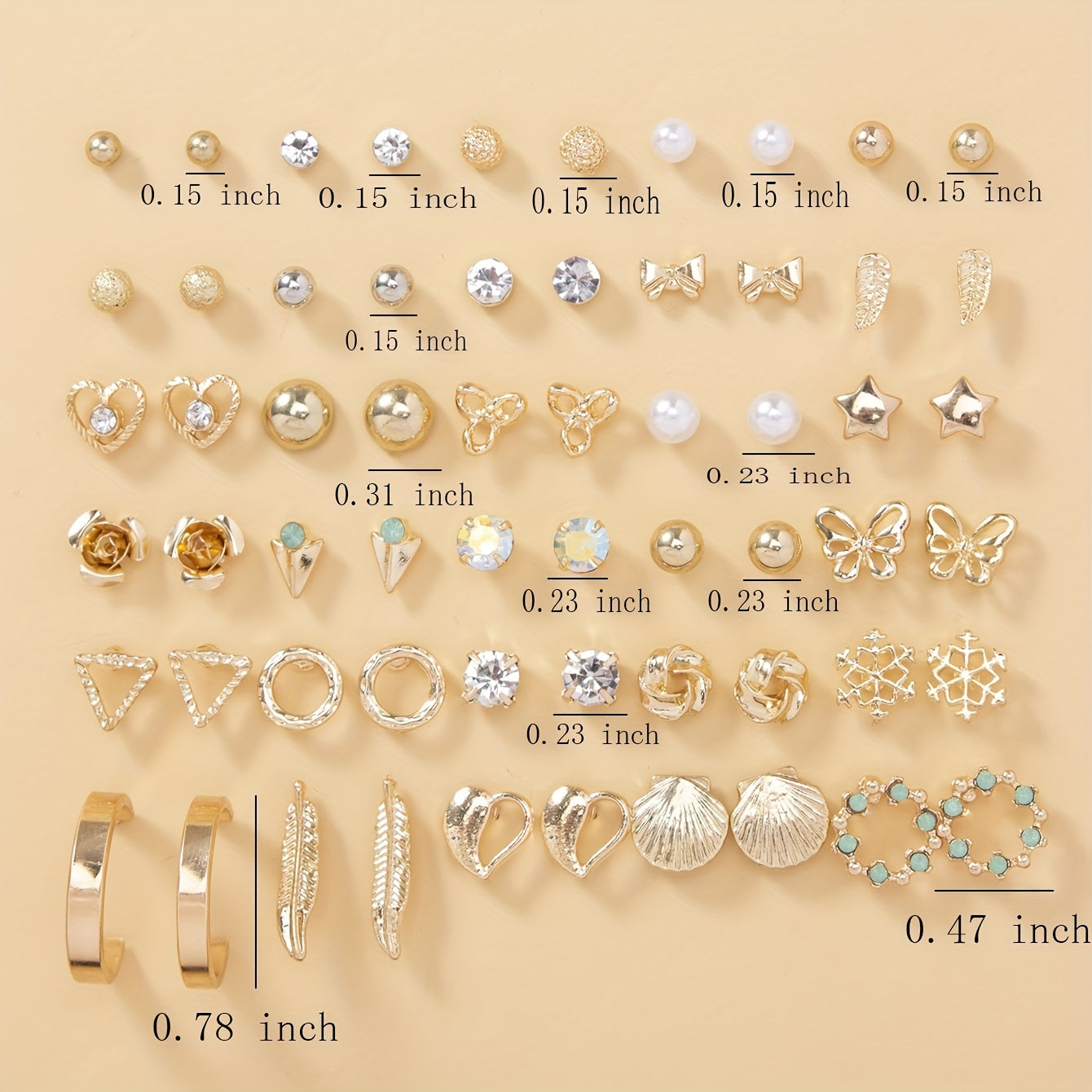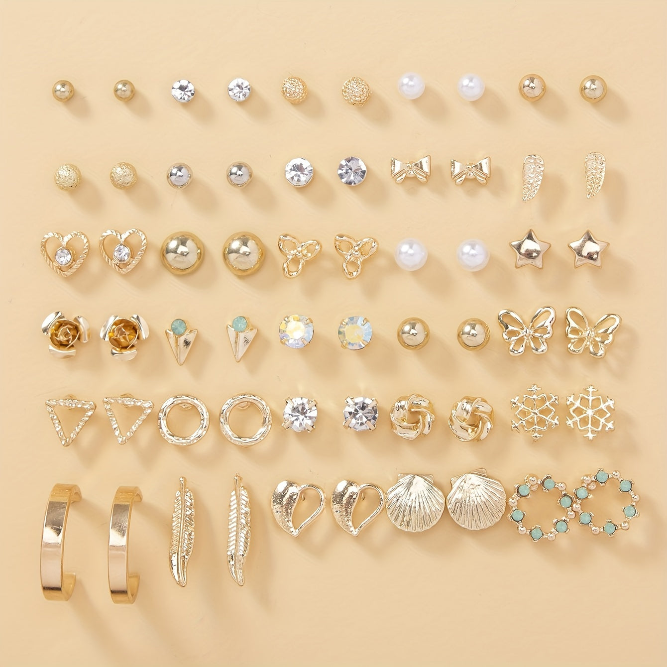 This earring set includes 30 pairs of earrings featuring various designs like love, butterfly, snowflake, shell, and leaf.
