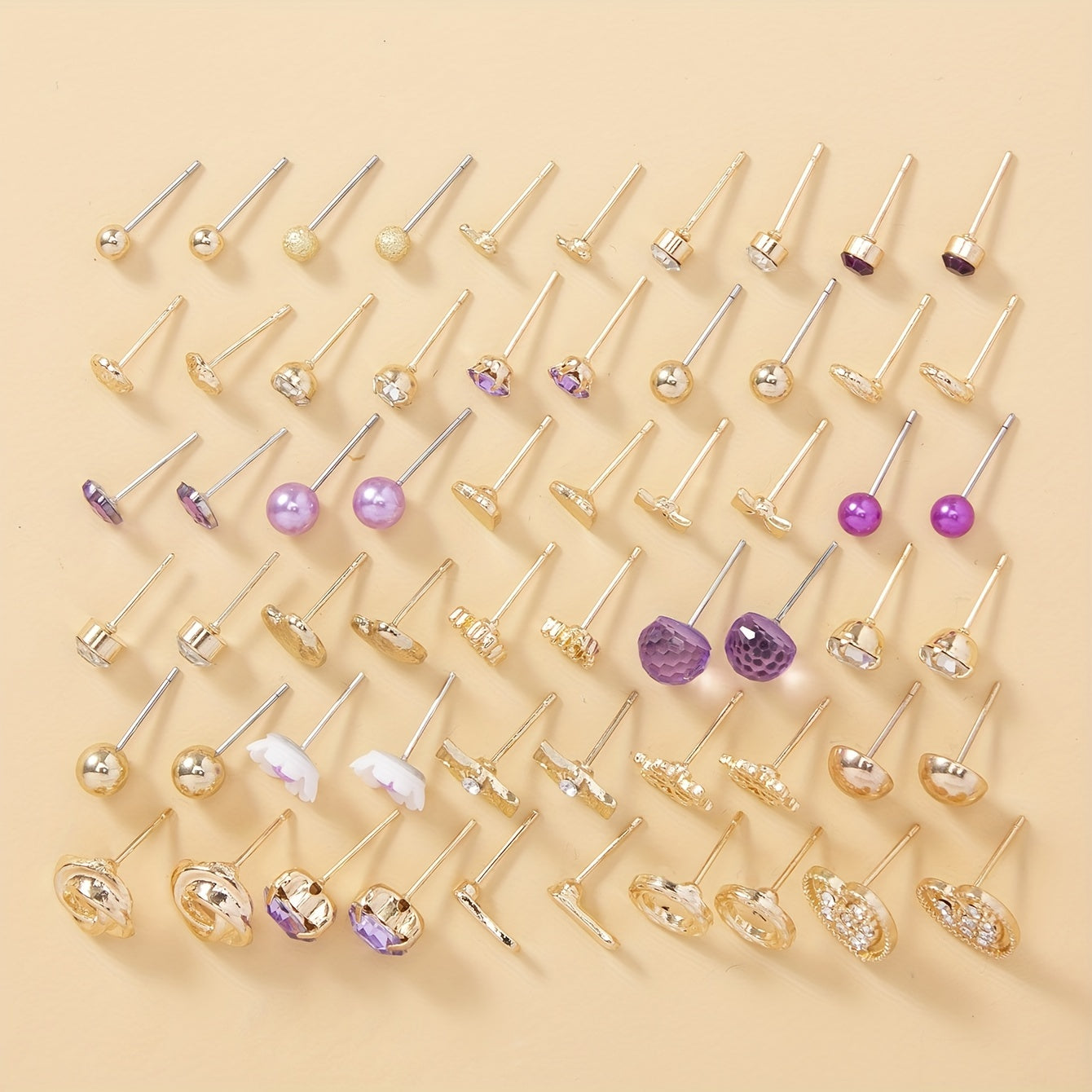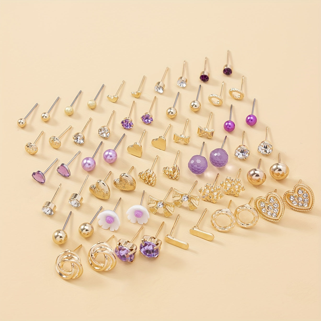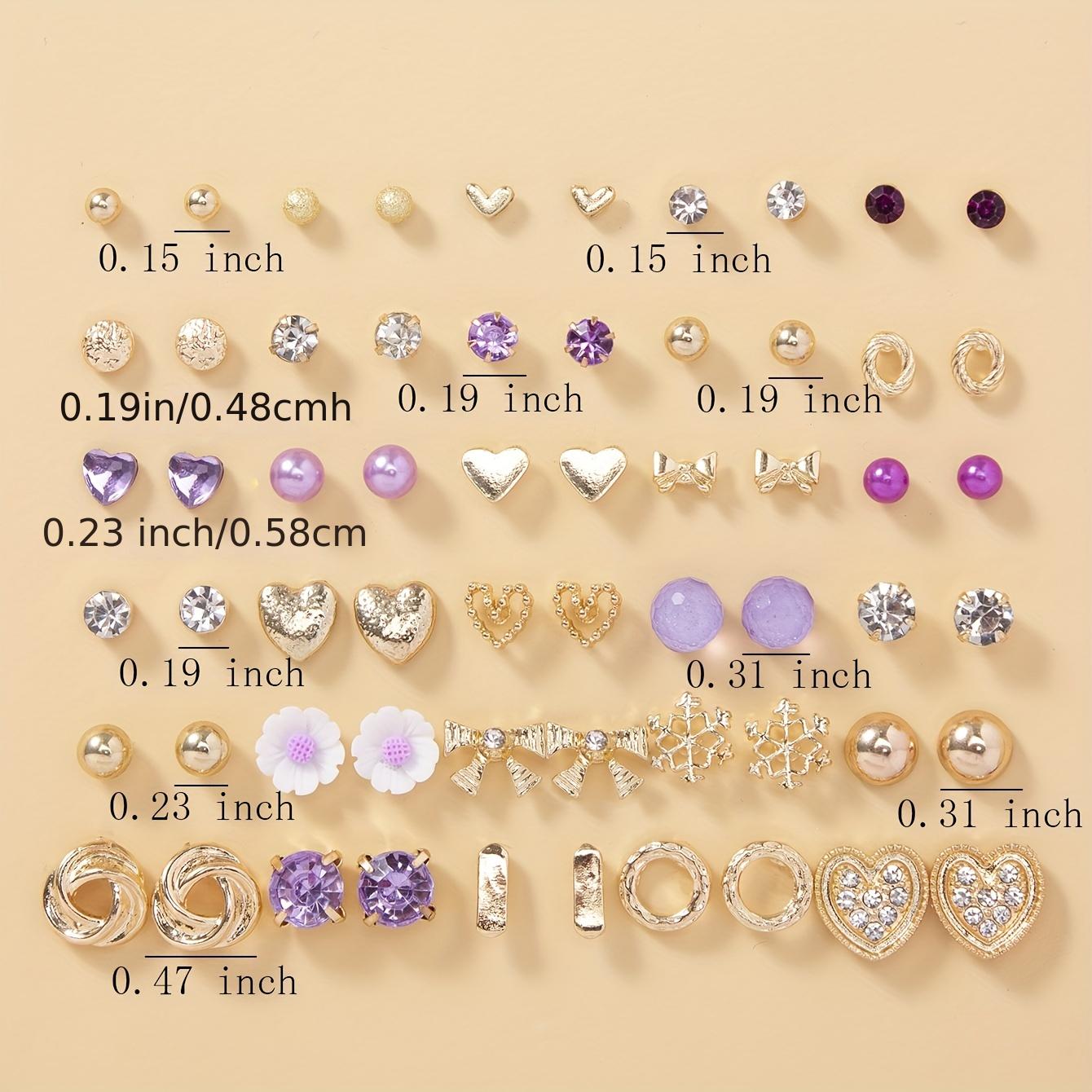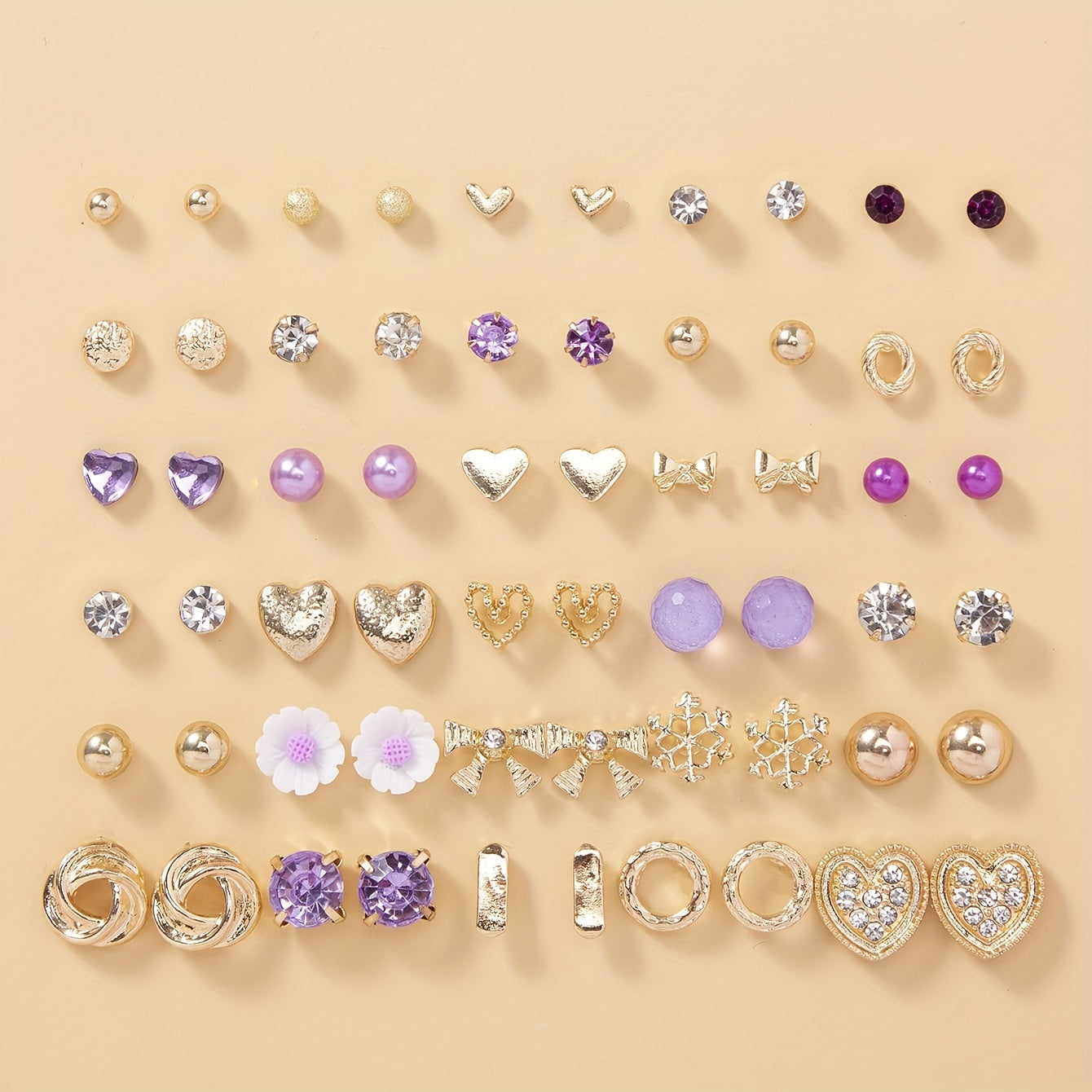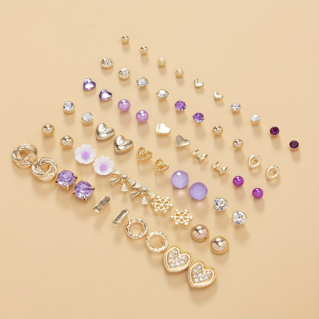 This set includes 30 pairs of assorted stud earrings featuring rhinestones, hearts, flowers, bows, and snowflakes. Perfect for women and girls.