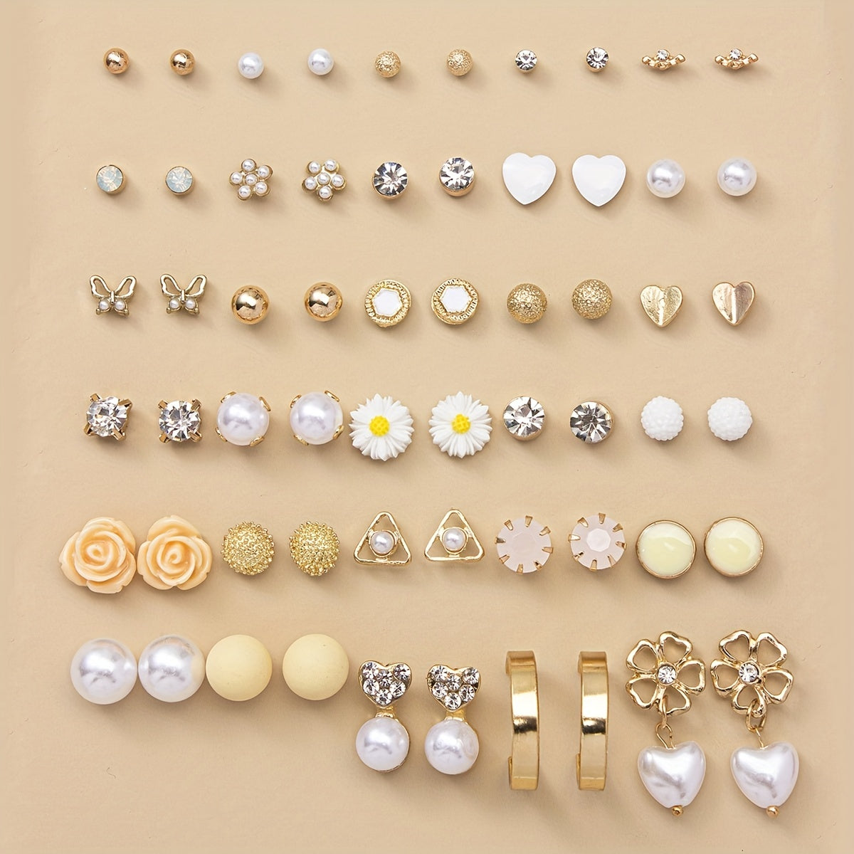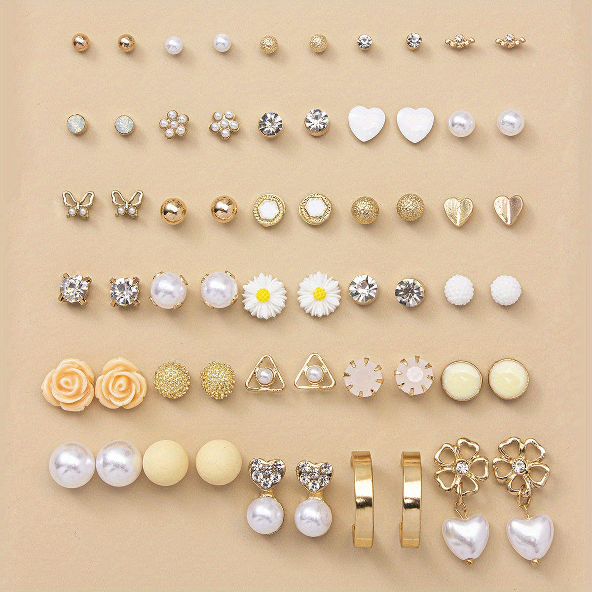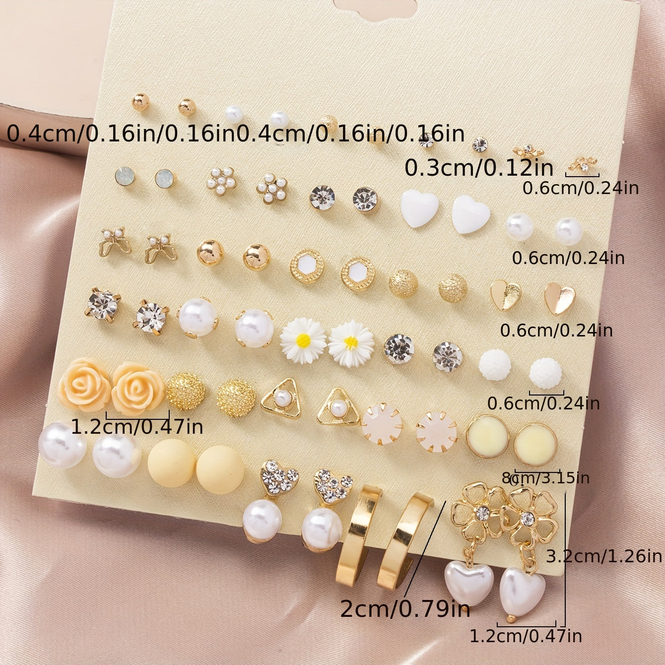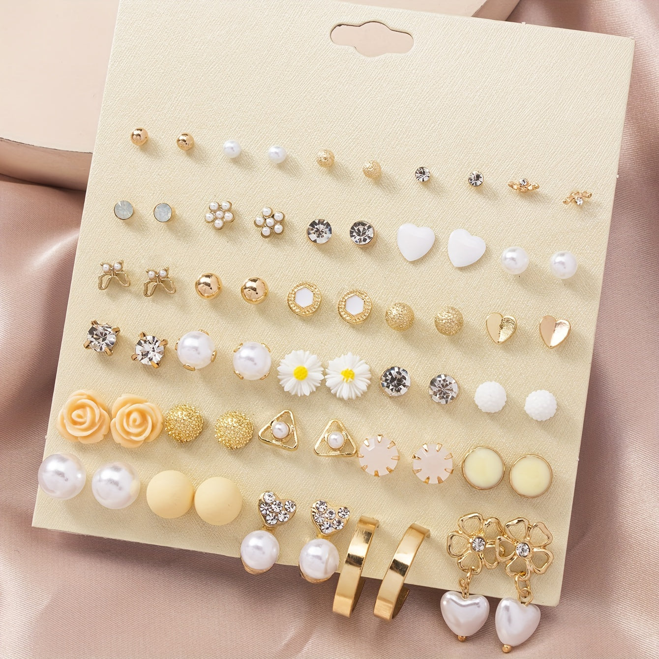 30 Pairs Golden Stud Earrings Set Faux Pearl Rhinestone Decor Jewelry Daily