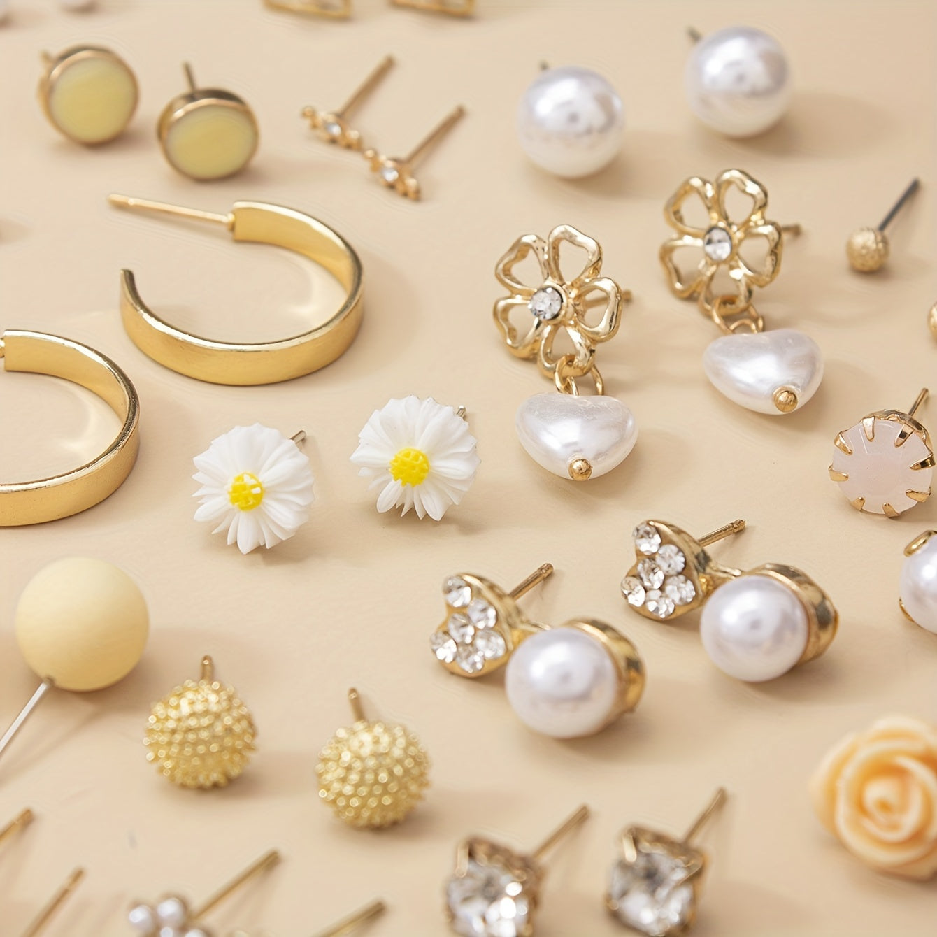 Complete your look with this 30 pairs set of golden stud earrings featuring flower, faux pearl, and rhinestone decoration. Made with zinc alloy, perfect for daily and casual wear.