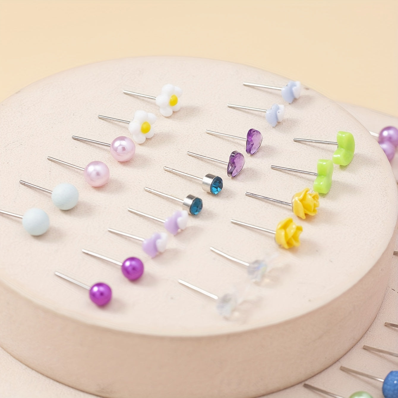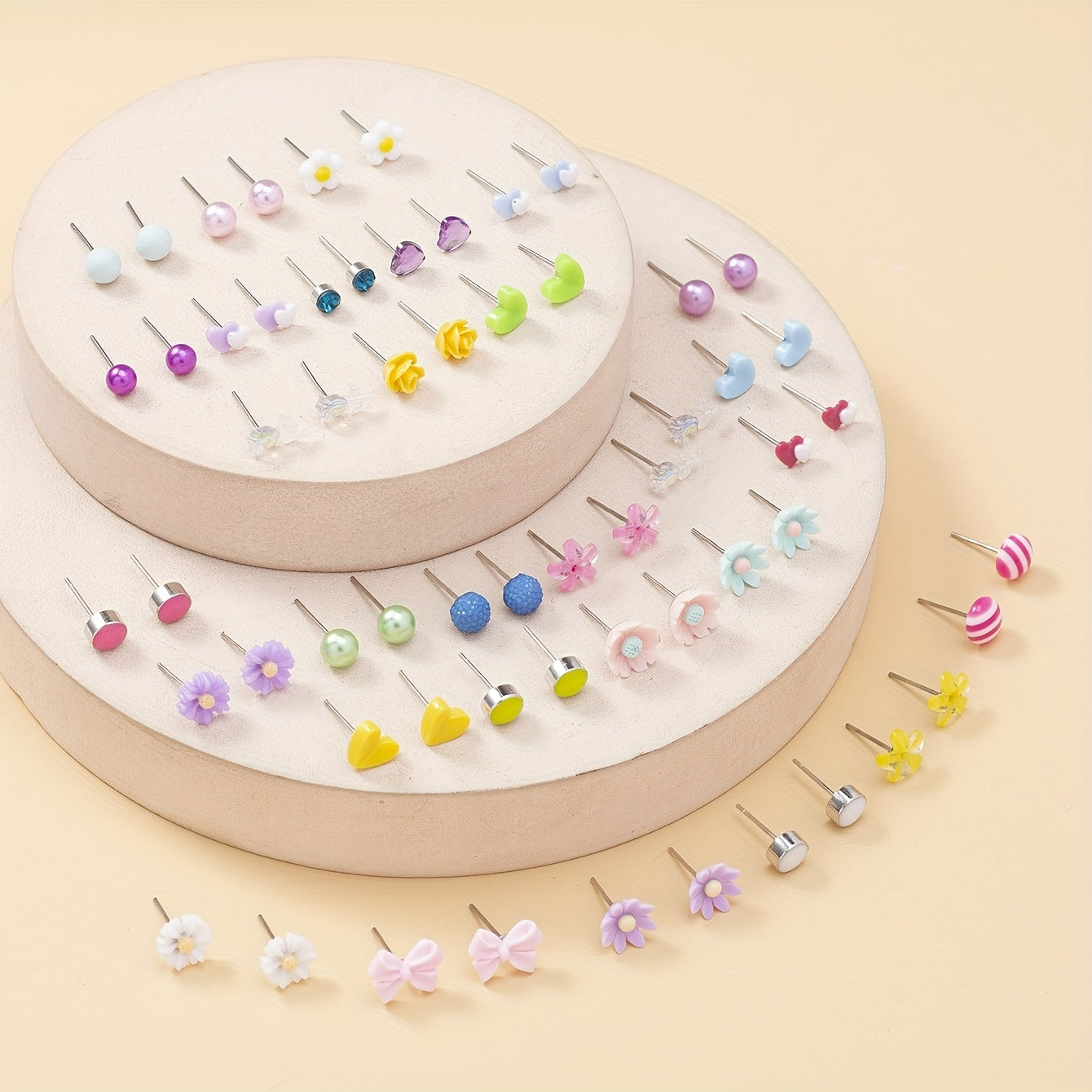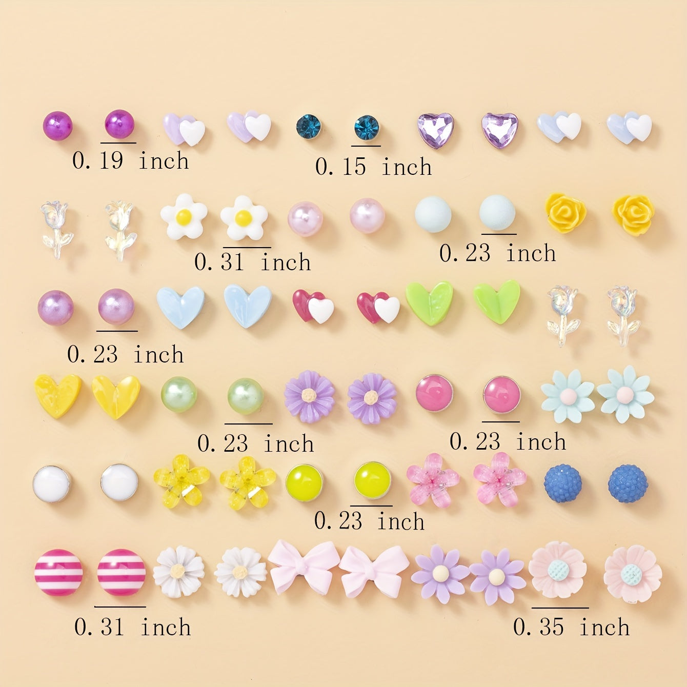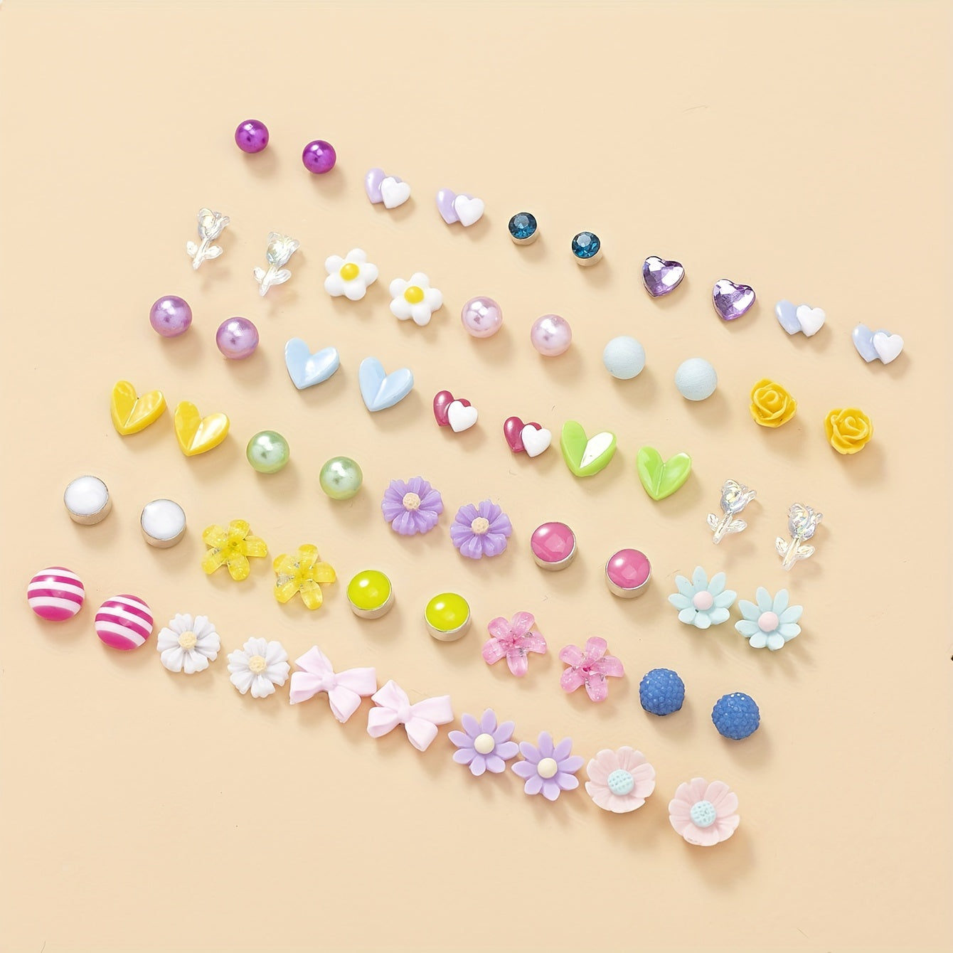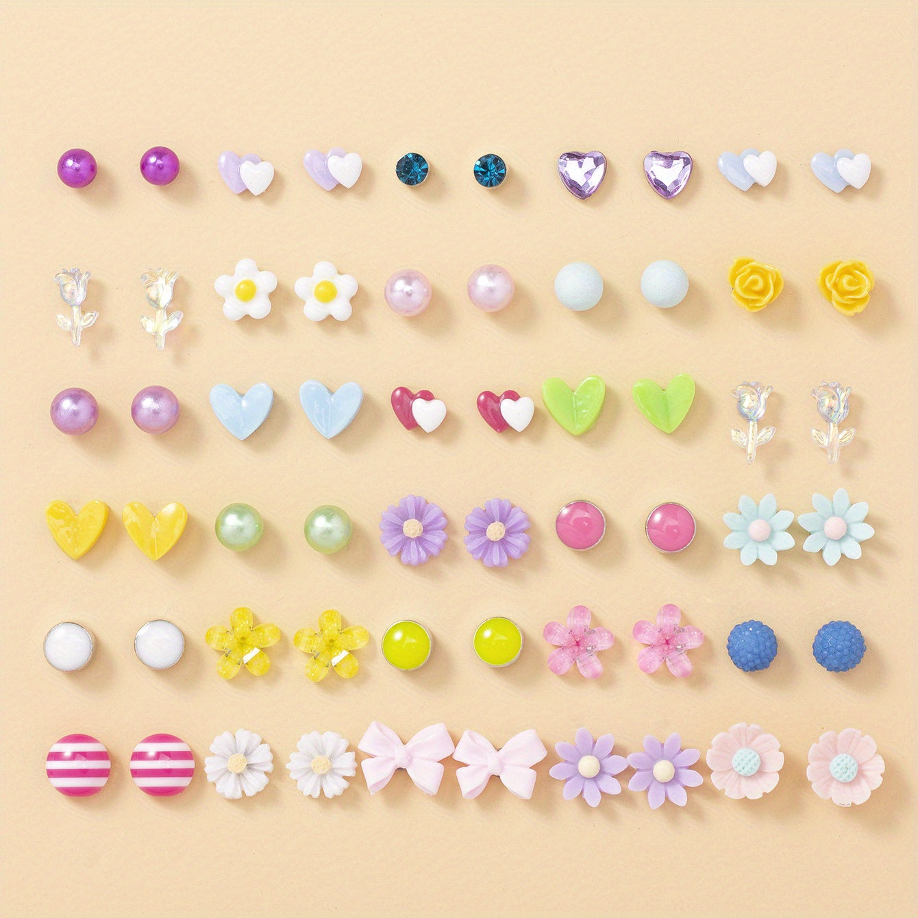 Beautiful set of 30 pairs of stud earrings featuring hearts, flowers, and roses. Perfect for gifting or adding to your own jewelry collection.