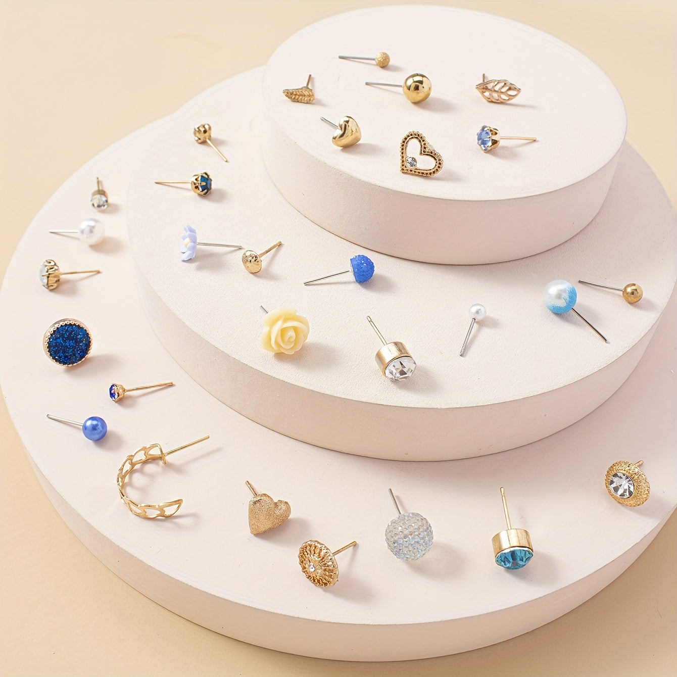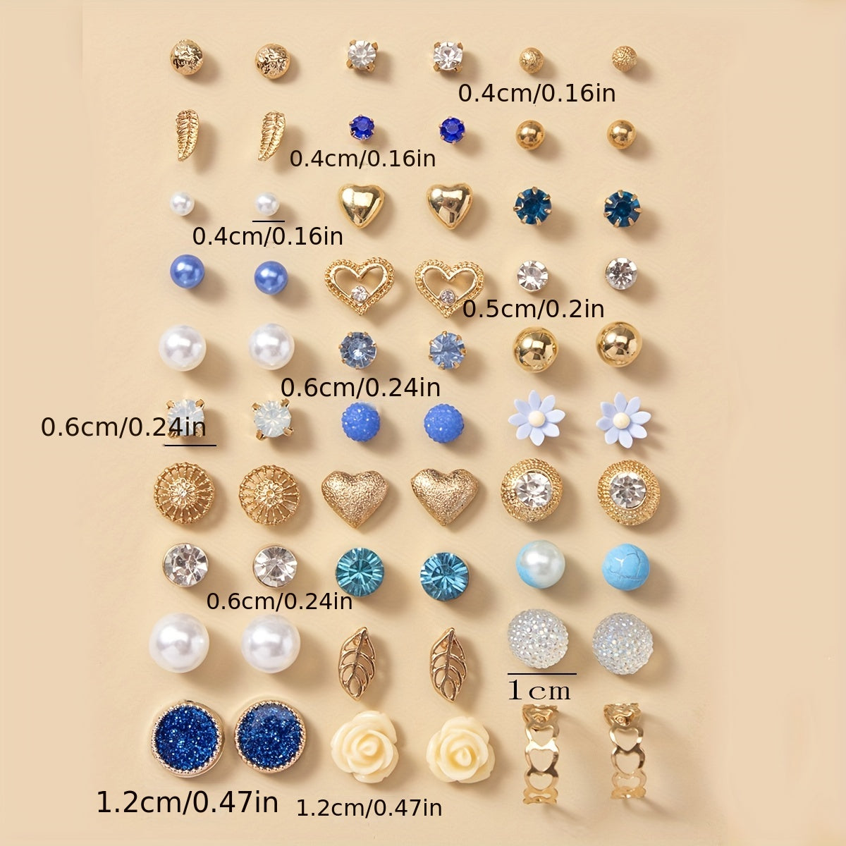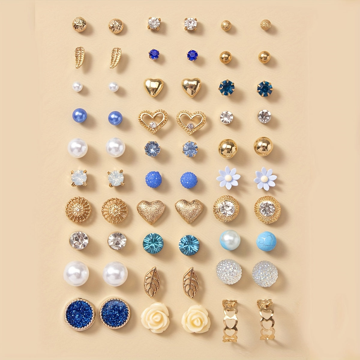 This set of 30 pairs stud earrings features a mix of faux pearl, rhinestone, flower, and leaf decorations. These versatile ornaments are perfect for adding style to any outfit.