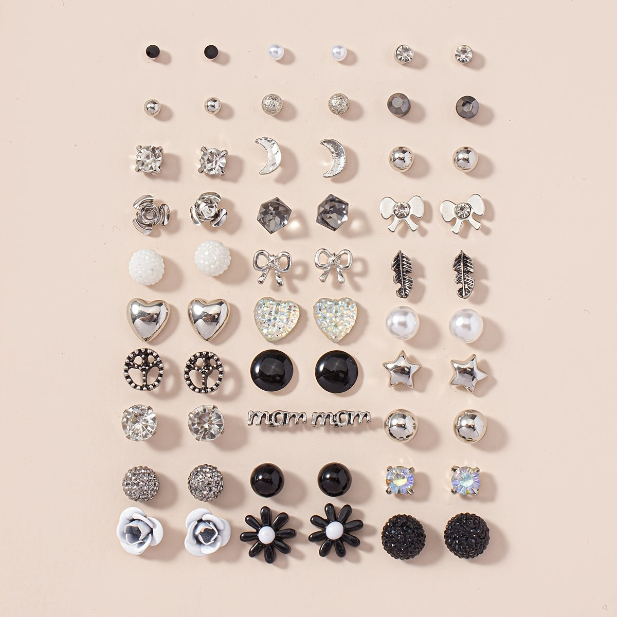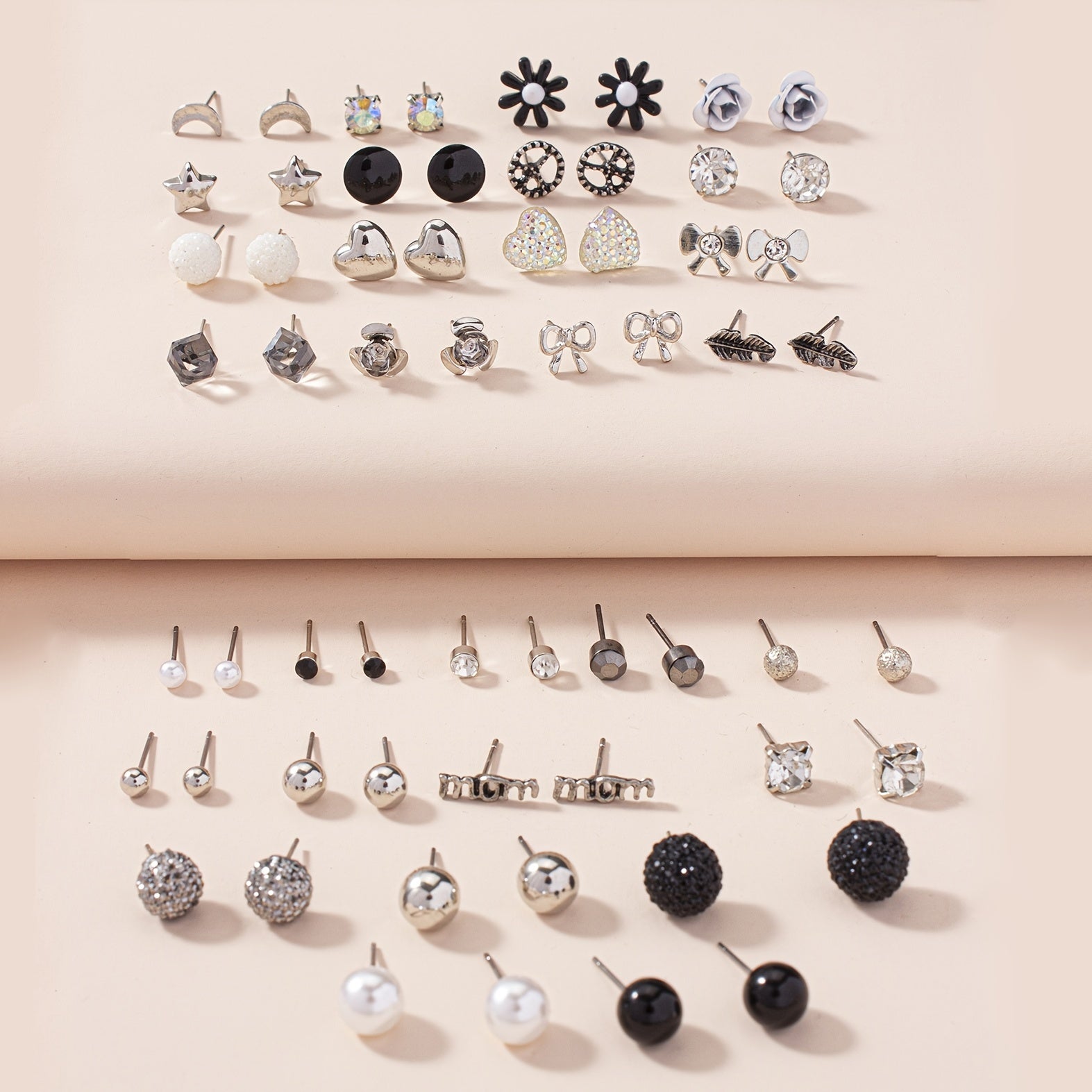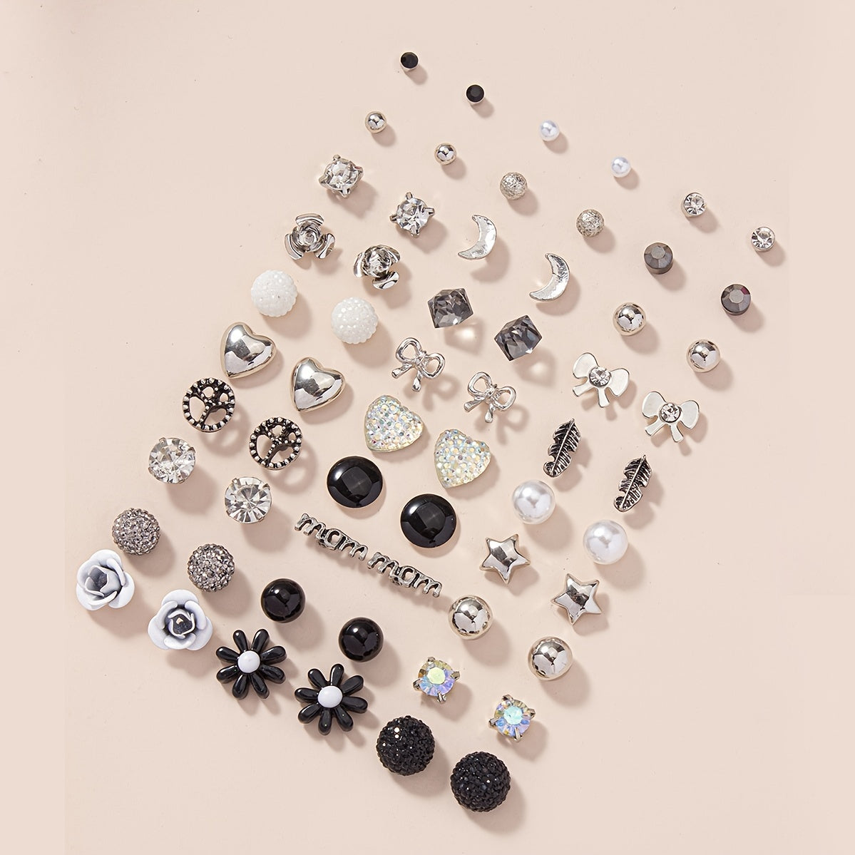 This set includes 30 pairs of beautiful stud earrings featuring various designs including letters, crystals, bows, leaves, and flowers. Perfect gift for women.