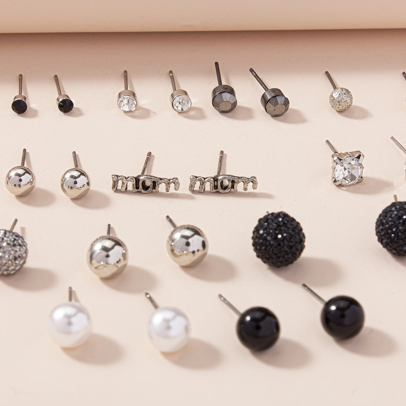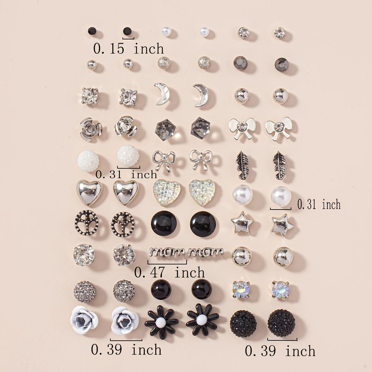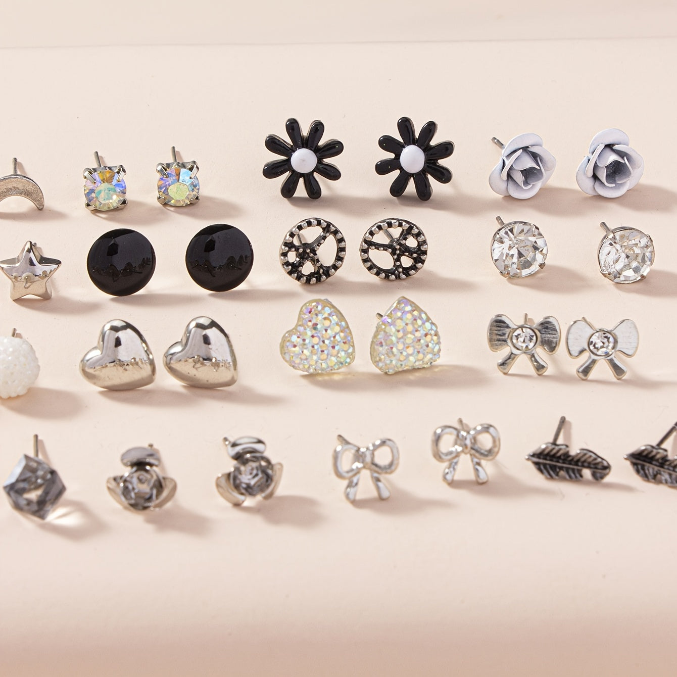 This set includes 30 pairs of beautiful stud earrings featuring various designs including letters, crystals, bows, leaves, and flowers. Perfect gift for women.