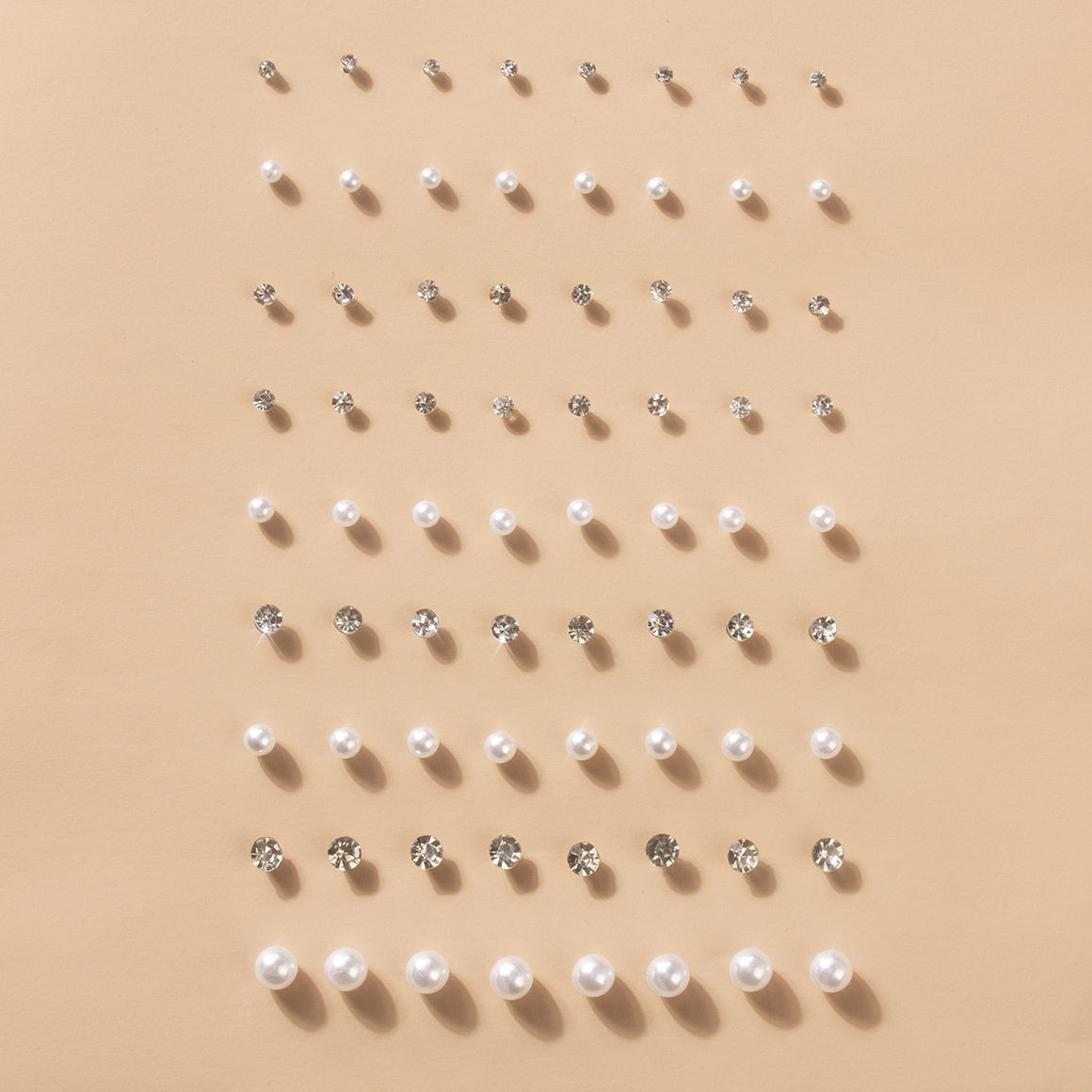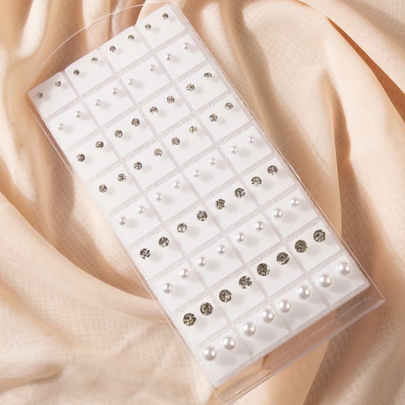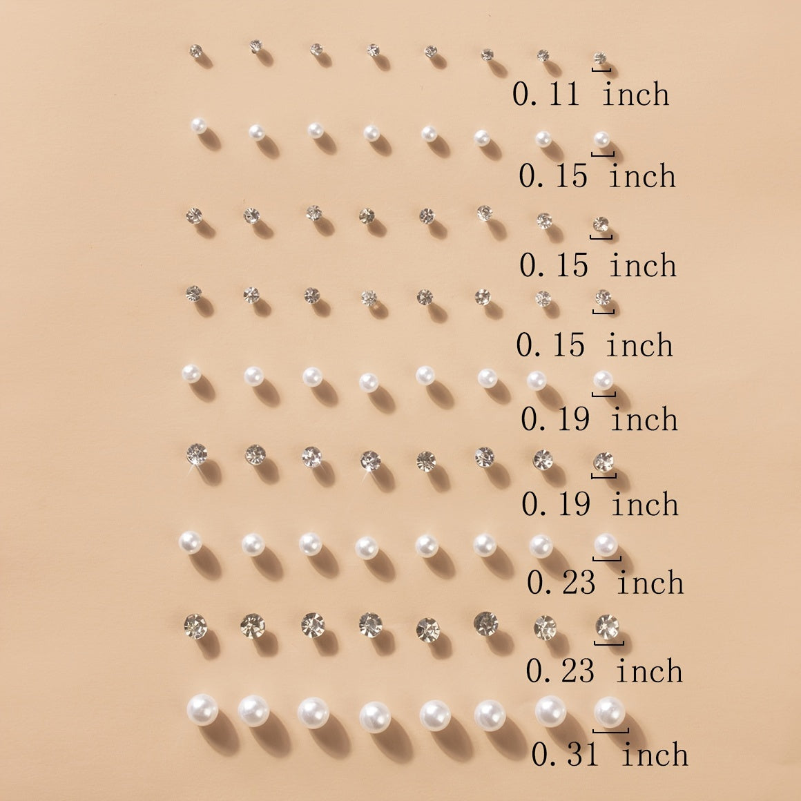 Enhance your daily look with this set of 36 pairs of faux pearl and crystal stud earrings. Perfect for adding a touch of elegance to any outfit.