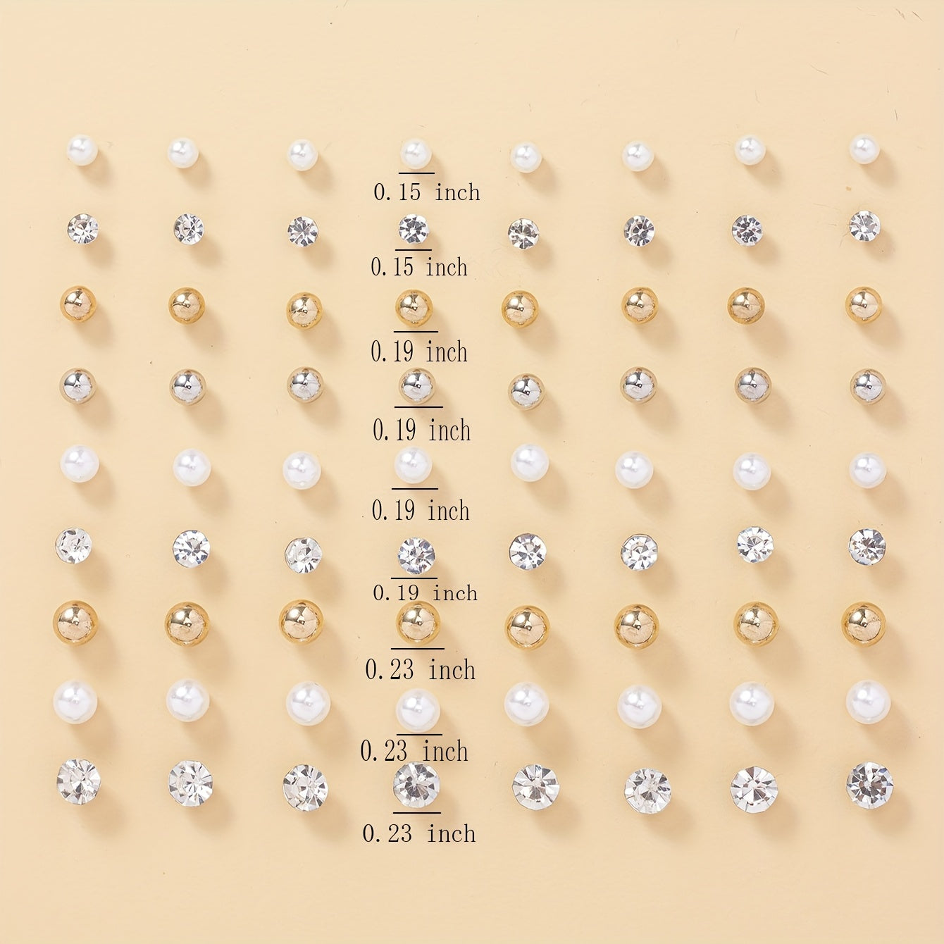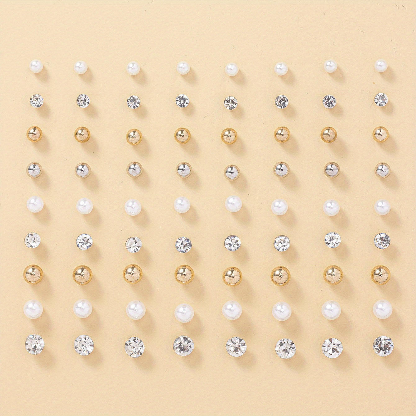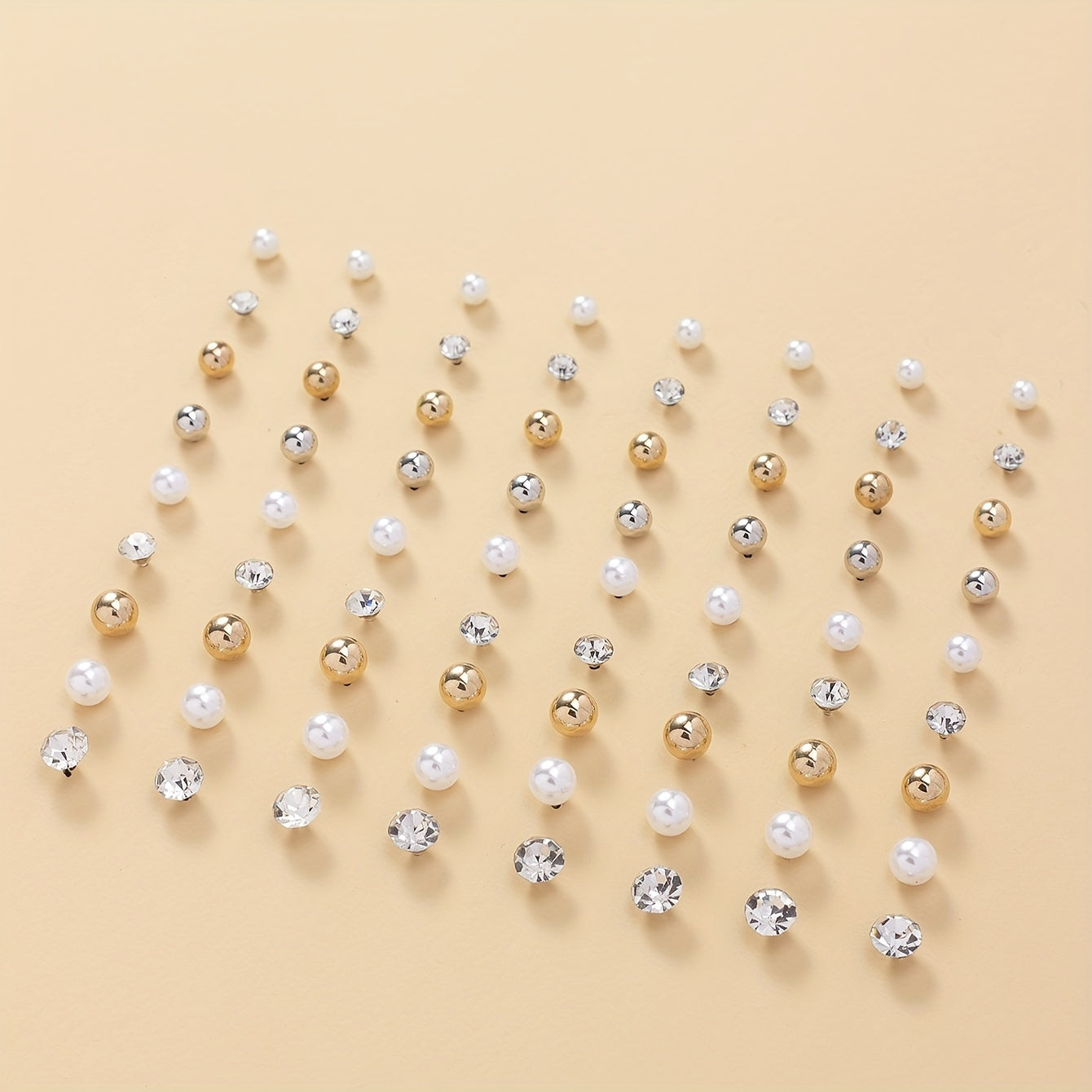 These stud earrings are perfect for adding a touch of elegance to any outfit. The set includes 36 pairs featuring rhinestone and faux pearl beads. Ideal as a gift for women who love minimalist style.