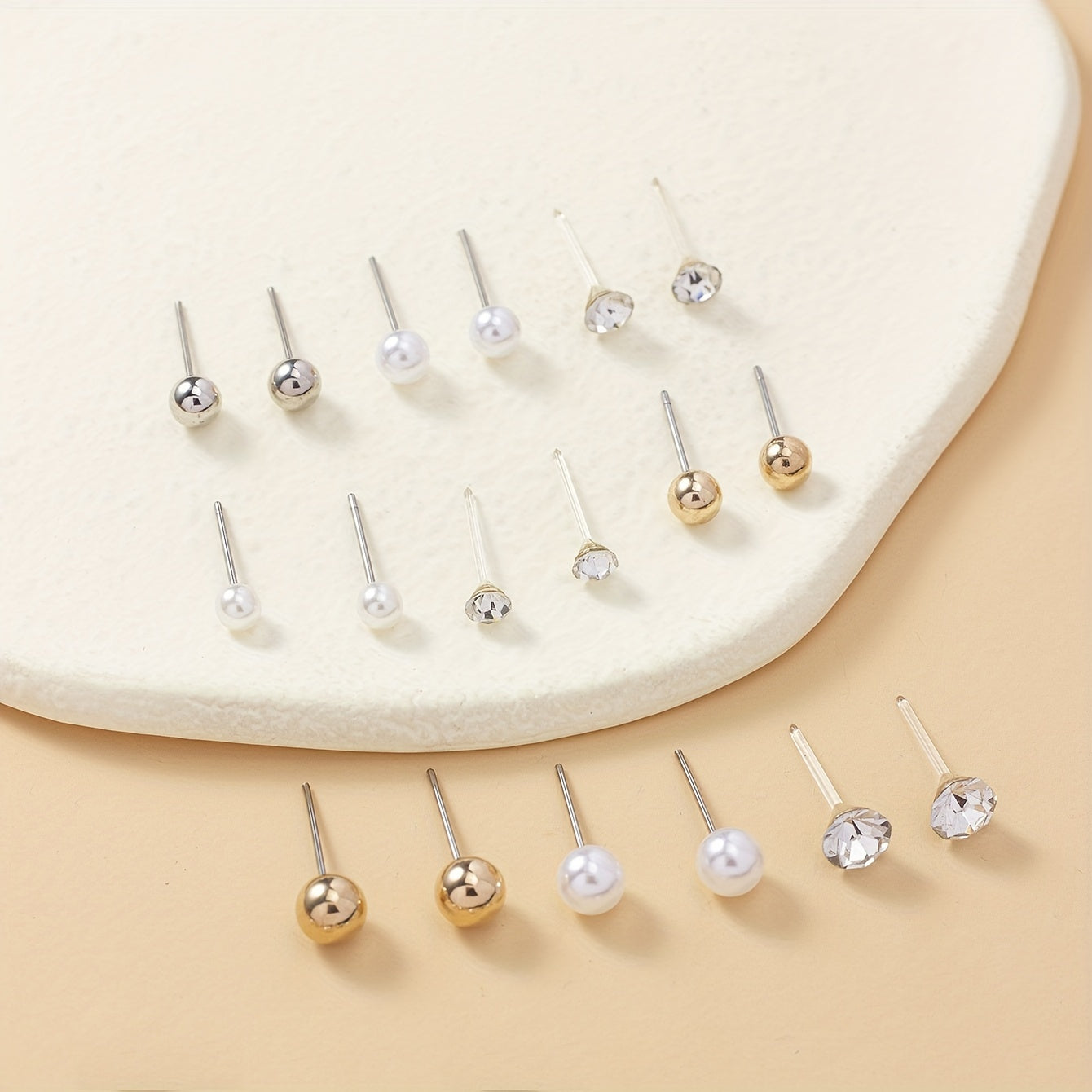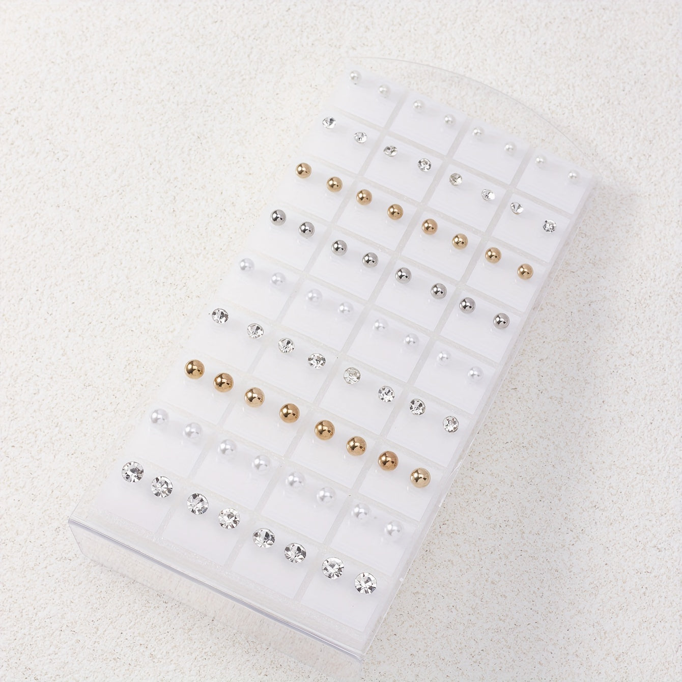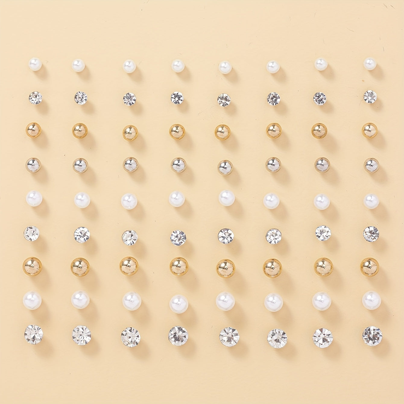 These stud earrings are perfect for adding a touch of elegance to any outfit. The set includes 36 pairs featuring rhinestone and faux pearl beads. Ideal as a gift for women who love minimalist style.