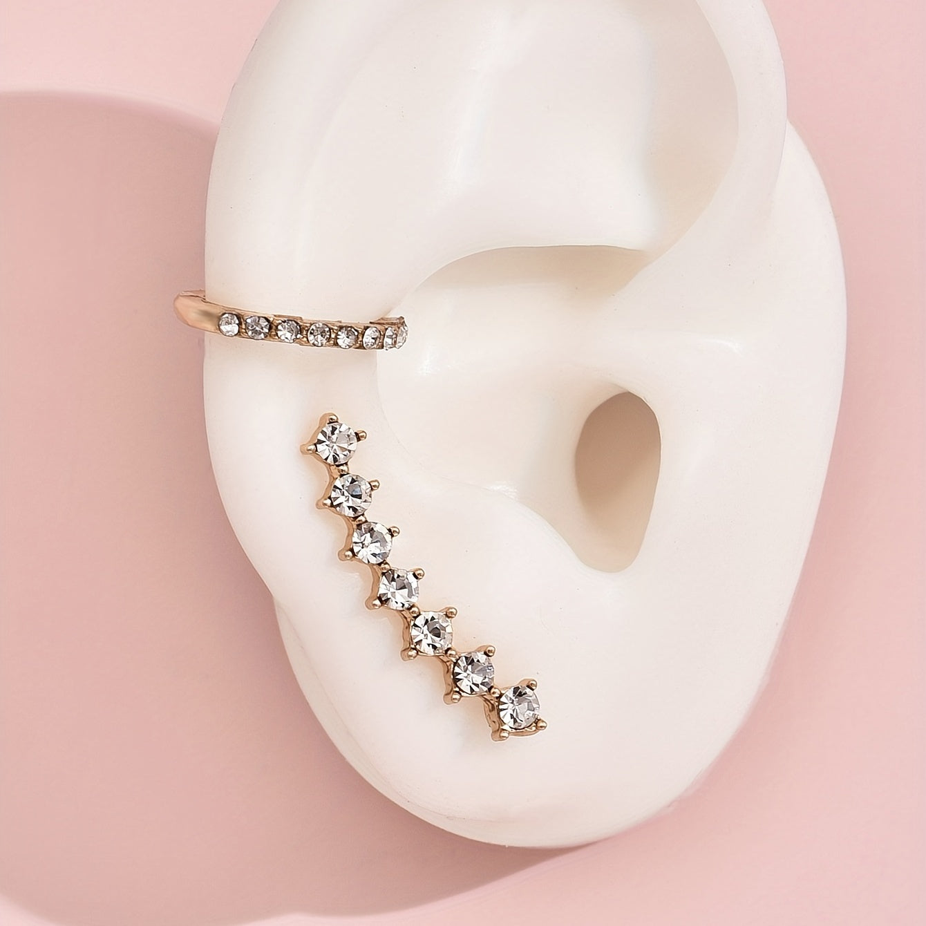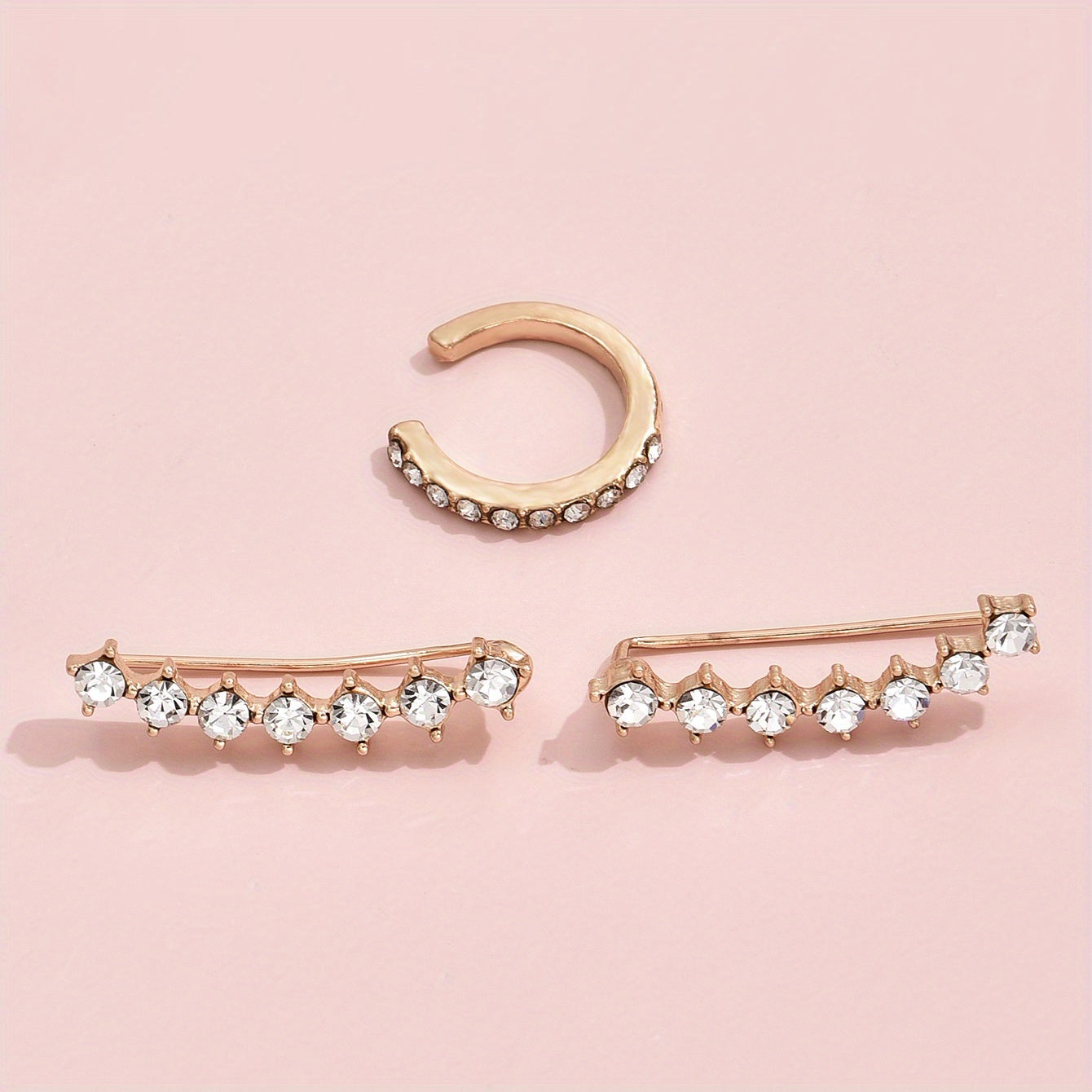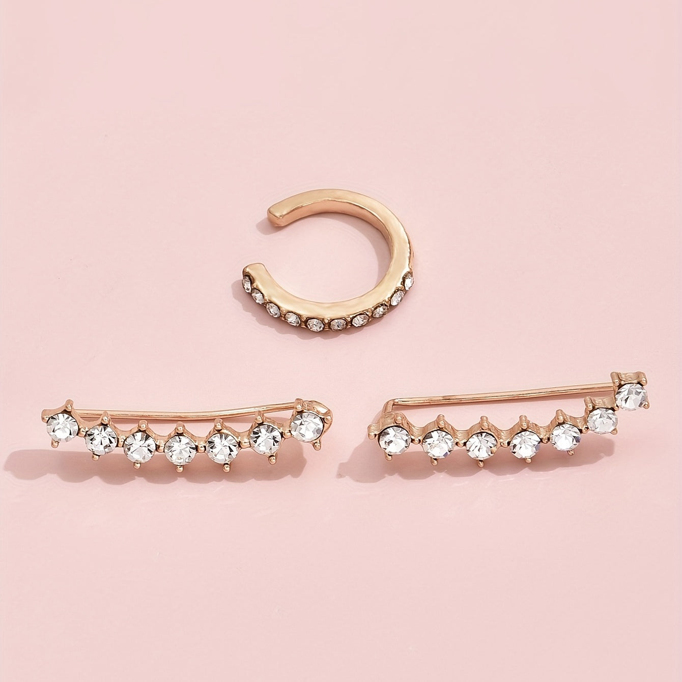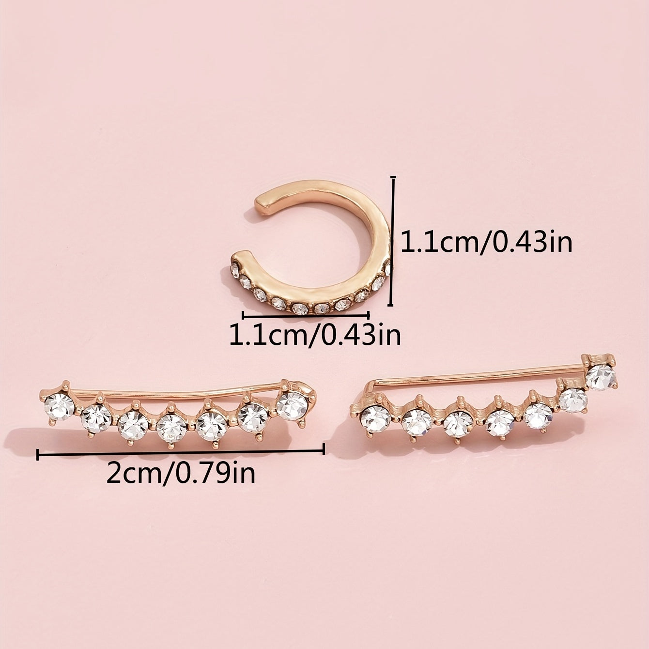 Add a touch of vintage elegance with this set of 3 geometric crystal inlaid stud huggie earrings in a golden tone. Perfect for weddings, parties, and everyday wear.