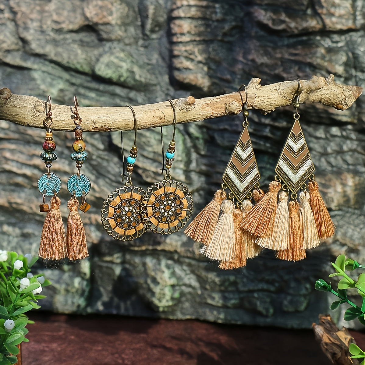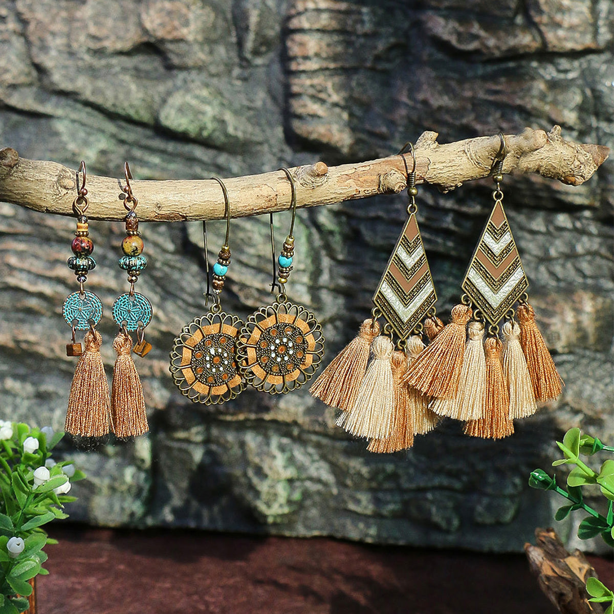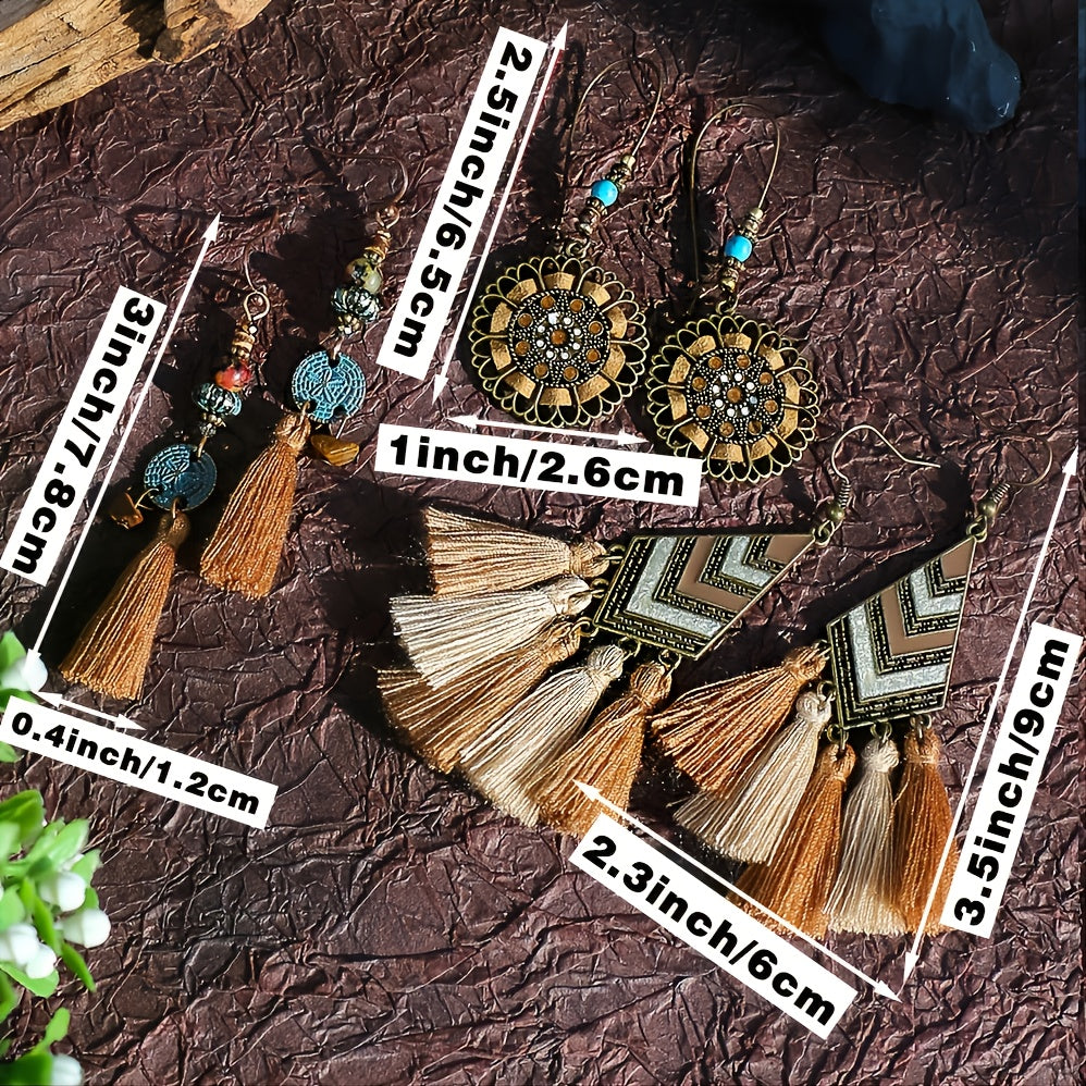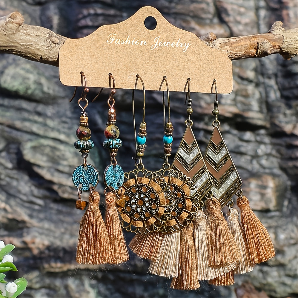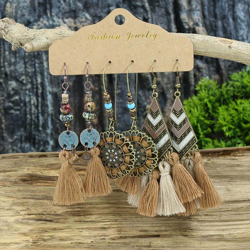 Add a touch of fun to your outfit with these trendy earrings. The set includes three pairs with polka dot and tassel designs.