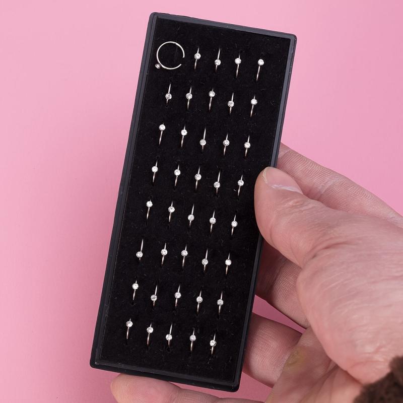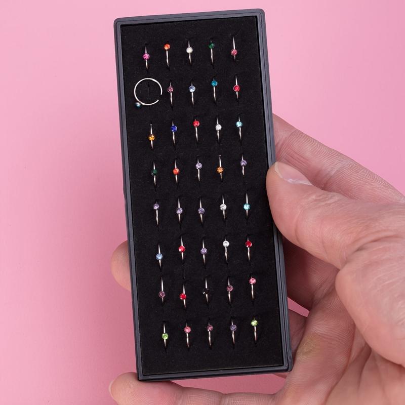 Accessorize your nose with this set of 40 rhinestone nose rings made of stainless steel. Each nose hoop ring measures 8mm and can also be worn as cartilage, tragus, or daith earring jewelry.