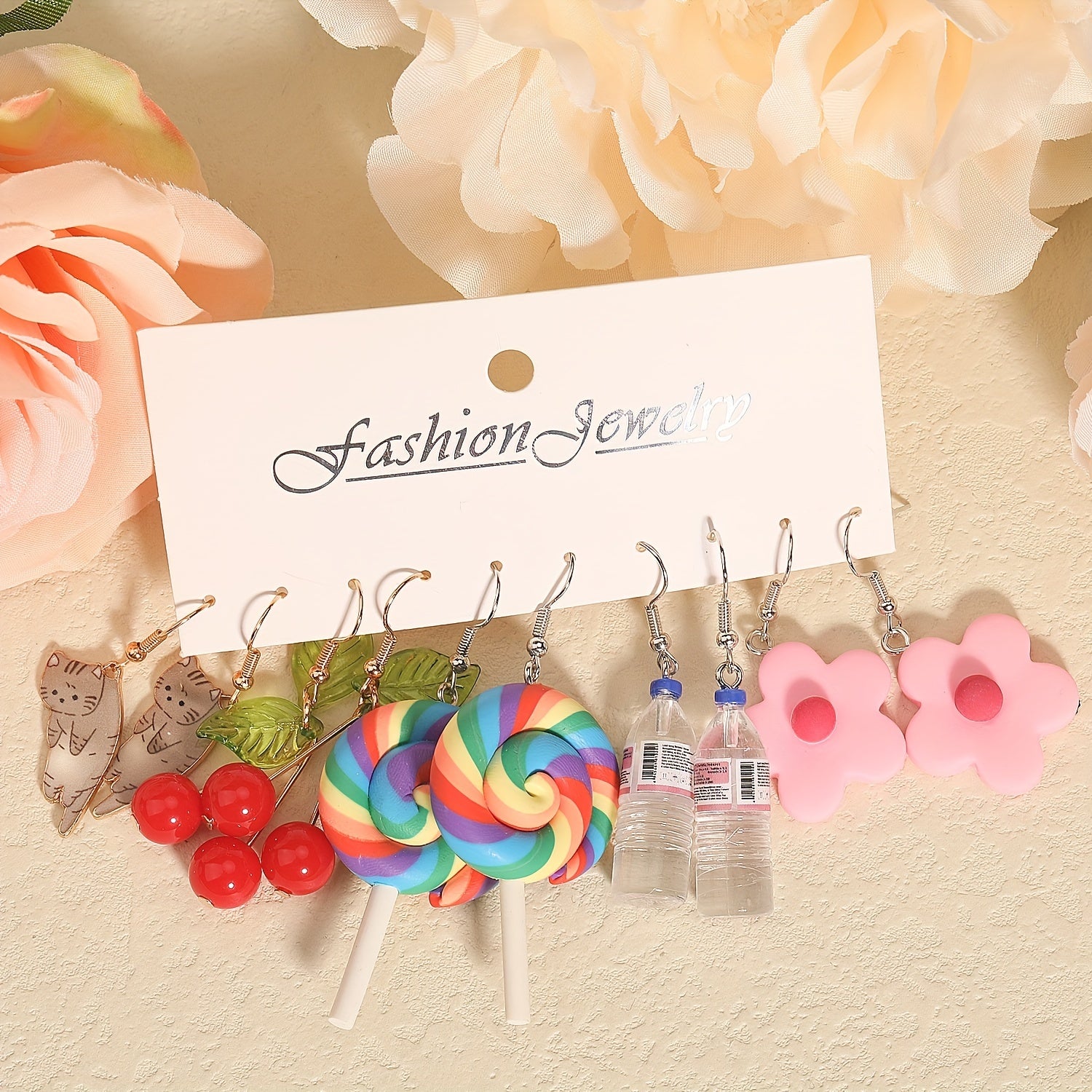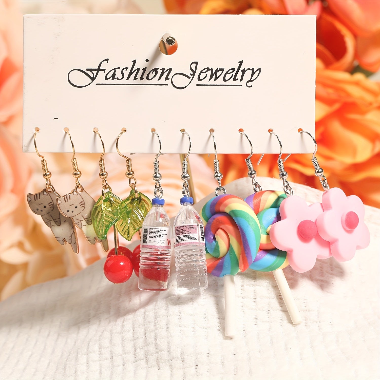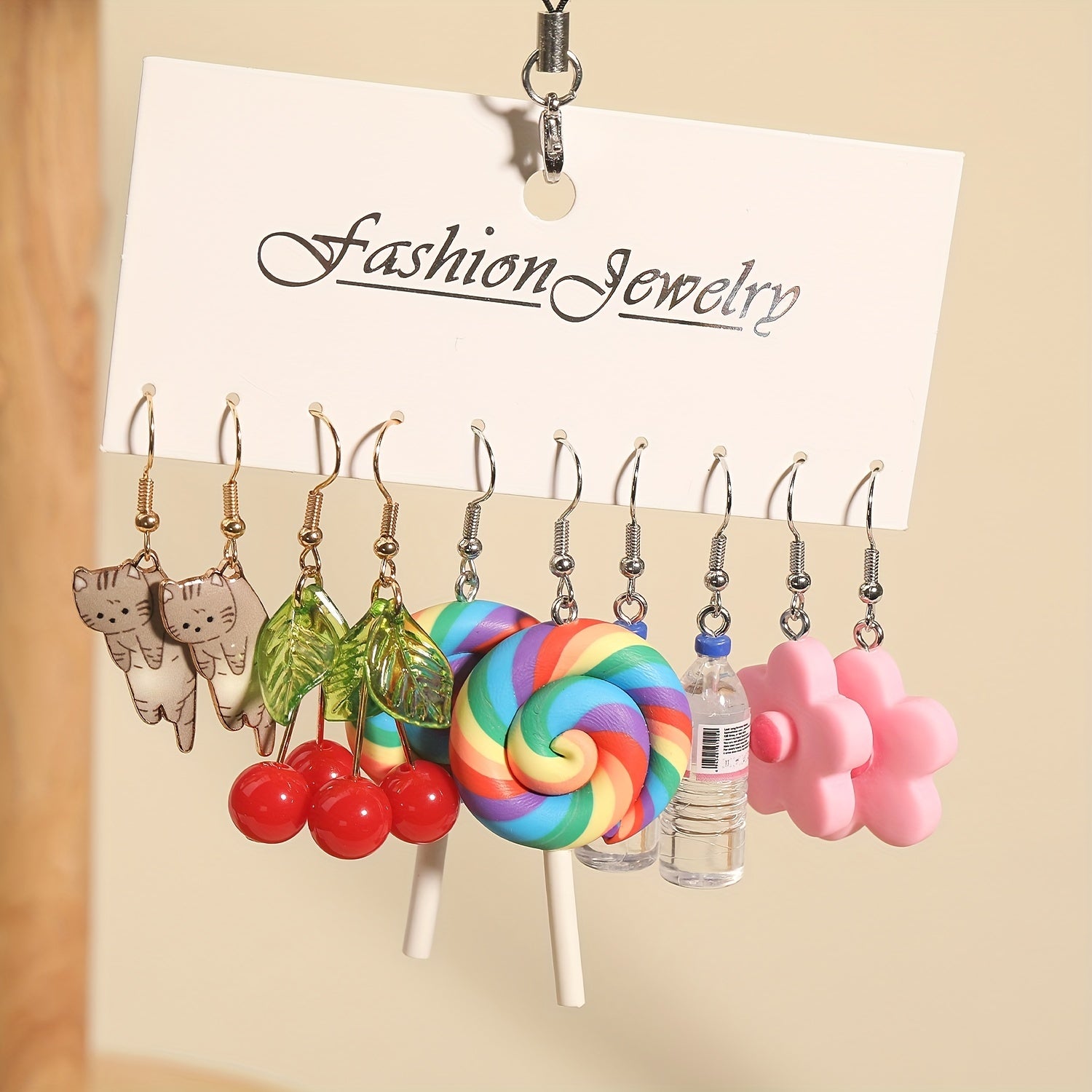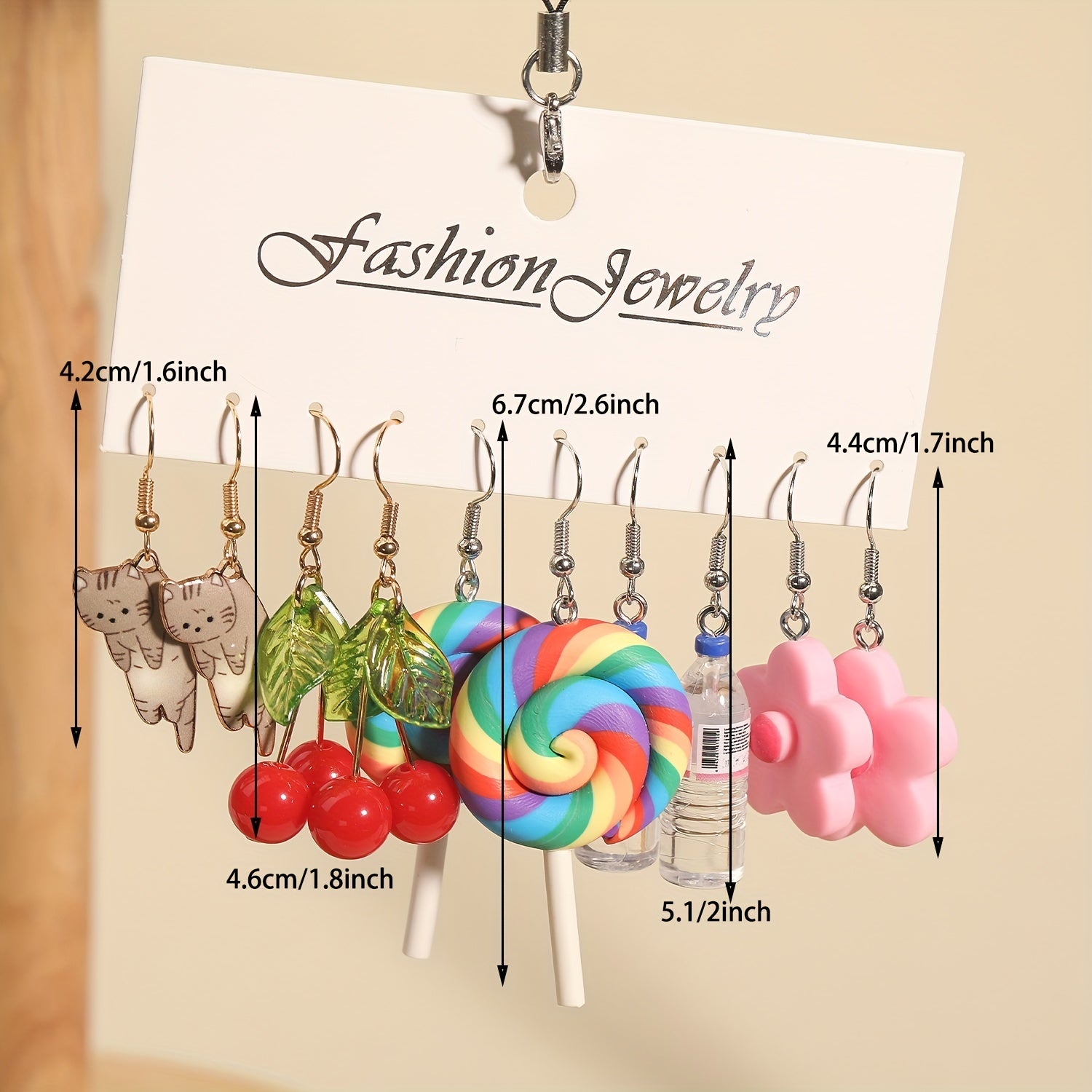 These adorable dangle earrings are perfect for any female as a gift. The set includes cat, cherry, lollipop, water bottle, and flower designs in a fun Y2K style.