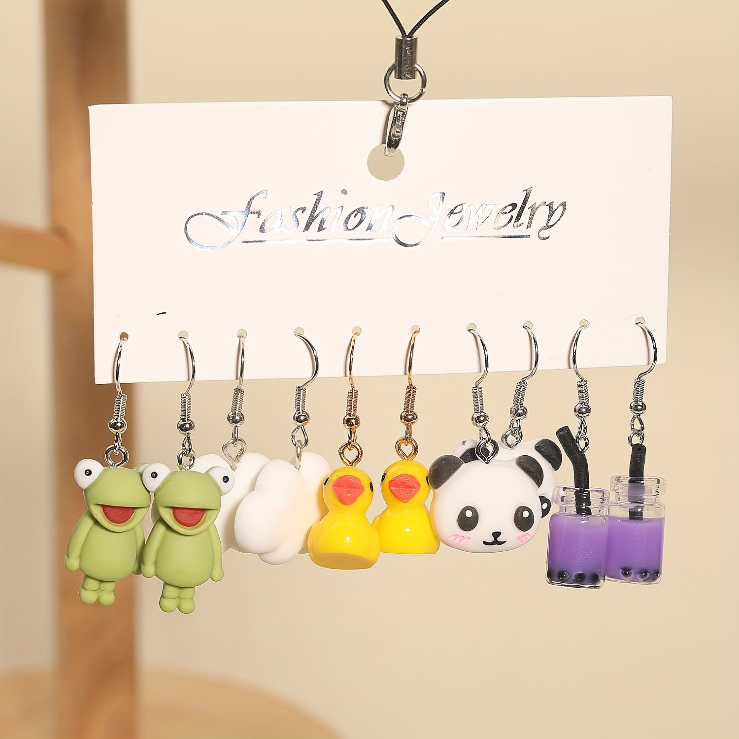 Adorn your ears with this charming set of 5 dangle earrings featuring cute designs like frogs, ducks, clouds, bears, and milk tea. Made of resin, these earrings are perfect for a female gift.