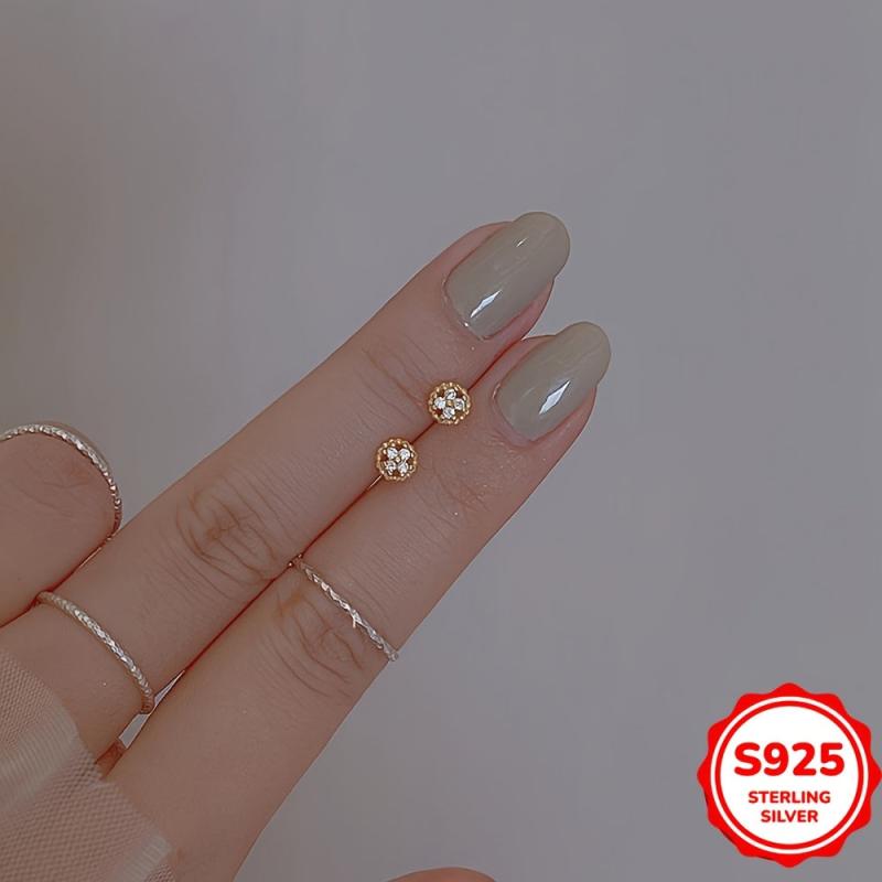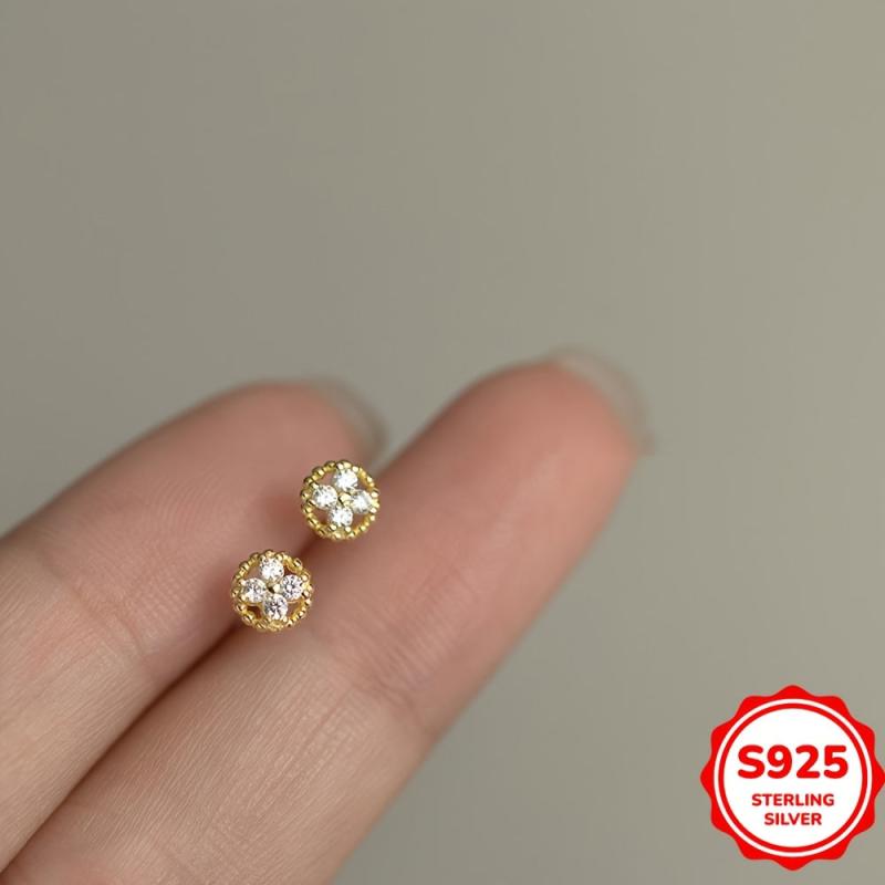Elegant and delicate S925 sterling silver earrings with zircon inlay, featuring a tiny flower shape design. These hollow round four petal flower earrings are perfect for adding a touch of sparkle to any outfit.