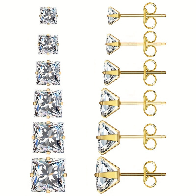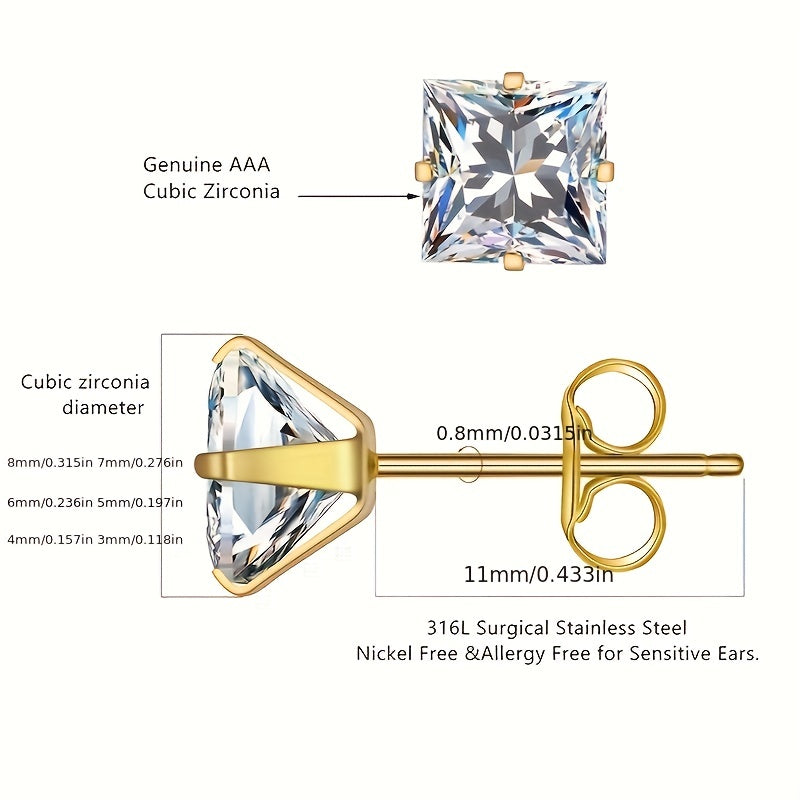 Dress up your style with these 14K plated cubic zirconia stud earrings, perfect for both men and women. Made from hypoallergenic 316L medical stainless steel, these square earrings are a timeless addition to your jewelry collection.
