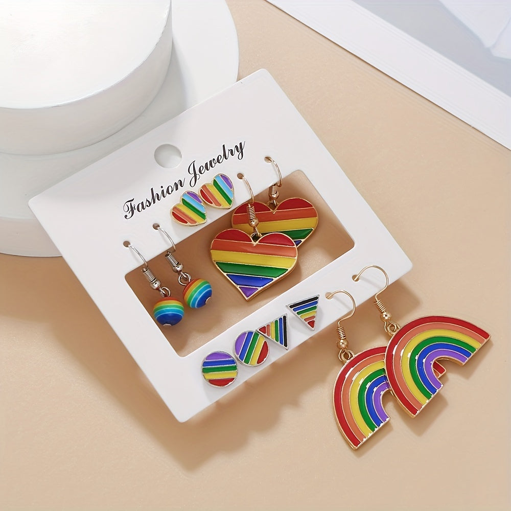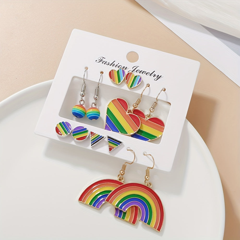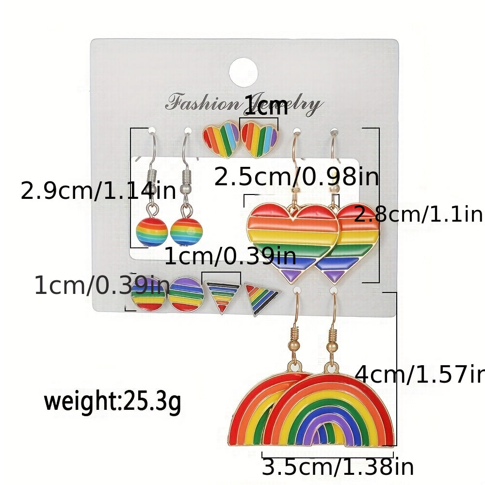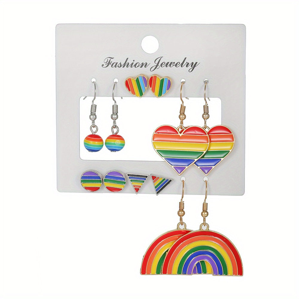 Add a pop of color and style to your look with this set of 6 pairs of rainbow alloy earrings. Featuring heart-shaped studs and dangle earrings, these accessories are perfect for men who want to make a fashion statement.