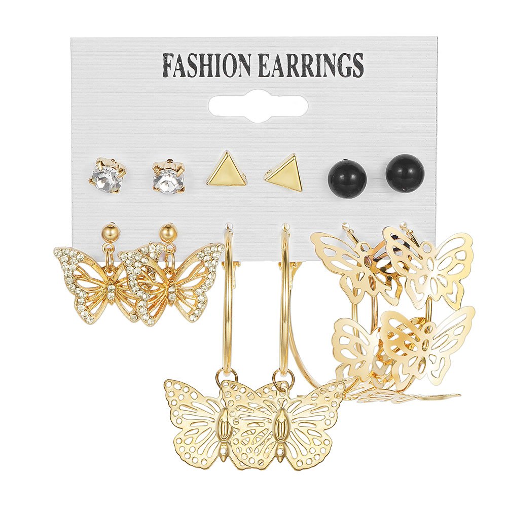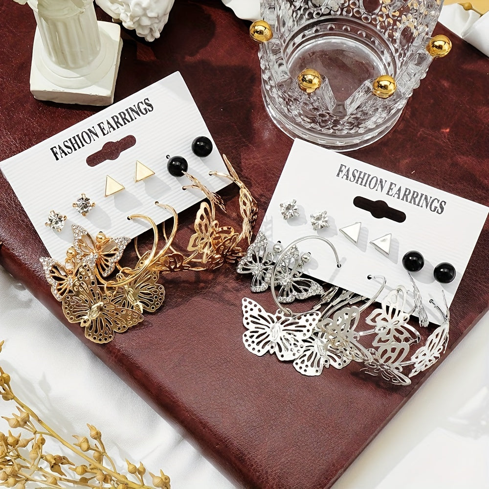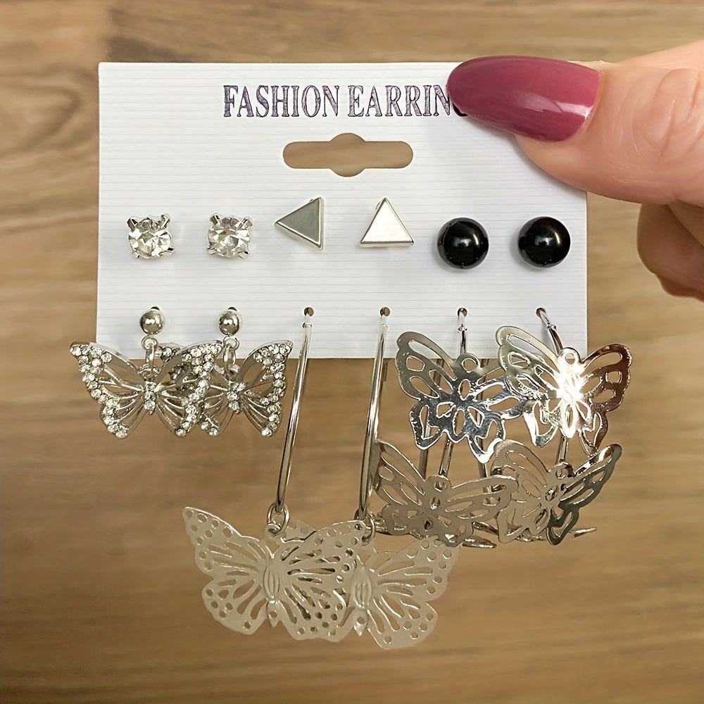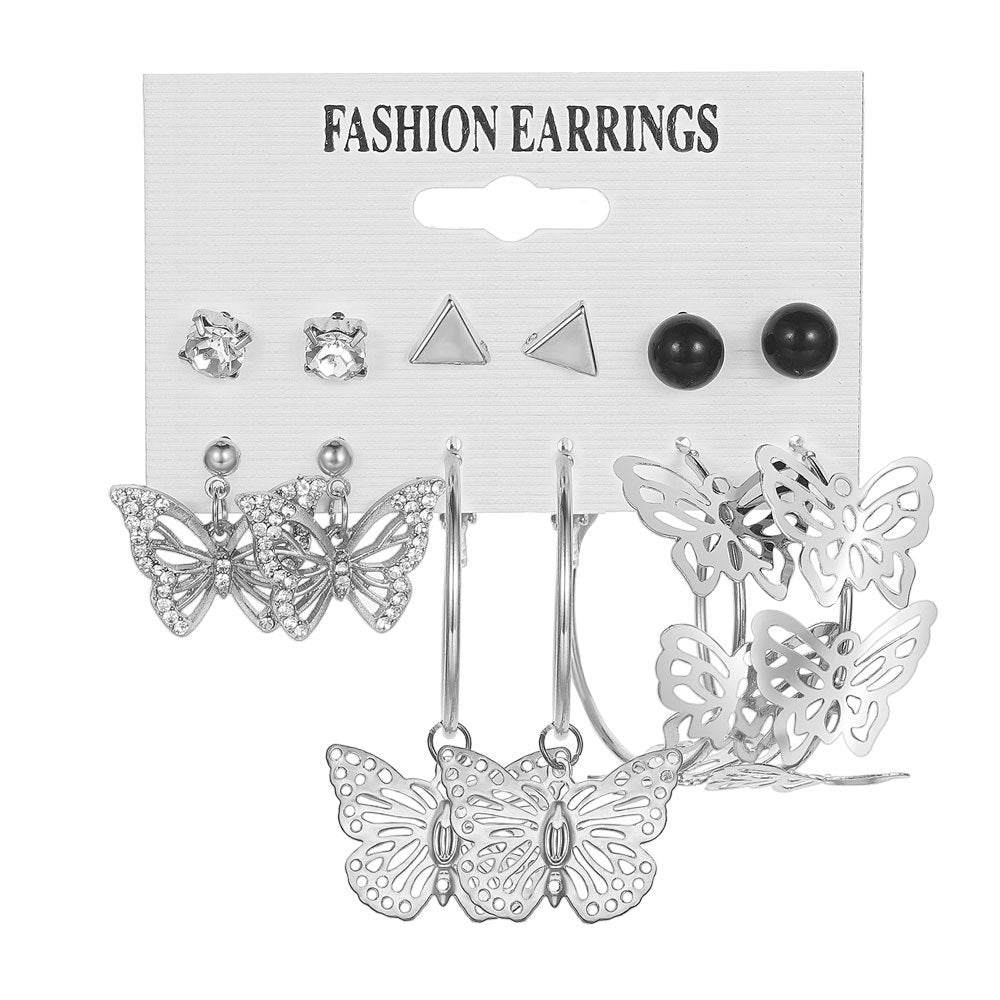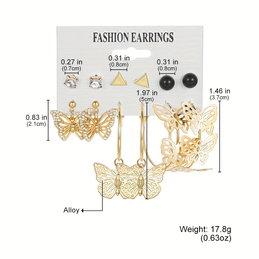 6 Pairs Stud & Hoop Earrings Butterfly Retro Style Alloy Jewelry
