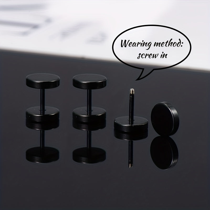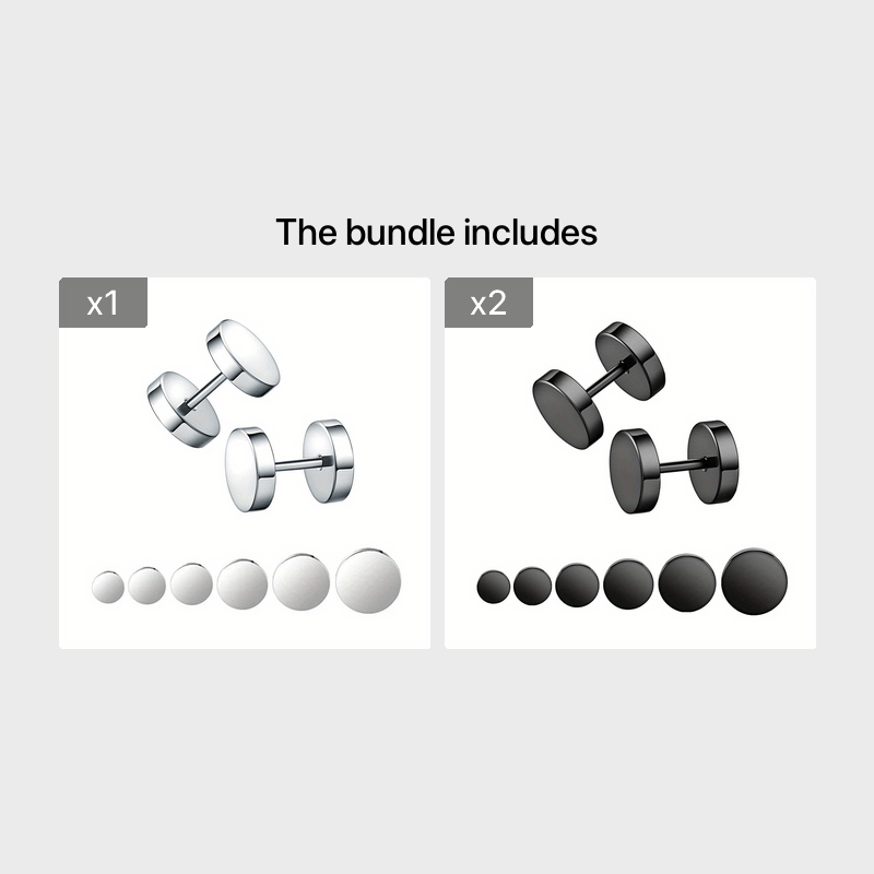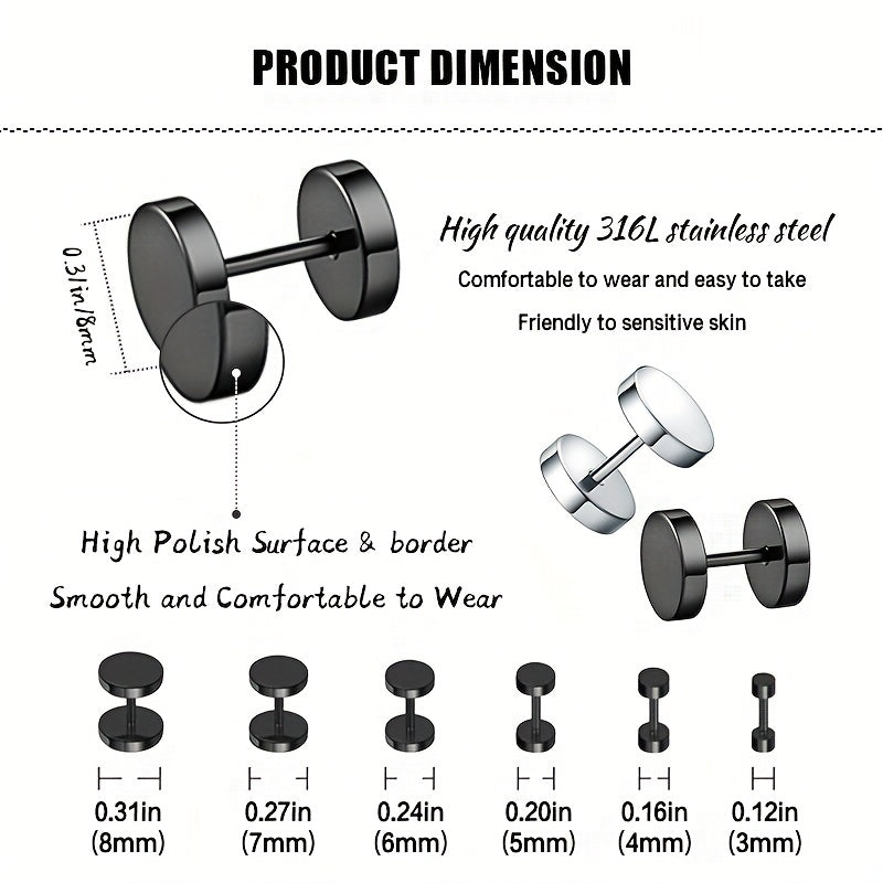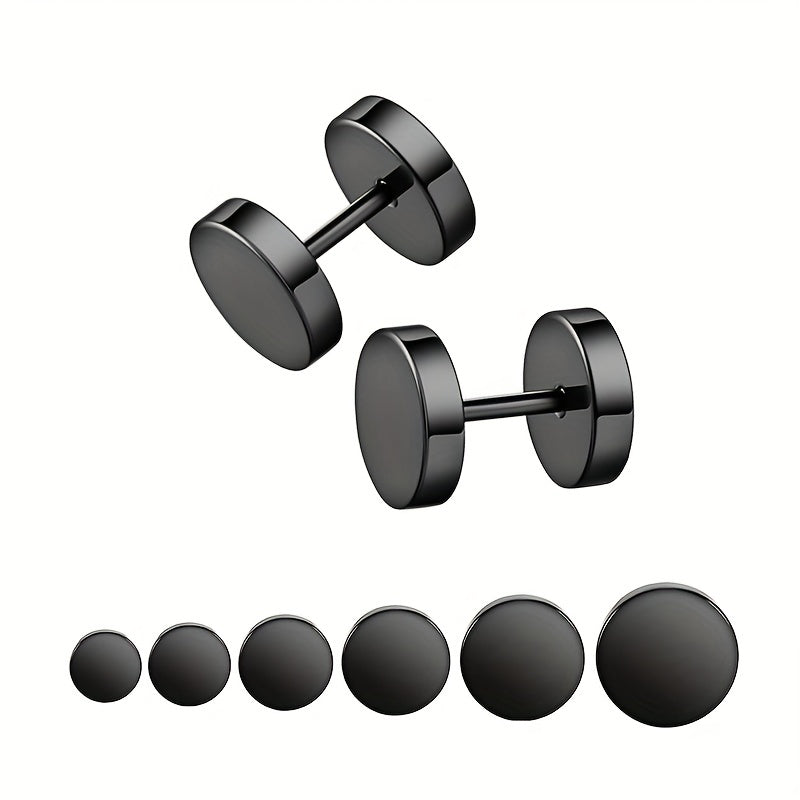 Get this 6 pairs set of stainless steel men's stud earrings that resemble gauges. These earrings are perfect for creating a trendy look with a faux gauge effect. Available in sizes 3mm and 8mm.