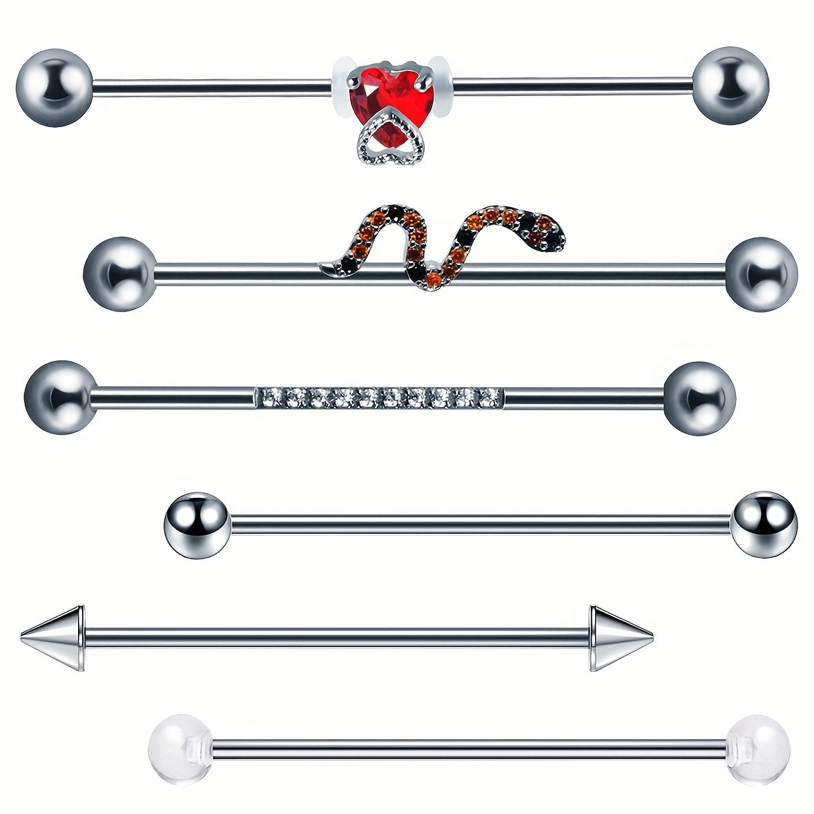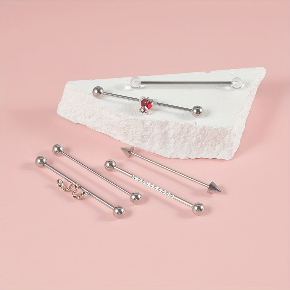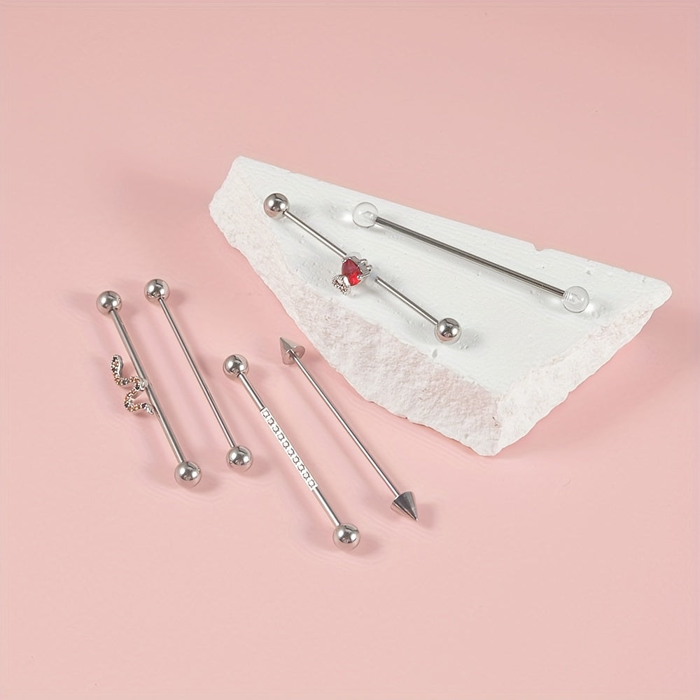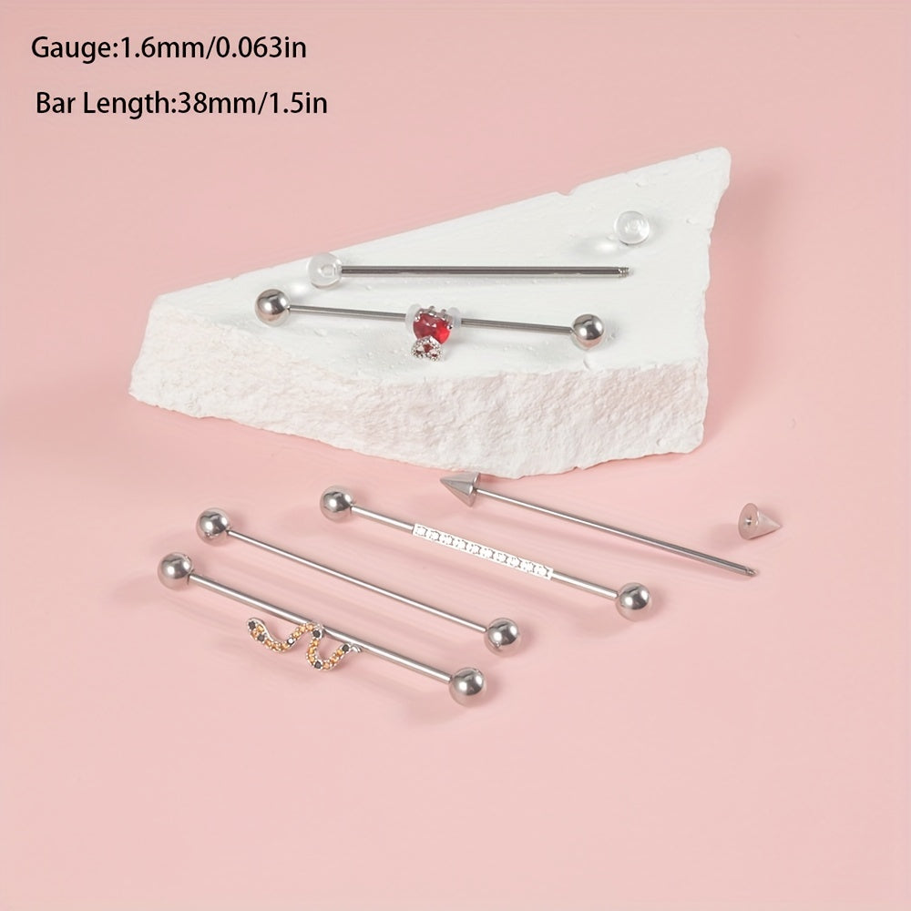 This set includes red heart, snake, and cone designed barbell earrings. They are perfect for cartilage, tragus piercings, and other body jewelry.
