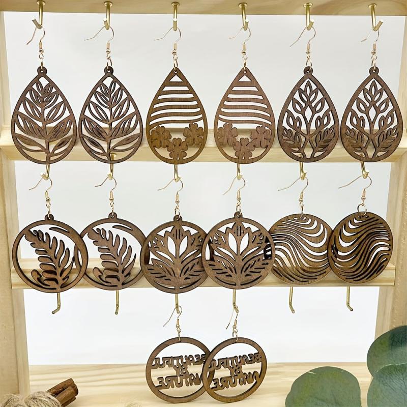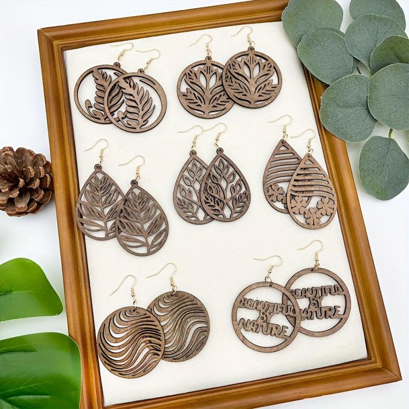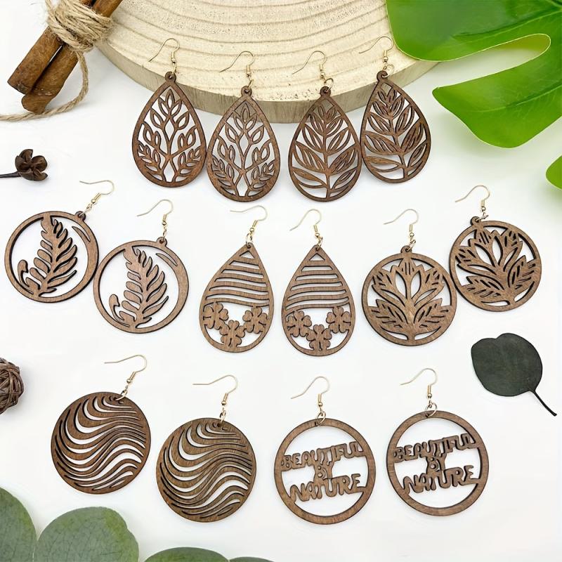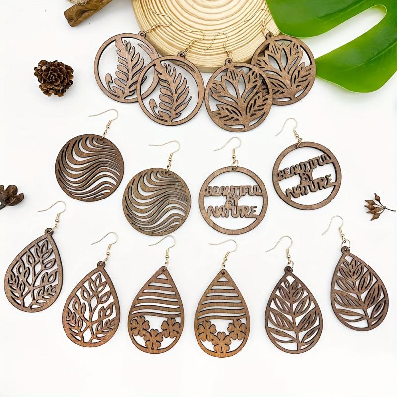 Enhance your style with this set of 7 vintage wooden dangle earrings featuring a hollow leaf and flower design. Perfect for adding a touch of retro charm to your outfits.